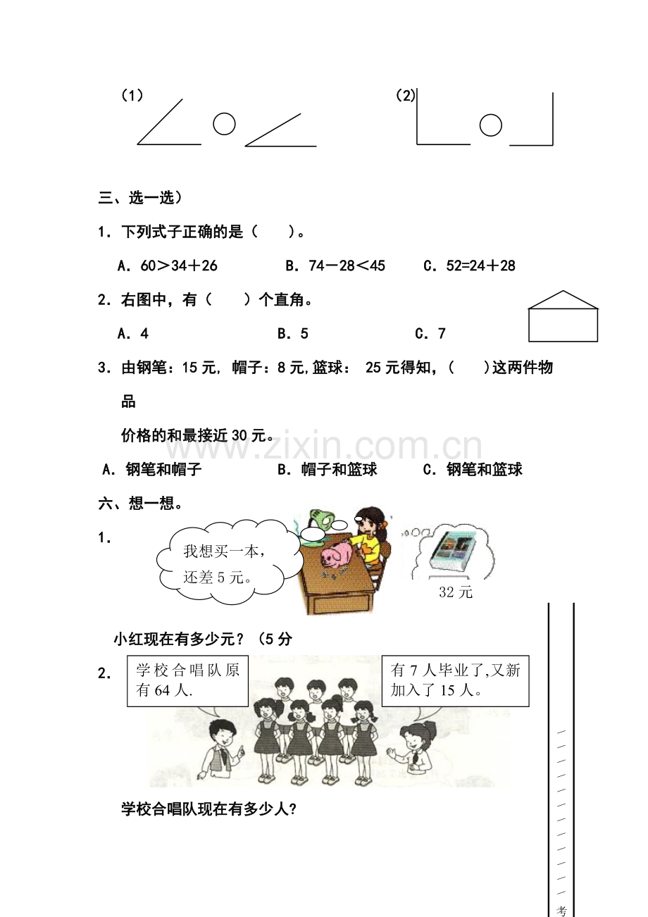 2.下面的图形中,是直角的打“√”,不是直角的打“×”。