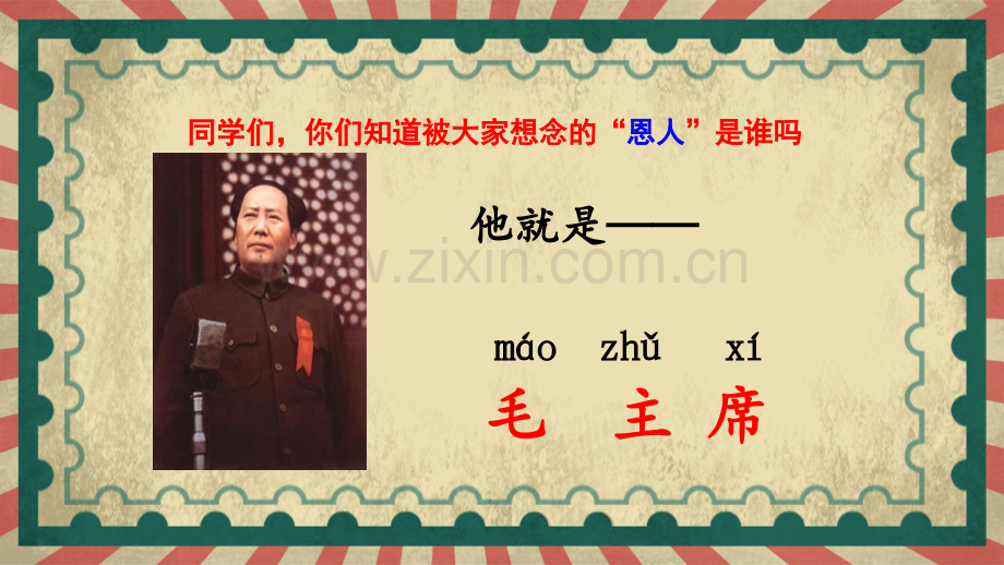 红井水,甜又清,红井水,甜又清,手捧清泉想手捧清泉想恩人恩人。喝上一口红井水,喝上一口红井水,一股暖流涌上心。一股暖流涌上心。qngqngpngpngnnhhgg nunnun读一读读一读 同学们,你们知道被大家想念的同学们,你们知道被大家想念的“恩人恩人”是谁吗是谁吗?mo zh xmo zh x毛毛 主主 席席他就是他就是吃水不忘挖井人吃水不忘挖井人1听课文朗读,标出自然段序号。听课文朗读,标出自然段序号。我会读课文我会读课文wng wng jng jng 忘忘 井井叫叫村村x x qn qn xingxingzhnzhn席席 乡乡主主亲亲 战战cncnjiojio zh zh ch ch 吃吃毛毛momoshsh士士minmin面面我会认我会认 你用什么你用什么好办法记住这好办法记住这些生字的呢?些生字的呢?忘席广广广字头广字头心心心字底心字底我我会认偏旁会认偏旁翘舌音翘舌音后鼻韵母后鼻韵母前鼻韵母前鼻韵母 c cnn q qn n zhzhnn m mi inn 村村 亲亲 战战 面面w wngng j jngng x xi ing ng j ji ingng 忘忘 井井 乡乡 江江 chch zhzh zhzhnn shsh zhzh 吃吃 主主 战战 士士 住住shsh士士 战战士士 士士兵兵tt土土 土土地地 水水土土 土土木木zhzh主主 主人主人 主要主要zhzh住住 住下住下 住在住在 住过住过水井井口水井井口 叫声叫声 叫好叫好乡亲乡亲 亲人亲人 主席主席 主人主人上面上面 面前面前 战士战士 战友战友读一读立刻立刻凉席凉席念书念书时刻时刻救命救命井口井口江江住住没没以以吃吃叫叫主主提示提示:点击生字进入详细讲解。点击生字进入详细讲解。同桌开火车读课文,读准字音,同桌开火车读课文,读准字音,不多字,不少字,不唱读。读完评一不多字,不少字,不唱读。读完评一评。评。我会读课文我会读课文挖井的人是谁挖井的人是谁?吃水的人是谁吃水的人是谁?毛毛主主席席乡乡亲亲们们1 1 吃水不忘挖井人吃水不忘挖井人我读懂了课文我读懂了课文 吃水不忘挖井人吃水不忘挖井人主要主要讲了(讲了()带领()带领()和(和()挖了一口()挖了一口()的事。的事。毛主席毛主席战士战士乡亲们乡亲们井井 瑞金城外有个小村子叫瑞金城外有个小村子叫沙洲坝。毛主席在江西领导沙洲坝。毛主席在江西领导革命的时候,在那儿住过。革命的时候,在那儿住过。x“那儿那儿”指指的是哪儿的是哪儿?“那儿那儿”指的指的是是沙洲坝沙洲坝。读读下面的童谣,感受沙洲坝缺水的环境。读读下面的童谣,感受沙洲坝缺水的环境。沙洲坝,沙洲坝,沙洲坝,沙洲坝,三天不下雨,三天不下雨,无水洗手帕。无水洗手帕。村子里没有井,吃水要到很远村子里没有井,吃水要到很远的地方去挑。毛主席就带领战士和的地方去挑。毛主席就带领战士和乡亲们挖了一口井。乡亲们挖了一口井。为什么要挖井?请用为什么要挖井?请用“”在文中勾出答案。在文中勾出答案。解放以后,乡亲们在井旁边立了解放以后,乡亲们在井旁边立了一块大石碑,上面刻着:一块大石碑,上面刻着:“吃水不忘吃水不忘挖井人,时刻想念毛主席。挖井人,时刻想念毛主席。”井边的石碑上刻着什么?请用井边的石碑上刻着什么?请用“”勾出来。勾出来。吃吃水水不不忘忘挖挖井井人人,时时刻刻想想念念毛毛主主席席。每当人们每当人们 ,就会想起毛主席。,就会想起毛主席。吃吃水水不不忘忘挖挖井井人人,时时刻刻想想念念毛毛主主席席。沙洲坝的乡亲们沙洲坝的乡亲们时刻时刻想念着毛主席。想念着毛主席。(1)时刻时刻 。(2)时刻 。我们要我们要保护树木保护树木鸟妈妈鸟妈妈保护着小鸟保护着小鸟照样子写一写。照样子写一写。(2 2)想念想念 。(1 1)小小方方十分想念十分想念 。我很我很想念想念在北京工作的爸爸。在北京工作的爸爸。以前在老家的朋友乡亲们非常帮他们挖井的毛主席照样子写一写。照样子写一写。书写指导:口字旁的大部分写在左上格。撇的起笔在竖中线右侧。吃吃 ch ch 吃水组词:吃饭 吃肉造句:小朋友们都能自己吃饭了。音序:C C 部首:口结构:左右书写指导:口字旁的大部分写在左上格,最后一笔竖起笔稍高于竖提。叫叫 jio jio 名叫组词:叫作 叫喊造句:小刚被大家叫作小小发明家。音序:J J 部首:口结构:左右书写指导:点在竖中线上,第一横中长,第二横稍短,竖写在竖中线上,最后一横最长。主主 zh zh毛主席组词:主帅 主要造句:课堂上同学们都主动举手回答问题。音序:Z Z 部首:丶结构:独体书写指导:三点水写在左半格,比右边高。“工”的第一横短,最后一横稍长。江江 jing jing江西组词:江河 长江造句:条条江河归大海。音序:J J 部首:氵结构:左右书写指导:左窄右宽,三横等距匀称住住 zh zh住过组词:居住 住手造句:我们居住在这个小区里。音序:Z Z 部首:亻结构:左右书写指导:左右等高。右边第二笔是横折弯,要与横折弯钩相区别。没没 mi mi 没有组词:没有 没用造句:我们口袋里什么都没有。音序:M M 部首:氵结构:左右书写指导:“撇”的起笔最高,穿插到竖中线右边。最后一“点”要低,保持字的平衡。以以 y y以后组词:以前 以后造句:这是很久以前用过的圆形方孔钱。音序:Y Y 部首:人结构:左右第第1 1课时课时第第2 2课时课时第第1 1课时课时灿烂灿烂目不转睛目不转睛 看到这两个词语,你的脑海里会浮现看到这两个词语,你的脑海里会浮现哪些画面?哪些画面?课课题题导导入入日出日出看到看到“日出日出”,你又会想到哪些画面,你又会想到哪些画面?16 1