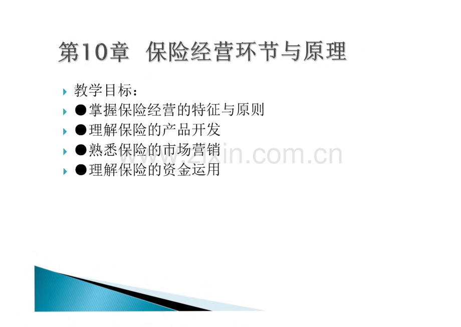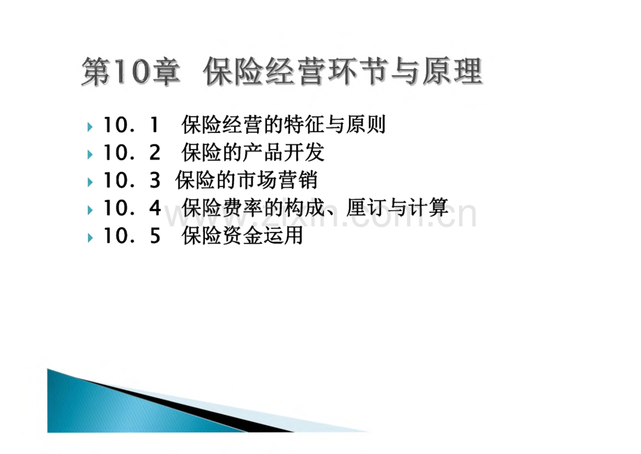 第10章保险经营环节与原理 教学目标:掌握保险经营的特征与原则 理解保险的产品开发 熟悉保险的市场营销 理解保险的资金运用第10章保险经营环节与原理 10.1保险经营的特征与原则 10.2保险的产品开发 10.3保险的市场营销 10.4保险费率的构成、厘订与计算 10.5保险资金运用10.1保险经营的特征与原则 10.1.1保险经营的特征,1.保险经营是提供经济保障服务 2.保险经营资产具有负债性 3.保险经营成本具有不确定性 4.保险经营利润具有特殊性 5.保险投资是保险经营的基石 6.保险经营具有分散性和广泛性110.1.2保险经营的原则 1.风险大量原则 2.风险选择原则 3.风险分散原则10.2保险的产品开发 10.2.1保险产品开发的基本内容 1.保险产品开发的意义(1)保险产品开发是保险公司其他经营活动的基 础(2)保险产品开发是增强保险公司竞争实力的后 盾(3)保险产品开发是推动保险公司技术进步的动 力2.保险产品开发的原则(1)市场需求原则(2)费率科学原则(3)可保利益原则(4)满足竞争原则(5)经营效益原则(6)国际接轨原则(7)合法合规原则10。2。2保险产品开发的主要策略 1.保险产品开发的技术策略(1)创新策略。(2)改进策略。(3)引进策略。(4)更新策略。2.保险产品开发的组合策略 在对现有保险产品进行横向、纵向或交叉组合的基 础上,可开发出适合市场需求的保险新产品。(1)财产险之间的组合。(2)人身险之间的组合。(3)财产险与人身险相组合。3.保险产品开发的组织策略,在开发产品的过程中,如何组织人力、财力、物力 和技术,保险公司需要根据实际情况采取不同的组 织策略。(1)自主开发险种。(2)联合开发险种。4.保险产品开发的时机策略(1)抢先策略(2)跟随策略。(3)拖后策略。10.2.3保险产品开发的通常程序卜各个保险公司的保险产品开发均有自己的特色,但 就其通常程序而言,主要包括下列六个步骤:1.保险市场调查2.可行性的分析 3.保险产品设计 4.保险产品鉴定 5.保险产品报批 6.正式进入市场10.3保险的市场营销 10.3.1保险市场的概述 1.保险市场的含义 保险市场营销学所说的保险市场,就是保险产品潜 在和现实的购买者,即保险市场就是指的保险消费 者市场。2,保险市场的组成,保险市场由潜在市场和现实市场组成。由潜在市场变成现实市场要具备五个必备条件:(1)一定数量的客户;(2)客户要具有投保能力;(3)客户要具有投保资格;(4)客户要有投保愿望;(5)要有投保渠道。10.3.2保险营销的内容 1.保险营销的含义保险营销是在变化的保险市场环境中,旨在满足被 保险人风险保障需要、实现保险企业的经营目标和 为社会安定谋福利而进行的保险商务活动的全过程。它包括保险市场调研、选择目标市场、新险种开发、厘定费率、营销渠道选择、保险商品促销及保后的 一系列服务活动。2.保险营销的作用 保险营销的作用就是:(1)以卓有成效的运行机制,有效地形成保险供给与 需求的平衡,解决保险商品生产与消费的各种分离、差异和矛盾,使得保险商品生产者方面各种不同的 供给与投保人各种不同的需要与欲望相适应,具体 地实现保险生产与消费的统一。(2)满足被保险人的需要,维系个人、家庭和社会生 活的稳定。在满足客户需求的同时,使本公司的经 营利润最大化,企业实现可持续发展。3.保险营销的策略(1)无差异性营销。(2)差异性营销。(3)集中营销。10.4保险费率的构成、厘订与计算 10.4.1保险费率的构成与厘订原则 1.保险费的含义与构成 保险费是保险金额与保险费率的乘积。保险人承保 一笔保险业务,用保险金额乘以保险费率就得出该 笔业务应收取的保险费,即:保险费=保险金额x保险费率 保险费由纯保费和附加保费构成,纯保费是保险人 用于赔付给被保险人或受益人的保险金,它是保险 费的最低界限;附加保费是由保险人所支配的费用,由营业费用、营业税和营业利润构成。2.保险费率的含义与构成卜保险费率是保险费与保险金额的比率。保险费率又 称保险价格,是投保人为取得保险保障而由投保人 向保险人所支付的价金,通常以每百元或每千元的 保险金额的保险费来表示。保险费率一般由纯费率和附加费率两部分组成。习 惯上,将纯费率和附加费率相加所得到的保险费率 森为毛费率。3.厘订保险费率的基本原则(1)充分性原则(2)公平性原则(3)合理性原则(4)稳定灵活原则(5)促进防损原则4.厘订保险费率的一般方法(1)分类法分类法是在按风险的性质分类基础上分别计算费率的方法。依据该方法确定的保险费率常常被载于保险手册中,因此又 称该方法为手册法。分类法的优点在于便于运用,适用费率能够迅速查到。(2)观察法观察法:又称个别法或判断法,是按具体的每一标的分别单 独计算确定费率的方法。该方法费率确定由核保人员依据经 验判断,提出一个费率供双方协商。(3)增减法,增减法:又称修正法,是在分类法的基础上,结合个别标的 的风险状况予以计算确定费率的方法。10.4.2非寿险费率的厘订非寿险费率的厘订步骤通常为:1 确定纯帮率 纯费率保前损失率+(-)均方差(1)计算保额损失率 保额损失率是赔偿金额占保险金额的比率。保额损失率=赔偿金额/保险金额x 1 000%o(2)计算均方差(s)均方差是各保额损失率与平均损失率离差平方和平 均数的平方根。它反映各保额损失率与平均保额损 失率相差的程度。(3)计算稳定系数 稳定系数是均方差与平均保