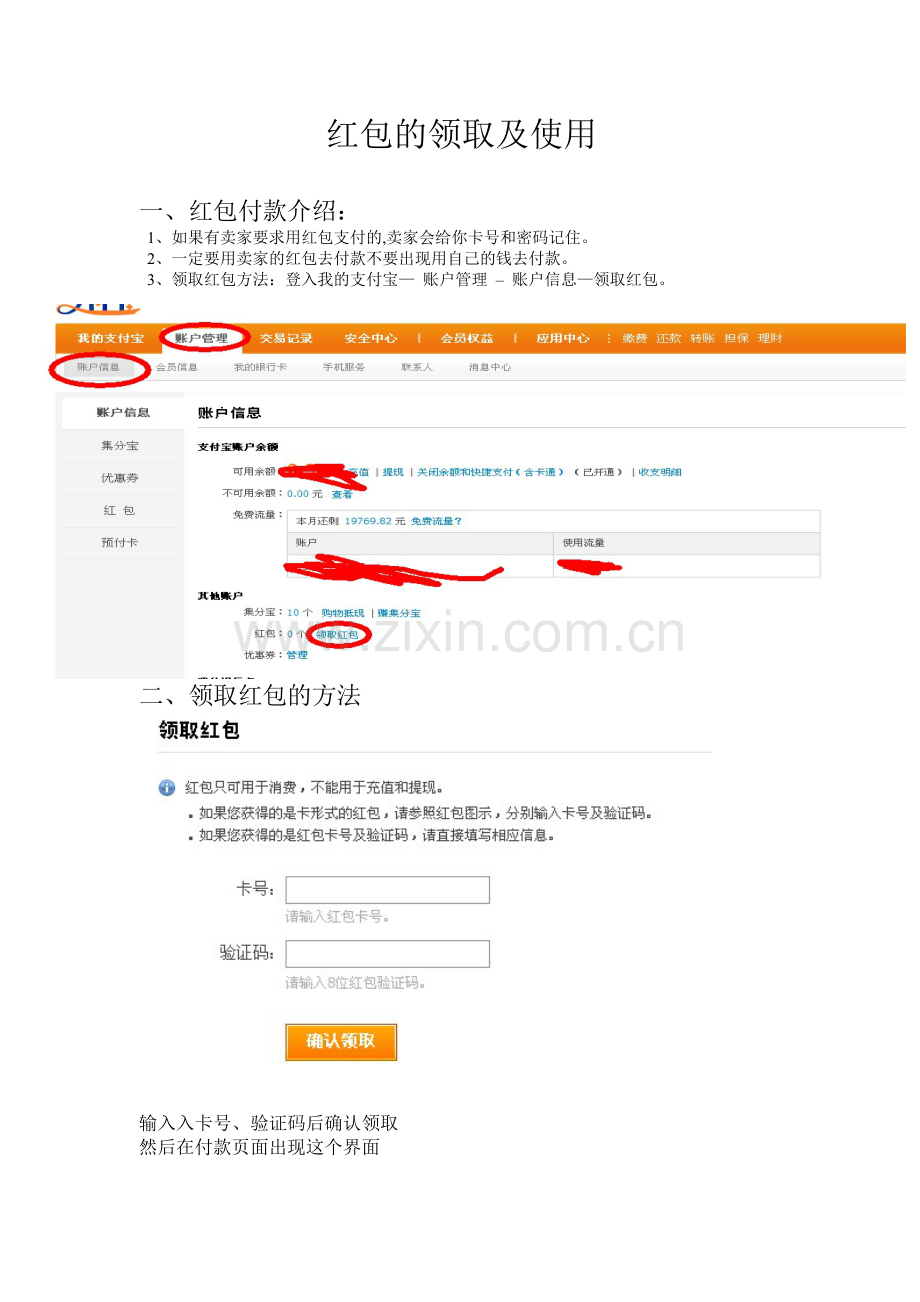 红包的领取及使用 一、红包付款介绍: 1、如果有卖家要求用红包支付的,卖家会给你卡号和密码记住。 2、一定要用卖家的红包去付款不要出现用自己的钱去付款。 3、领取红包方法:登入我的支付宝— 账户管理 – 账户信息—领取红包。 二、领取红包的方法 输入入卡号、验证码后确认领取 然后在付款页面出现这个界面 在下面的红包/预付卡的前面打钩 然后输入支付宝支付密码就可以了 NEWS报道 http:// B1f810XTtoj6