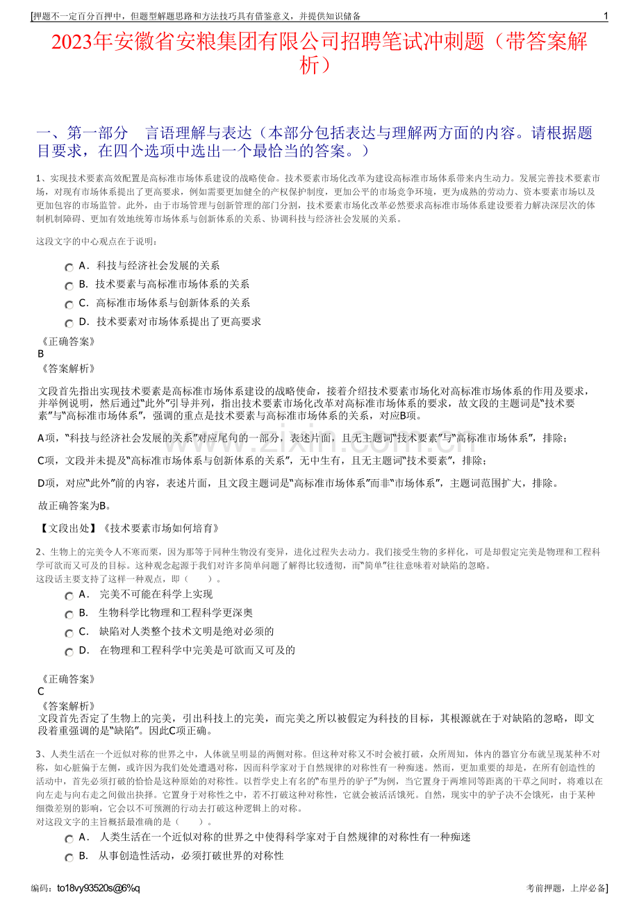 2023年安徽省安粮集团有限公司招聘笔试冲刺题(带答案解析)一、第一部分言语理解与表达(本部分包括表达与理解两方面的内容。请根据题目要求,在四个选项中选出一个最恰当的答案。)1、实现技术要素高效配置是高标准市场体系建设的战略使命。技术要素市场化改革为建设高标准市场体系带来内生动力。发展完善技术要素市场,对现有市场体系提出了更高要求,例如需要更加健全的产权保护制度,更加公平的市场竞争环境,更为成熟的劳动力、资本要素市场以及更加包容的市场监管。此外,由于市场管理与创新管理的部门分割,技术要素市场化改革必然要求高标准市场体系建设要着力解决深层次的体制机制障碍、更加有效地统筹市场体系与创新体系的关系、协调科技与经济社会发展的关系。这段文字的中心观点在于说明:A科技与经济社会发展的关系 B技术要素与高标准市场体系的关系 C高标准市场体系与创新体系的关系 D技术要素对市场体系提出了更高要求正确答案B答案解析文段首先指出实现技术要素是高标准市场体系建设的战略使命,接着介绍技术要素市场化对高标准市场体系的作用及要求,并举例说明,然后通过“此外”引导并列,指出技术要素市场化改革对高标准市场体系的要求,故文段的主题词是“技术要素”与“高标准市场体系”,强调的重点是技术要素与高标准市场体系的关系,对应B项。A项,“科技与经济社会发展的关系”对应尾句的一部分,表述片面,且无主题词“技术要素”与“高标准市场体系”,排除;C项,文段并未提及“高标准市场体系与创新体系的关系”,无中生有,且无主题词“技术要素”,排除;D项,对应“此外”前的内容,表述片面,且文段主题词是“高标准市场体系”而非“市场体系”,主题词范围扩大,排除。故正确答案为B。【文段出处】技术要素市场如何培育2、生物上的完美令人不寒而栗,因为那等于同种生物没有变异,进化过程失去动力。我们接受生物的多样化,可是却假定完美是物理和工程科学可欲而又可及的目标。这种观念起源于我们对许多简单问题了解得比较透彻,而“简单”往往意味着对缺陷的忽略。这段话主要支持了这样一种观点,即()。A 完美不可能在科学上实现 B 生物科学比物理和工程科学更深奥 C 缺陷对人类整个技术文明是绝对必须的 D 在物理和工程科学中完美是可欲而又可及的正确答案C答案解析文段首先否定了生物上的完美,引出科技上的完美,而完美之所以被假定为科技的目标,其根源就在于对缺陷的忽略,即文段着重强调的是“缺陷”。因此C项正确。3、人类生活在一个近似对称的世界之中,人体就呈明显的两侧对称。但这种对称又不时会被打破,众所周知,体内的器官分布就呈现某种不对称,如心脏偏于左侧,或许因为我们处处遭遇对称,因而科学家对于自然规律的对称性有一种痴迷。然而,更加重要的却是,在所有创造性的活动中,首先必须打破的恰恰是这种原始的对称性。以哲学史上有名的“布里丹的驴子”为例,当它置身于两堆同等距离的干草之间时,将难以在向左走与向右走之间做出抉择。它置身于对称性之中,若不打破这种对称性,它就会被活活饿死。自然,现实中的驴子决不会饿死,由于某种细微差别的影响,它会以不可预测的行动去打破这种逻辑上的对称。对这段文字的主旨概括最准确的是()。A 人类生活在一个近似对称的世界之中使得科学家对于自然规律的对称性有一种痴迷 B 从事创造性活动,必须打破世界的对称性押题不一定百分百押中,但题型解题思路和方法技巧具有借鉴意义,并提供知识储备1编码:to18vy93520s6%q考前押题,上岸必备 C 现实的对称不同于逻辑的对称 D 打破原始的对称性是从事创造性活动的首要条件正确答案D答案解析转折后是重点,由“然而,更加重要的却是”可知,“在所有创造性的活动中,首先必须打破的恰恰是这种原始的对称性”是文段的主旨句,之后是举例说明。因此D项正确。4、红树林的地下部分长期处于厌氧环境,减缓了根系和凋落物的分解速率,加速了碳埋藏速率。此外,红树林大多分布于沉积型海岸河口,由上游河流和海洋潮汐共同作用带来的大量外源性碳,被它们固定并快速沉积下来。这“”的组合拳使得红树林成为海岸带蓝碳碳汇的主要贡献者。填入画横线部分最恰当的一项是:A取长补短 B标本兼治 C开源节流 D一举两得正确答案C答案解析根据“减缓了根系和凋落物的分解速率,加速了碳埋藏速率”及“此外由上游河流和海洋潮汐共同作用带来的大量外源性碳,被它们固定并快速沉积下来”可知,横线处体现红树林两方面的作用和好处,且双引号引导形象化表达。C项“开源节流”比喻在财政经济上增加收入,节省开支,置于此处,“开源”可以对应红树林固定并沉积外源性碳,“节流”对应“减缓了根系和凋落物的分解速率”,符合文意,当选。A项“取长补短”表示在同类事物中吸取这个的长处来弥补那个的短处,文段并未涉及两者的“长处”与“短处”,与文意不符,排除;B项“标本兼治”指对事物的枝节和根本都加以治理,文段并未涉及“枝节”和“根本”,与文意不符,排除;D项“一举两得”意为做一件事得到两方面的好处,文段的结论仅提及“成为海岸带蓝碳碳汇的主要贡献者”这一个结果,并未体现出两方面的好处,与文意不符,排除。故正确答