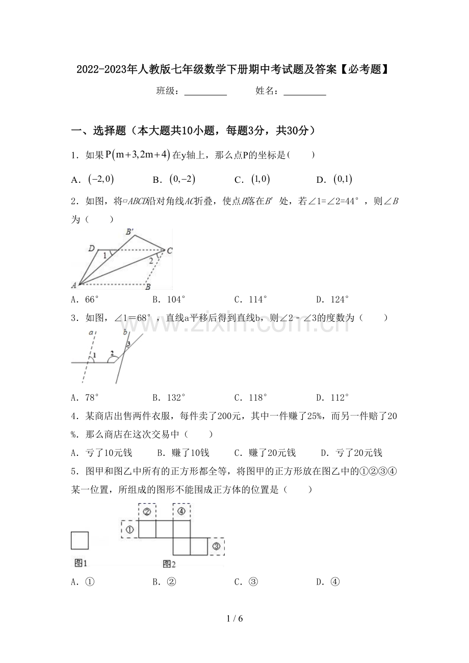 2022-2023年人教版七年级数学下册期中考试题及答案【必考题】