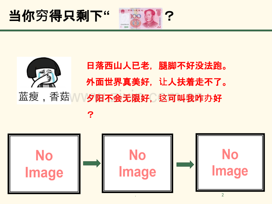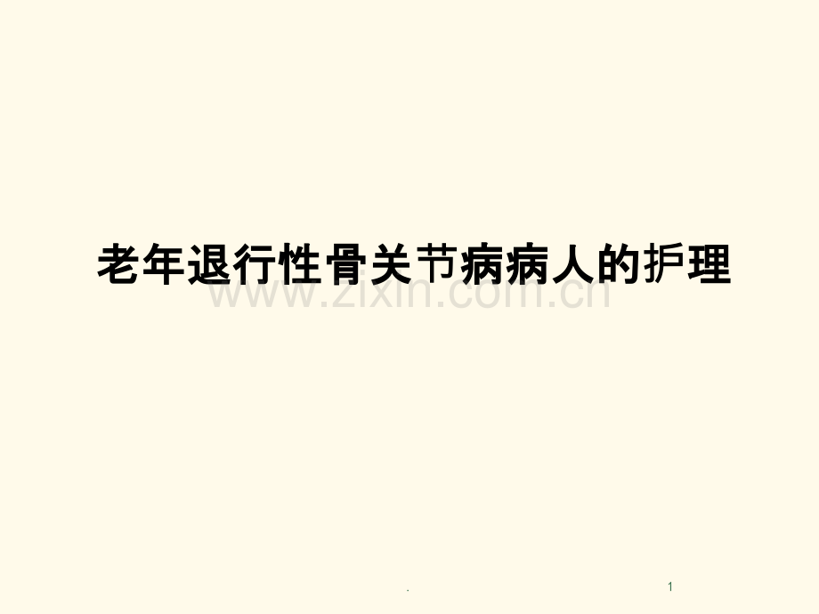 老年退行性骨关老年退行性骨关节病病人的病病人的护理理1.当你当你穷得只剩下得只剩下“”?日落西山人已老,腿脚不好没法跑。日落西山人已老,腿脚不好没法跑。外面世界真美好,外面世界真美好,让人扶着走不了。人扶着走不了。夕阳不会无限好,夕阳不会无限好,这可叫我咋可叫我咋办好好?2.这个毛病叫做骨性关个毛病叫做骨性关节炎,又称炎,又称退行性骨关退行性骨关节病病。老年人常。老年人常见,尤其是,尤其是老年老年妇女女。膝关膝关节骨性关骨性关节炎是骨关炎是骨关节炎中炎中发病率最高的一种。病率最高的一种。关关节软骨骨发生退行性生退行性变关关节软骨完整骨完整性破坏以及关性破坏以及关节边缘软骨下骨板病骨下骨板病变慢性慢性退行性关退行性关节疾病疾病3.为何老年何老年妇女多女多发?1、激素水平激素水平:肌肉骨骼的消:肌肉骨骼的消耗:女性大于男性,同耗:女性大于男性,同时,雌,雌激素在激素在绝经后也会后也会骤然下降并然下降并衰退,骨关衰退,骨关节也会因此迅速衰也会因此迅速衰退。退。2、生活生活习惯:女性喜:女性喜爱穿高穿高跟鞋、光腿穿靴子、穿短裙等,跟鞋、光腿穿靴子、穿短裙等,哪怕在气温偏低的冬季也是如哪怕在气温偏低的冬季也是如此。此。4.哪些原因易加速膝关哪些原因易加速膝关节“退行性改退行性改变”?1.肥胖肥胖:体重:体重过大易大易导致膝致膝关关节负重增加。重增加。2.外外伤:导致致局部骨局部骨质、软组织平衡遭到平衡遭到破坏,使关破坏,使关节原有运原有运动轨迹、迹、接触面接触面发生病生病变,从而加速,从而加速关关节磨磨损。3.错误的运的运动方式方式:喜好攀:喜好攀岩、登山、徒岩、登山、徒步、自行步、自行车等等运运动。4.职业:从事:从事重体力重体力劳动者者(如:(如:农民工、民工、搬运工等)搬运工等)5.僵痛僵痛肿畸障畸障+内卡内卡压现象象u关关节疼痛:休息可疼痛:休息可缓解,上下楼梯最明解,上下楼梯最明显,呈,呈钝痛或刺痛痛或刺痛u关关节僵硬:晨起关僵硬:晨起关节有僵硬感,有僵硬感,时间30分分钟u关关节内卡内卡压现象:象:关关节内有小的游离骨片,表内有小的游离骨片,表现为关关节疼疼痛、活痛、活动时有响声和不能屈伸。有响声和不能屈伸。u关关节功能障碍功能障碍u关关节肿胀、畸形、畸形:Heberden结节、Bouchard结节临床表床表现:6.关关节畸形:畸形:u指尖关指尖关节背面内、外背面内、外侧骨骨样肿大,位大,位于于远端指尖称端指尖称“Heberden结节”u位于近端指尖称位于近端指尖称“Bouchard结节”7.鉴别点 退行性骨关节炎 类风湿性关节炎本本质关关节老化退老化退变自身免疫性疾病自身免疫性疾病病病变组织软骨骨滑膜滑膜症状症状内内侧关关节疼痛疼痛、肿胀、晨僵(晨僵(30min)、)、关关节变形形腿部腿部O型腿多、型腿多、X型腿少型腿少O型腿少、型腿少、X型腿多型腿多疼痛部位疼痛部位负重关重关节手足小关手足小关节实验检查正常正常类风湿因子(湿因子(+)8.辅助助检查1.X线平片:平片:典型表典型表现(1)受累关)受累关节间隙狭窄隙狭窄(2)软骨下骨骨下骨质硬化及囊性硬化及囊性变(3)关)关节边缘骨骨赘形成形成(4)关)关节内游离骨片内游离骨片2.CT:用于椎:用于椎间盘病病检查3.MRI:发现早早期期软骨骨病病变,观察察半半月月板板、韧带等等关关节结构的异常构的异常4.实验室室检查:血血细胞胞沉沉降降率率、血血象象均均无无异异常常变化化,热凝凝集集试验(+)。9.治治疗:减减轻症状,改善关症状,改善关节功能,减少致残功能,减少致残早期(保守治疗):1.急性急性发作期限制关作期限制关节活活动2.保持保持积极情极情绪3.减少减少负重运重运动、适当、适当锻炼4.药物治物治疗:非甾体非甾体类抗炎抗炎药、中中药散散剂和外和外热敷敷剂晚期(手术治疗):1.人工膝关人工膝关节置置换适适应证:症状:症状严重,关重,关节畸形,保守治畸形,保守治疗无效者无效者2.膝关膝关节镜下有限清除下有限清除术10.中中药散散剂和外和外热敷敷剂【1】口服中药散:药用用伸筋草伸筋草90g,威灵仙威灵仙90g,川川牛膝牛膝60g,血竭血竭45g,制乳香制乳香45g,制没制没药45g,制制马钱子子35g,白花白花蛇蛇5条条,肉桂肉桂45g。上上药共研成共研成细末末,装装瓶瓶备用。用。用法:用法:1日日2次次,每次口服每次口服3g,黄酒黄酒2两两为引。引。外用药:骨骨碎碎补30g,川椒川椒30g,透骨草透骨草30g,木瓜木瓜30g,防防风30g,续断断30g,没没药30g,乳香乳香30g,白芷白芷30g,红花花30g,羌活羌活30g,当当归30g,食食盐60g。研研末末+食醋食醋2两两+内蒸内蒸15min。用法:用法:交替交替热敷敷1020次后,次后,将将药末末阴干次日阴干次日再用再用,1剂药可可连用用5天。天。11.人工关人工关节置置换术:关关节表面置表面置换不是把骨不是把骨头都拿掉,只是把关都拿掉,只是把关节表面表面不光滑的部位覆盖一不光滑的部位覆盖一层光滑的人工关光滑的人工关节面,就像是装修面,就像是装修墙面面贴一一层墙纸,或者化,或者化妆打的一打的一层粉底。粉底。12.人工关人工关节置置换术后后护理理 一、一、预防下肢静脉血栓的防下肢静脉血栓的发生生二、二、积极康复治极康复治疗三、三、术后后疼痛疼痛、肿胀、麻木等、麻木等四、复四、复查:膝