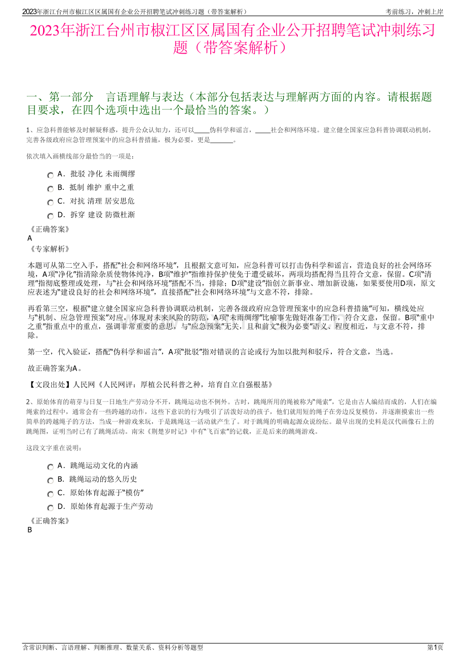 2023年浙江台州市椒江区区属国有企业公开招聘笔试冲刺练习题(带答案解析)一、第一部分言语理解与表达(本部分包括表达与理解两方面的内容。请根据题目要求,在四个选项中选出一个最恰当的答案。)1、应急科普能够及时解疑释惑,提升公众认知力,还可以 伪科学和谣言,社会和网络环境。建立健全国家应急科普协调联动机制,完善各级政府应急管理预案中的应急科普措施,极为必要,更是 。依次填入画横线部分最恰当的一项是:A批驳 净化 未雨绸缪 B抵制 维护 重中之重 C对抗 清理 居安思危 D拆穿 建设 防微杜渐正确答案A专家解析本题可从第二空入手,搭配“社会和网络环境”,且根据文意可知,应急科普可以打击伪科学和谣言,营造良好的社会网络环境,A项“净化”指清除杂质使物体纯净,B项“维护”指维持保护使免于遭受破坏,两项均搭配得当且符合文意,保留。C项“清理”指彻底整理或处理,与“社会和网络环境”搭配不当,排除;D项“建设”指创立新事业、增加新设施,如果要使用D项,原文应表述为“建设良好的社会和网络环境”,直接搭配“社会和网络环境”与文意不符,排除。再看第三空,根据“建立健全国家应急科普协调联动机制,完善各级政府应急管理预案中的应急科普措施”可知,横线处应与“机制、应急管理预案”对应,体现对未来风险的防范,A项“未雨绸缪”比喻事先做好准备工作,符合文意,保留。B项“重中之重”指重点中的重点,强调非常重要的意思,与“应急预案”无关,且和前文“极为必要”语义、程度相近,与文意不符,排除。第一空,代入验证,搭配“伪科学和谣言”,A项“批驳”指对错误的言论或行为加以批判和驳斥,符合文意,当选。故正确答案为A。【文段出处】人民网人民网评:厚植公民科普之种,培育自立自强根基2、原始体育的萌芽与日复一日地生产劳动分不开,跳绳运动也不例外。古时,跳绳所用的绳被称为“绳索”,它是由古人编结而成的,人们在编绳索的过程中,通常会有一些跨越的动作,这些下意识的行为吸引了活泼好动的孩子,他们就用短的绳子在旁边反复模仿,并逐渐摸索出一些简单的跨越绳子的方法,当成一种游戏来玩,于是跳绳这一活动就产生了。对于跳绳的明确起源众说纷纭。最早出现的史料是汉代画像石上的跳绳图,证明当时已有了跳绳活动。南宋荆楚岁时记中有“飞百索”的记载,正是后来的跳绳游戏。这段文字重在说明:A跳绳运动文化的内涵 B跳绳运动的悠久历史 C原始体育起源于“模仿”D原始体育起源于生产劳动正确答案B2023年浙江台州市椒江区区属国有企业公开招聘笔试冲刺练习题(带答案解析)考前练习,冲刺上岸含常识判断、言语理解、判断推理、数量关系、资料分析等题型第1页专家解析文段开篇引出“跳绳”这一话题,接着介绍了跳绳所用的绳是如何制作的,以及孩子们模仿并逐步发展从而产生跳绳这一活动的过程,然后具体介绍了跳绳的起源,尾句指出荆楚岁时记中记载的“飞百索”正是后来的跳绳游戏。故文段主题词为“跳绳”,通过介绍跳绳活动的产生过程以及起源来说明跳绳运动具有悠久的历史,对应B项。A项,“文化的内涵”文段未提及,无中生有,排除;C、D两项,均缺少文段主题词“跳绳”,偏离文段核心话题,排除。故正确答案为B。【文段出处】跳绳真的是“最完美的健康运动”吗?3、中国人对于梅花普遍怀有一种特殊的爱恋之情。应该说,没有哪一种花像梅花这样享受着众口一词的好评。其实,就梅的形象看,若是在花中“选美”,她是无论如何难当花魁的。那薄如蝉翼的花瓣,稀疏的花蕊,淡淡的清香,在众香国里,绝对难以招人耳目。历览前贤崇尚梅的缘由,加之几次充当梅客的感悟,我想,千百年来,梅之所以让人欣赏、赞誉、咏叹,多半是源于她的品格。因此,“品逸如梅”常常被用作是对一个人品行的赞誉抑或是自励的标准。宋代林和靖老先生生性奇俊,超凡脱俗,终生不愿做官,也不娶妻生子,一直在杭州孤山过着隐居生活,平生植梅放鹤,人称“梅妻鹤子”,也历来被传为佳话。对这段文字的主旨概括最准确的是()。A 梅的品格向来为国人所推崇 B 国人对梅花普遍怀有爱恋之情 C 梅获得国人的好评是因其具有坚贞不屈的品格 D 如梅的超凡脱俗的生活历来为国人向往正确答案A专家解析由表示总结的“因此”可知,其后是文章的主旨:“品逸如梅常常被用作是对一个人品行的赞誉抑或是自励的标准”,也即梅的品格为人们所肯定和向往。因此A项正确。4、?这是党史观的重大问题。一个马克思主义政党对自己的错误所抱的态度,是衡量这个党是否真正履行对人民群众所负责任的一个最重要最可靠的尺度。我们党对自己包括领袖人物的失误和错误历来采取郑重的态度,一是敢于承认,二是正确分析,三是坚决纠正,从而使失误和错误连同党的成功经验一起成为宝贵的历史教材。填入画横线部分最恰当的一项是:A如何对待逆耳忠言 B如何看待曲折、失误 C是否始终坚持实事求是 D犯了错误后能否正确应对正确答案B专家解析横线出现在开头,需要对后文进行全面概括。根据“这是党史观的重大问题”可知,横线处需填入一个表示“问题”的句子,后文先通过“最重要”“最可靠”两个程度词强调“马克思主义政党”面对自己错误的态度很重要。接着详细解释了我们党在面对失误和错误时采