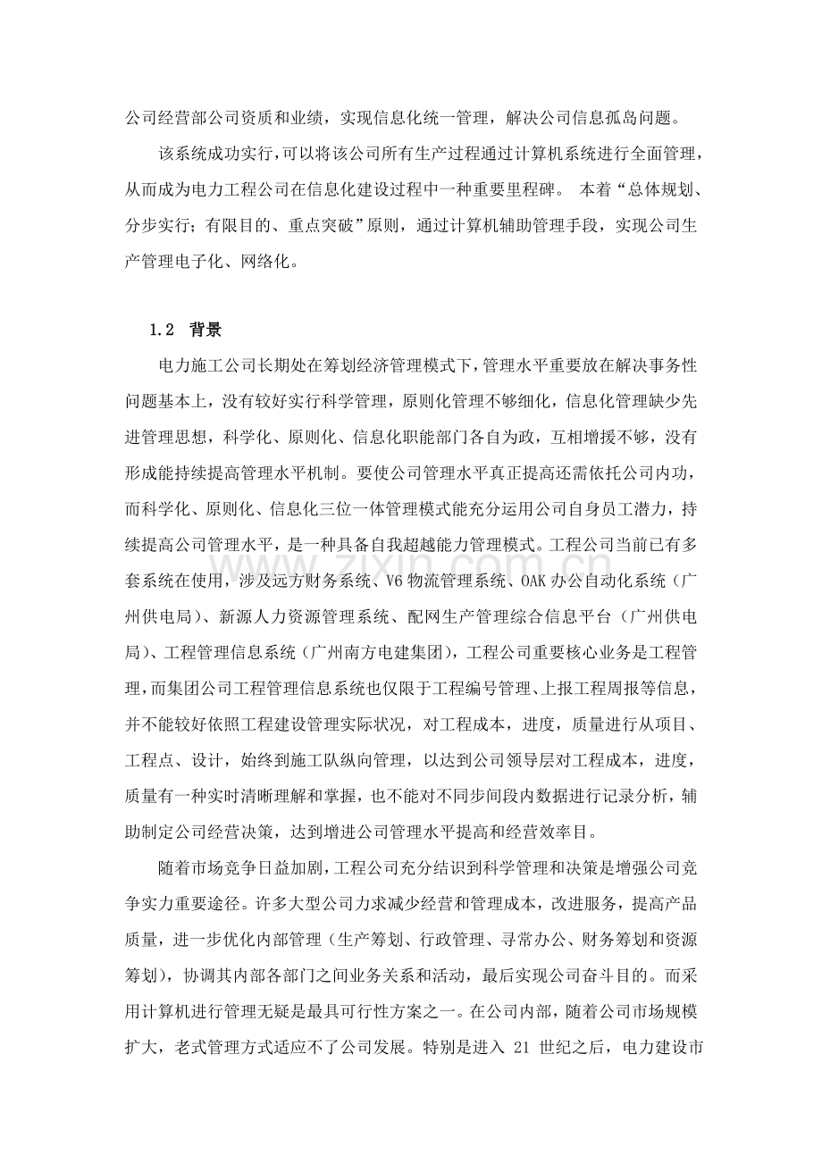 随着市场竞争日益加剧,工程公司充分结识到科学管理和决策是增强公司竞争实力重要途径。许多大型公司力求减少经营和管理成本,改进服务,提高产品质量,进一步优化内部管理(生产筹划、行政管理、寻常办公、财务筹划和资源筹划),协调其内部各部门之间业务关系和活动,最后实现公司奋斗目的。而采用计算机进行管理无疑是最具可行性方案之一。在公司内部,随着公司市场规模扩大,老式管理方式适应不了公司发展。特别是进入 21 世纪之后,电力建设市场竞争异常激烈。各电力施工公司为保持自己在市场竞争能力和生存能力,各家队伍使出浑身解数,提高自身素质和实力。因而无论是外部环境规定,还是内部自身需要,公司信息化都必要提上公司日程。