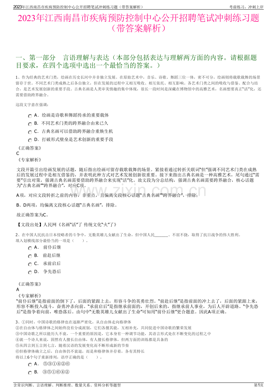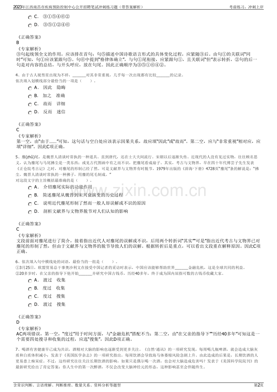 2023年江西南昌市疾病预防控制中心公开招聘笔试冲刺练习题(带答案解析)一、第一部分言语理解与表达(本部分包括表达与理解两方面的内容。请根据题目要求,在四个选项中选出一个最恰当的答案。)1、作为经典的艺术门类,绘画在历史长河中并非独立发展。在原始艺术中,音乐、诗歌、舞蹈三位一体,密不可分,绘画则将载歌载舞的场景留存于世。不同艺术门类成熟之后各自独立,但在发展的过程中又相互吸收、相互依托、相互影响。各艺术门类之间的吸收与借鉴、配合与结合,是艺术发展创新的重要手段。古典名画是人类审美情趣的集中体现,很长一段时间是深藏在博物馆中的高雅艺术,名画想要真正“活”化,还需要借助跨界融合。这段文字意在强调:A绘画是诗歌和舞蹈传承的重要载体 B不同艺术门类的跨界融合由来已久 C古典名画可以借助跨界融合重焕生机 D打破形式壁垒是艺术创新的重要手段正确答案C专家解析文段开篇引出绘画发展的话题,随后指出绘画可留存载歌载舞的场景。紧接着通过转折关联词“但”强调不同艺术门类在成熟后的发展过程中是相互借鉴的,并表明此种方式对艺术发展创新很重要。接下来指出古典名画是一种高雅艺术,尾句通过“需要”引出对策,强调古典名画需要借助跨界融合来实现“活”化。故文段为分总结构,强调古典名画需要跨界融合,核心话题为“古典名画”“跨界融合”,对应C项。A项,对应文段转折之前的内容,非重点,且偏离文段核心话题“古典名画”“跨界融合”,排除;B、D两项,均偏离文段核心话题“古典名画”,排除。故正确答案为C。【文段出处】人民网名画“活”了 传统文化“火”了2、在中国人民抗击日本侵略者的斗争中,无数英雄儿女献出了生命,但中国人民_、不屈不挠,取得了抗日战争的伟大胜利。填入划横线部分最恰当的一项是()。A 前仆后继 B 前赴后继 C 承前启后 D 争先恐后正确答案A专家解析“前仆后继”是指前面的倒下了,后面的紧跟上去,形容斗争的英勇壮烈。“前赴后继”是指前面的冲上去了,后面的紧跟上来,形容不断投入战斗,奋勇冲杀向前。“承前启后”是指继承前面的,开创后来的,指继承前人事业,为后人开辟道路。“争先恐后”是指争着向前,唯恐落后。由句中“无数英雄儿女献出了生命”可知用“前仆后继”更合题意。因此A项正确。3、同时,中国诗歌的格律也在逐渐严密化,从自由体走向格律体在自由体与格律体之间始终没有分成派别,它们各擅其能,互相补充,共同促进中国诗歌的繁荣发展中国诗歌之所以能历久不衰,一个重要的原因是,它本身有一种调节功能,其语言形式处在不断变化的过程之中就一个诗人来说,固然有人擅长自由体,有人擅长格律体,但两方面的训练都是具备的从四言到五言到七言,随着汉语的发展变化而不断形成新的节奏但格律体确立之后,自由体仍不衰退,而是和格律体并存着,各有其特长将以上6个句子重新排列,语序正确的是()。A B 2023年江西南昌市疾病预防控制中心公开招聘笔试冲刺练习题(带答案解析)考前练习,冲刺上岸含常识判断、言语理解、判断推理、数量关系、资料分析等题型第1页 C D 正确答案B专家解析句起统领全文的作用,应该排在首句;句描述中国诗歌语言形式的具体变化过程,应紧随后。由句的关联词“同时”可知,句应该紧跟句。句中提到“格律体确立”,与句尾衔接,应紧跟句,且关联词“但”表示转折,句的后一句是对内容的总结,与开头呼应,放在句尾。因此正确顺序为。4、由于古人视彗星出现为不祥,_对其非常重视,几乎每一次出现都有比较_的记录。依次填入划横线部分最恰当的一项是()。A 因此隐晦 B 加之准确 C 故而详细 D 反而迷信正确答案C专家解析第一空,由“由于”可知,这句话与空白处应该表示因果关系,故应填“因此”或“故而”。第二空,应与“非常重视”相对应,应填“详细”。因此C项正确。5、麈(zh)尾,是魏晋人清谈时常执的一种道具。直到唐代,还在士大夫间流行。宋朝以后逐渐失传。近现代的人没有见过实物,往往顾名思义,认为麈尾与马尾拂尘是一类东西;或见古代图画中有之而不识,把麈尾看成扇子。其实,考古与文物界,早在四十年代傅芸子先生发表正仓院考古记之时,对麈尾的形制已经了然。可是文献界与文物界有时脱节,1979年出版的辞海下册4728页“麈尾”条的解说是:“拂尘。魏晋人清谈时常执的一种拂子,用麈的尾毛制成。”对这段文字的主旨概括最准确的是()。A 介绍麈尾实际的功能作用 B 简述麈尾从魏晋到宋兴衰演变的历史过程 C 说明近代麈尾形制了然而一般人却误解或不识的原因 D 剖析文献界与文物界脱节对人们认知的影响正确答案C专家解析文段前面对麈尾进行了简介,接着指出近代人对麈尾的误解或不识,后用两个转折词“其实”“可是”指出近代考古与文物界已对麈尾的形制了然,但由于文献界与文物界的脱节导致人们的误解。根据转折后是重点,可以看出文段重在解释原因。因此C项正确。6、依次填入句中横线处的词语,最恰当的一组是()。3月25日,欧盟贸易总干事奥沙利文在接受中国记者的采访时表示,中国应该能够帮助世界_金融危机,这是全球共同的利益。20多岁时,在父亲的指导下他开始_并研究中国古钱币,历经40多年,终于成为国内屈指可数的古钱币收藏大家。A 渡过收集 B 度