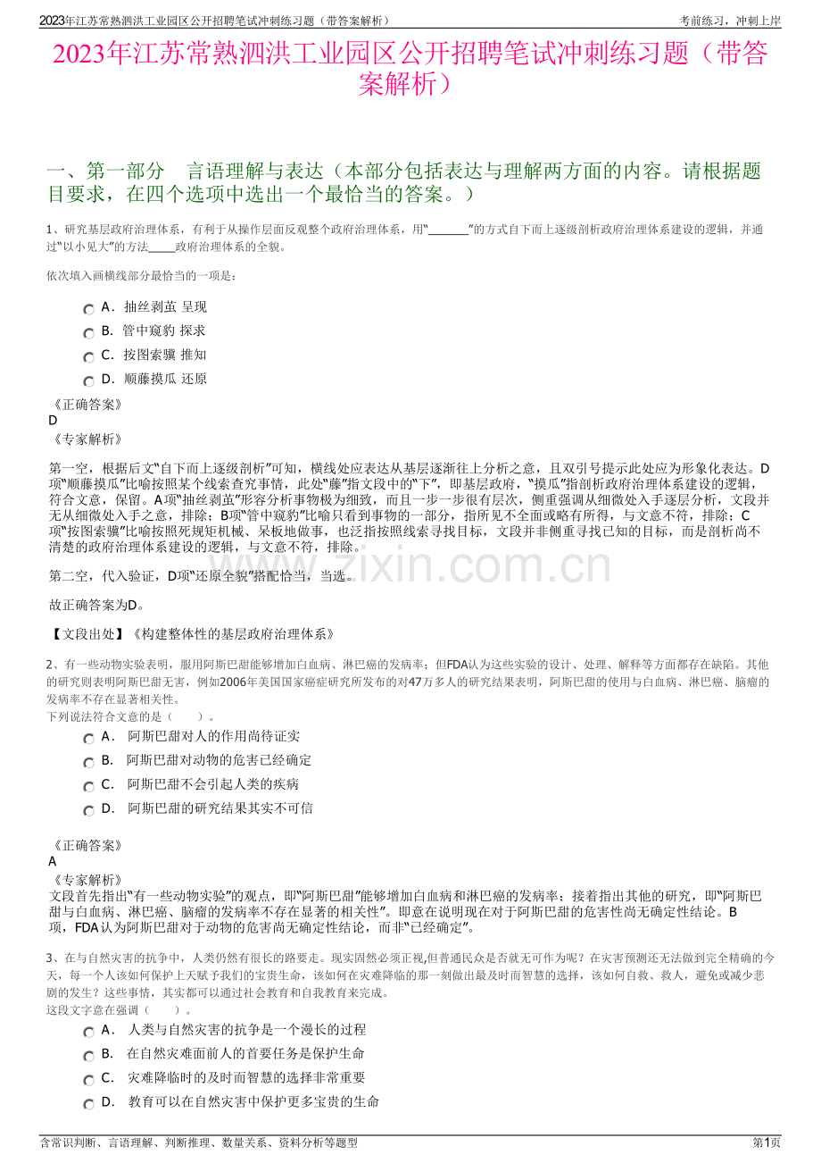 2023年江苏常熟泗洪工业园区公开招聘笔试冲刺练习题(带答案解析)一、第一部分言语理解与表达(本部分包括表达与理解两方面的内容。请根据题目要求,在四个选项中选出一个最恰当的答案。)1、研究基层政府治理体系,有利于从操作层面反观整个政府治理体系,用“”的方式自下而上逐级剖析政府治理体系建设的逻辑,并通过“以小见大”的方法 政府治理体系的全貌。依次填入画横线部分最恰当的一项是:A抽丝剥茧 呈现 B管中窥豹 探求 C按图索骥 推知 D顺藤摸瓜 还原正确答案D专家解析第一空,根据后文“自下而上逐级剖析”可知,横线处应表达从基层逐渐往上分析之意,且双引号提示此处应为形象化表达。D项“顺藤摸瓜”比喻按照某个线索查究事情,此处“藤”指文段中的“下”,即基层政府,“摸瓜”指剖析政府治理体系建设的逻辑,符合文意,保留。A项“抽丝剥茧”形容分析事物极为细致,而且一步一步很有层次,侧重强调从细微处入手逐层分析,文段并无从细微处入手之意,排除;B项“管中窥豹”比喻只看到事物的一部分,指所见不全面或略有所得,与文意不符,排除;C项“按图索骥”比喻按照死规矩机械、呆板地做事,也泛指按照线索寻找目标,文段并非侧重寻找已知的目标,而是剖析尚不清楚的政府治理体系建设的逻辑,与文意不符,排除。第二空,代入验证,D项“还原全貌”搭配恰当,当选。故正确答案为D。【文段出处】构建整体性的基层政府治理体系2、有一些动物实验表明,服用阿斯巴甜能够增加白血病、淋巴癌的发病率;但FDA认为这些实验的设计、处理、解释等方面都存在缺陷。其他的研究则表明阿斯巴甜无害,例如2006年美国国家癌症研究所发布的对47万多人的研究结果表明,阿斯巴甜的使用与白血病、淋巴癌、脑瘤的发病率不存在显著相关性。下列说法符合文意的是()。A 阿斯巴甜对人的作用尚待证实 B 阿斯巴甜对动物的危害已经确定 C 阿斯巴甜不会引起人类的疾病 D 阿斯巴甜的研究结果其实不可信正确答案A专家解析文段首先指出“有一些动物实验”的观点,即“阿斯巴甜”能够增加白血病和淋巴癌的发病率;接着指出其他的研究,即“阿斯巴甜与白血病、淋巴癌、脑瘤的发病率不存在显著的相关性”。即意在说明现在对于阿斯巴甜的危害性尚无确定性结论。B项,FDA认为阿斯巴甜对于动物的危害尚无确定性结论,而非“已经确定”。3、在与自然灾害的抗争中,人类仍然有很长的路要走。现实固然必须正视,但普通民众是否就无可作为呢?在灾害预测还无法做到完全精确的今天,每一个人该如何保护上天赋予我们的宝贵生命,该如何在灾难降临的那一刻做出最及时而智慧的选择,该如何自救、救人,避免或减少悲剧的发生?这些事情,其实都可以通过社会教育和自我教育来完成。这段文字意在强调()。A 人类与自然灾害的抗争是一个漫长的过程 B 在自然灾难面前人的首要任务是保护生命 C 灾难降临时的及时而智慧的选择非常重要 D 教育可以在自然灾害中保护更多宝贵的生命2023年江苏常熟泗洪工业园区公开招聘笔试冲刺练习题(带答案解析)考前练习,冲刺上岸含常识判断、言语理解、判断推理、数量关系、资料分析等题型第1页正确答案D专家解析文段首先交代了背景,然后用两个问号提出问题在与自然灾害的抗争中,普通民众应有何作为。然后,最后一句话对前面的两个问号进行了回答。由此可判断整个文段采用了设问的形式。而设问的重点在答案,即文段意在强调最后一句话。因此D项正确。4、中国古代数学家对“一次同余论”的研究有_的独创性和继承性,“大衍求一术”在世界数学史上的崇高地位是不容_的。正因为这样,在西方数学史著作中,一直公正地称求解一次同余组的剩余定理为“中国剩余定理”。填入划横线部分最恰当的一项是()。A 完全否定 B 明确忽视 C 绝对动摇 D 明显怀疑正确答案D专家解析第一空,由在西方数学史著作中称“中国剩余定理”可知,中国对“一次同余论”研究有“明显”成就;第二空,“不容”通常与“怀疑”、“置疑”搭配。因此D项正确。5、有不少干部历来是只要进了机关的门,就捧上了铁饭碗,只要不得罪顶头上司,就没有什么需要担心的;只要侍奉好了上司,那就肯定前途无量。老百姓虽然说是公仆的主人,但是在实际生活中却关不着干部们什么事;所以,每想到机关去,就一定会发现门难进、面难看、事难办。这句话的意思很明确,但却不是指()。A 有一些作风差的机关干部们打心眼里就没把老百姓放在眼中 B 老百姓之所以“办事难”,就是因为有了这么一个只需要对上负责的实际规矩 C 老百姓就是因为本来没有事儿,有事也是“八杆子打不着边”,所以才会在机关里“办不成事”,还经常遭冷遇 D 干部们哪怕是把老百姓都得罪了,也照样安然无事正确答案C专家解析文段主要说明老百姓办事难主要是干部对老百姓根本就没放在眼中,因为老百姓在干部们来看是无关紧要的,不影响他们的前途,关系干部前程的是其顶头上司,因此文段说只要不得罪顶头上司就没什么担心的了。C项,与题干的观点相悖,认为老百姓办事难是因为没有本事。6、隔扇是我国古代的一种门,用于分隔室内外或室内空间,隔扇门既可联通内外,又能分隔空间,还可透光、通风,因而兼具门、窗、墙的功能。据记载,隔扇门在唐代已经出现,