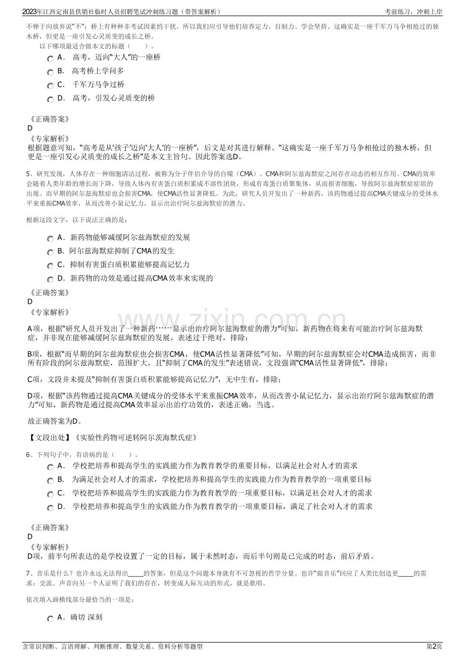2023年江西定南县供销社临时人员招聘笔试冲刺练习题(带答案解析)一、第一部分言语理解与表达(本部分包括表达与理解两方面的内容。请根据题目要求,在四个选项中选出一个最恰当的答案。)1、好的小说应该是可读性、艺术性和思想性的完美结合,比如大仲马的小说,之所以流行百年而不衰,就是因为有着_的故事情节和高超的写作技巧以及深刻的思想内容。填入划横线部分最恰当的一项是()。A 完美无瑕 B 津津有味 C 引人入胜 D 意犹未尽正确答案C专家解析AB两项错误,所填词应是用于修饰故事情节的定语,“完美无瑕”是指达到最好标准,“意犹未尽”一般被用来形容活动感想,均不可用于修饰故事情节。D项错误,“津津有味”一般作谓语、宾语,此处应填入定语。“引人入胜”表示吸引人进入美妙的境界,现多用来指风景或文艺作品特别吸引人,符合句意。因此答案选C。2、“不负众望”与“不孚众望”,仅一字之差,但其义_,作为公益型国企的石油石化、电网、通信服务等,一定要心系国家利益和人民利益,并把国家利益和人民利益放在首位,做到“_”,切忌“_”。依次填入划横线部分最恰当的一项是()。A 泾渭分明不孚众望不负众望 B 大相径庭不孚众望不负众望 C 迥然不同不负众望不孚众望 D 天差地别不负众望不孚众望正确答案C专家解析“不负众望”指不辜负大家的期望,“不孚众望”意为不能令大家信服。第二空,应选“不负众望”,第三空,填“不孚众望”。第一空,“天差地别”强调的是“差距”,“迥然不同”强调的是“不同”,应选“迥然不同”。因此C项正确。3、古今名人来到一些名山大川、古迹胜地,往往因触景生情而兴致大发,欣然而命笔这是专门评说明太祖朱元璋与大将徐达下棋论输赢的对联,读了可使人从中悟出人生如棋的道理,从而受到胜败的教育和哲理的启迪旅游赏联有助于陶冶情操这些楹联,或镌刻于亭台楼阁,或分贴于寺庙祠墓游南京莫愁湖胜棋楼,你会看到一副对联:“人言可信,我始欲愁,仔细思量,风吹皱一池春水;胜固欣然,败亦可喜,如何结局,浪淘尽千古英雄。”不但为山水增色,美化了环境,还成了游人吊古凭史的对象将以上6个句子重新排列,语序正确的是()。A B C D 正确答案B专家解析文段主要讲名胜古迹中楹联的作用。句概括了旅游赏联的意义,起到了总领文段的作用,应为文段的总起句。句中“这是对联”是紧承句中的对联的,故两句应紧密相连。因此B项正确。4、高考是从“孩子”迈向“大人”的一座桥。桥上有激烈竞争,但我们应教会他们更强调公平竞争;桥上有成功与失败,所以我们应鼓励他们永远2023年江西定南县供销社临时人员招聘笔试冲刺练习题(带答案解析)考前练习,冲刺上岸含常识判断、言语理解、判断推理、数量关系、资料分析等题型第1页不惮于向放弃说“不”;桥上有种种非考试因素的干扰。所以我们应引导他们培养定力、自制力、学会坚持。这确实是一座千军万马争相抢过的独木桥,但更是一座引发心灵质变的成长之桥。以下哪项最适合做本文的标题()。A 高考,迈向“大人”的一座桥 B 高考桥上学问多 C 千军万马争过桥 D 高考,引发心灵质变的桥正确答案D专家解析根据题意可知,“高考是从孩子迈向大人的一座桥”,后文是对其进行解释。“这确实是一座千军万马争相抢过的独木桥,但更是一座引发心灵质变的成长之桥”是本文主旨句。因此答案选D。5、研究发现,人体存在一种细胞清洁过程,被称为分子伴侣介导的自噬(CMA)。CMA和阿尔兹海默症之间存在动态的相互作用。CMA的效率会随着人类年龄的增长而下降,导致人体内有害蛋白质积累成不溶性团块,形成有毒蛋白质聚集体,从而损害细胞,导致阿尔兹海默症症状的出现。而早期的阿尔兹海默症也会损害CMA,使CMA活性显著降低。为此,研究人员开发出了一种新药,该药物通过提高CMA关键成分的受体水平来重振CMA效率,从而改善小鼠记忆力,显示出治疗阿尔兹海默症的潜力。根据这段文字,以下说法正确的是:A新药物能够减缓阿尔兹海默症的发展 B阿尔兹海默症抑制了CMA的发生 C抑制有害蛋白质积累能够提高记忆力 D新药物的功效是通过提高CMA效率来实现的正确答案D专家解析A项,根据“研究人员开发出了一种新药显示出治疗阿尔兹海默症的潜力”可知,新药物在将来有可能治疗阿尔兹海默症,并非现在能够减缓阿尔兹海默症的发展,表述过于绝对,排除;B项,根据“而早期的阿尔兹海默症也会损害CMA,使CMA活性显著降低”可知,早期的阿尔兹海默症会对CMA造成损害,而非所有阶段的阿尔兹海默症,范围扩大,且“抑制了CMA的发生”表述错误,文段强调“CMA活性显著降低”,排除;C项,文段并未提及“抑制有害蛋白质积累能够提高记忆力”,无中生有,排除;D项,根据“该药物通过提高CMA关键成分的受体水平来重振CMA效率,从而改善小鼠记忆力,显示出治疗阿尔兹海默症的潜力”可知,新药物是通过提高CMA效率显示出治疗功效的,表述正确,当选。故正确答案为D。【文段出处】实验性药物可逆转阿尔茨海默氏症6、下列句子中,有语病的是()。A 学校把培养和提高学生的实践能力作为教育教学的重要目标,以满足社会对人才的需求 B 为满足社会对人才的需求,学校把培养和提高学生的实践能力作为教育教学的一项重要目标 C 学校把培养和提高学生的实践能力作为教育