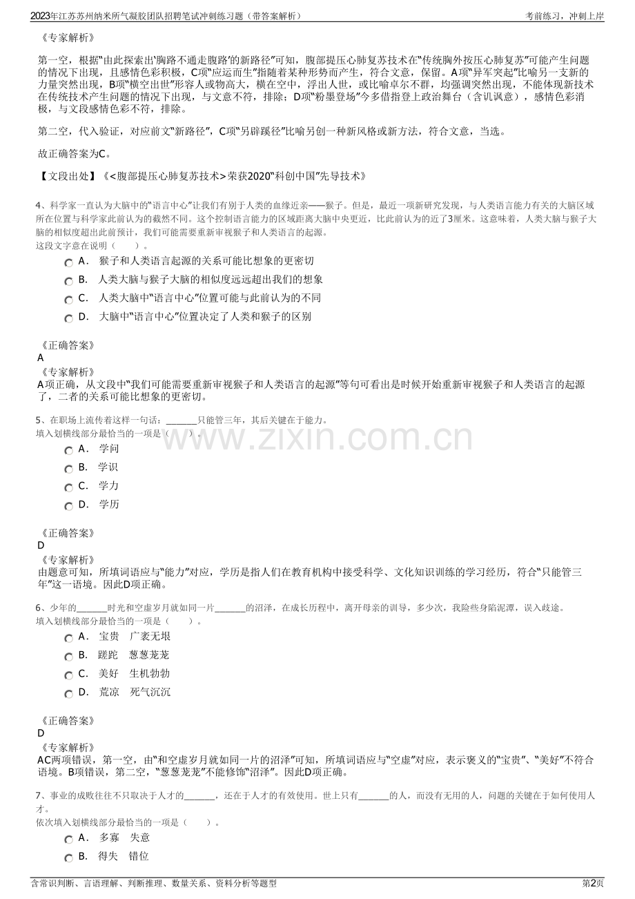 2023年江苏苏州纳米所气凝胶团队招聘笔试冲刺练习题(带答案解析)一、第一部分言语理解与表达(本部分包括表达与理解两方面的内容。请根据题目要求,在四个选项中选出一个最恰当的答案。)1、在女性高管为何屈指可数这一问题上,华尔街日报的卡罗尔希莫威茨和蒂莫西舍尔哈德特用了“玻璃天花板”这个比喻,来描述女性在晋升到一定职位高度时必然会遭遇的一道障碍。如今,这个比喻已经不合时宜了。一方面,女性出任首席高管、大学校长、州长甚至国家总统早已有了先例,另一方面,女性在职业发展道路上遭遇到的不仅仅只有最后那道障碍。如今有了一个更为恰当的比喻来形容女性在职业发展上所遇到的种种阻碍,那就是“迷宫”。“迷宫”这个比喻意在表明()。A 女性在职业发展中会遇到各种阻碍 B“玻璃天花板”的比喻已经不合时宜 C 女性晋升到一定职位高度时必然遭遇障碍 D 女性职业发展中阻碍重重,但仍有可能晋升高管正确答案D专家解析D项正确,文中的“玻璃天花板”比喻女性职业发展到一定高度遇到的一道难以突破的障碍,但这个比喻现在已经不合时宜,主要原因有两个方面:女性能够突破障碍晋升高管;女性职业发展中遇到的障碍很多,不止最后那道。即女性在职业发展中会遇到各种阻碍,但仍然有可能冲破阻碍晋升高管,这也正是“迷宫”所指。2、下面几个句子按顺序排列,语意最连贯的一项是()。奖牌背面镶嵌玉璧即站立的胜利女神和希腊潘纳辛纳科竞技场全景奖牌正面使用国际奥委会统一规定的图案奖牌的挂钩由中国传统玉双龙蒲纹璜演变而成玉璧正中的金属图形上镌刻着北京奥运会的会徽 A B C D 正确答案A专家解析本段为介绍北京2008年奥运会奖牌的文字。依据事物的逻辑顺序,依次介绍奖牌的正面、背面以及挂钩。因此A项正确。3、实施传统胸外按压心肺复苏,常会发生肋骨或胸骨骨折,导致肺、胸膜及心脏损伤,影响心肺复苏的成功率,急救专家由此探索出“胸路不通走腹路”的新路径,腹部提压心肺复苏技术 。与传统心肺复苏技术相比,该技术 ,利用腹部提压心肺复苏仪达到起腹心动、起腹呼吸的目的。依次填入画横线部分最恰当的一项是:A异军突起 推陈出新 B横空出世 一举两得 C应运而生 另辟蹊径 D粉墨登场 扬长避短正确答案C2023年江苏苏州纳米所气凝胶团队招聘笔试冲刺练习题(带答案解析)考前练习,冲刺上岸含常识判断、言语理解、判断推理、数量关系、资料分析等题型第1页专家解析第一空,根据“由此探索出胸路不通走腹路的新路径”可知,腹部提压心肺复苏技术在“传统胸外按压心肺复苏”可能产生问题的情况下出现,且感情色彩积极,C项“应运而生”指随着某种形势而产生,符合文意,保留。A项“异军突起”比喻另一支新的力量突然出现,B项“横空出世”形容人或物高大,横在空中,浮出人世,或比喻卓尔不群,均强调突然出现,不能体现新技术在传统技术产生问题的情况下出现,与文意不符,排除;D项“粉墨登场”今多借指登上政治舞台(含讥讽意),感情色彩消极,与文段感情色彩不符,排除。第二空,代入验证,对应前文“新路径”,C项“另辟蹊径”比喻另创一种新风格或新方法,符合文意,当选。故正确答案为C。【文段出处】荣获2020“科创中国”先导技术4、科学家一直认为大脑中的“语言中心”让我们有别于人类的血缘近亲猴子。但是,最近一项新研究发现,与人类语言能力有关的大脑区域所在位置与科学家此前认为的截然不同。这个控制语言能力的区域距离大脑中央更近,比此前认为的近了3厘米。这意味着,人类大脑与猴子大脑的相似度超出此前预计,我们可能需要重新审视猴子和人类语言的起源。这段文字意在说明()。A 猴子和人类语言起源的关系可能比想象的更密切 B 人类大脑与猴子大脑的相似度远远超出我们的想象 C 人类大脑中“语言中心”位置可能与此前认为的不同 D 大脑中“语言中心”位置决定了人类和猴子的区别正确答案A专家解析A项正确,从文段中“我们可能需要重新审视猴子和人类语言的起源”等句可看出是时候开始重新审视猴子和人类语言的起源了,二者的关系可能比想象的更密切。5、在职场上流传着这样一句话:_只能管三年,其后关键在于能力。填入划横线部分最恰当的一项是()。A 学问 B 学识 C 学力 D 学历正确答案D专家解析由题意可知,所填词语应与“能力”对应,学历是指人们在教育机构中接受科学、文化知识训练的学习经历,符合“只能管三年”这一语境。因此D项正确。6、少年的_时光和空虚岁月就如同一片_的沼泽,在成长历程中,离开母亲的训导,多少次,我险些身陷泥潭,误入歧途。填入划横线部分最恰当的一项是()。A 宝贵广袤无垠 B 蹉跎葱葱茏茏 C 美好生机勃勃 D 荒凉死气沉沉正确答案D专家解析AC两项错误,第一空,由“和空虚岁月就如同一片的沼泽”可知,所填词语应与“空虚”对应,表示褒义的“宝贵”、“美好”不符合语境。B项错误,第二空,“葱葱茏茏”不能修饰“沼泽”。因此D项正确。7、事业的成败往往不只取决于人才的_,还在于人才的有效使用。世上只有_的人,而没有无用的人,问题的关键在于如何使用人才。依次填入划横线部分最恰当的一项是()。A 多寡失意 B 得失错位2023年江苏苏州纳米所气凝胶团队招聘笔试冲刺练习题(带答案解析)考前练习,冲