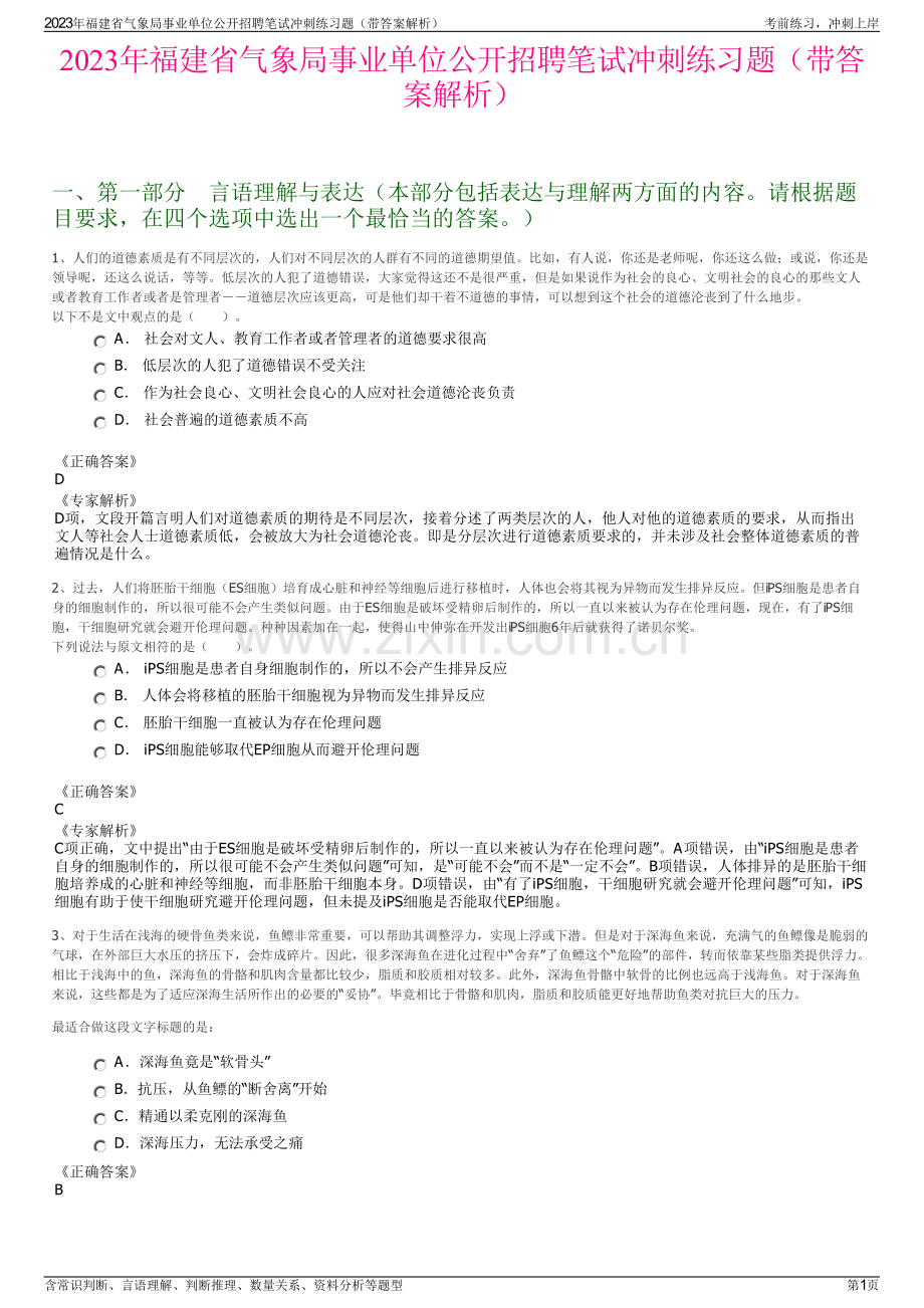2023年福建省气象局事业单位公开招聘笔试冲刺练习题(带答案解析)一、第一部分言语理解与表达(本部分包括表达与理解两方面的内容。请根据题目要求,在四个选项中选出一个最恰当的答案。)1、人们的道德素质是有不同层次的,人们对不同层次的人群有不同的道德期望值。比如,有人说,你还是老师呢,你还这么做;或说,你还是领导呢,还这么说话,等等。低层次的人犯了道德错误,大家觉得这还不是很严重,但是如果说作为社会的良心、文明社会的良心的那些文人或者教育工作者或者是管理者道德层次应该更高,可是他们却干着不道德的事情,可以想到这个社会的道德沦丧到了什么地步。以下不是文中观点的是()。A 社会对文人、教育工作者或者管理者的道德要求很高 B 低层次的人犯了道德错误不受关注 C 作为社会良心、文明社会良心的人应对社会道德沦丧负责 D 社会普遍的道德素质不高正确答案D专家解析D项,文段开篇言明人们对道德素质的期待是不同层次,接着分述了两类层次的人,他人对他的道德素质的要求,从而指出文人等社会人士道德素质低,会被放大为社会道德沦丧。即是分层次进行道德素质要求的,并未涉及社会整体道德素质的普遍情况是什么。2、过去,人们将胚胎干细胞(ES细胞)培育成心脏和神经等细胞后进行移植时,人体也会将其视为异物而发生排异反应。但iPS细胞是患者自身的细胞制作的,所以很可能不会产生类似问题。由于ES细胞是破坏受精卵后制作的,所以一直以来被认为存在伦理问题,现在,有了iPS细胞,干细胞研究就会避开伦理问题。种种因素加在一起,使得山中伸弥在开发出iPS细胞6年后就获得了诺贝尔奖。下列说法与原文相符的是()。A iPS细胞是患者自身细胞制作的,所以不会产生排异反应 B 人体会将移植的胚胎干细胞视为异物而发生排异反应 C 胚胎干细胞一直被认为存在伦理问题 D iPS细胞能够取代EP细胞从而避开伦理问题正确答案C专家解析C项正确,文中提出“由于ES细胞是破坏受精卵后制作的,所以一直以来被认为存在伦理问题”。A项错误,由“iPS细胞是患者自身的细胞制作的,所以很可能不会产生类似问题”可知,是“可能不会”而不是“一定不会”。B项错误,人体排异的是胚胎干细胞培养成的心脏和神经等细胞,而非胚胎干细胞本身。D项错误,由“有了iPS细胞,干细胞研究就会避开伦理问题”可知,iPS细胞有助于使干细胞研究避开伦理问题,但未提及iPS细胞是否能取代EP细胞。3、对于生活在浅海的硬骨鱼类来说,鱼鳔非常重要,可以帮助其调整浮力,实现上浮或下潜。但是对于深海鱼来说,充满气的鱼鳔像是脆弱的气球,在外部巨大水压的挤压下,会炸成碎片。因此,很多深海鱼在进化过程中“舍弃”了鱼鳔这个“危险”的部件,转而依靠某些脂类提供浮力。相比于浅海中的鱼,深海鱼的骨骼和肌肉含量都比较少,脂质和胶质相对较多。此外,深海鱼骨骼中软骨的比例也远高于浅海鱼。对于深海鱼来说,这些都是为了适应深海生活所作出的必要的“妥协”。毕竟相比于骨骼和肌肉,脂质和胶质能更好地帮助鱼类对抗巨大的压力。最适合做这段文字标题的是:A深海鱼竟是“软骨头”B抗压,从鱼鳔的“断舍离”开始 C精通以柔克刚的深海鱼 D深海压力,无法承受之痛正确答案B2023年福建省气象局事业单位公开招聘笔试冲刺练习题(带答案解析)考前练习,冲刺上岸含常识判断、言语理解、判断推理、数量关系、资料分析等题型第1页专家解析文段开篇介绍鱼鳔对于浅海硬骨鱼类的重要性,并通过转折关联词“但是”指出鱼鳔无法承受深海压力,接着通过“因此”总结前文,强调深海鱼为了承受水压而在进化过程中“舍弃”了鱼鳔,转而依靠某些脂类提供浮力。后文通过介绍深海鱼与浅海鱼在骨骼和肌肉含量等方面的不同,继续论述深海鱼类为了适应深海生活而作出的“妥协”。故文段强调深海鱼为了“抗压”而“舍弃”鱼鳔,依靠脂类,对应B项。A项,“软骨头”对应“此外”之后的内容,表述片面,排除;C项,未提及核心话题“抗压”,且文段指出深海鱼相对于浅海鱼的一些不同是“为了适应深海生活所作出的必要的妥协”,“以柔克刚”指用柔软的去克制刚强的,与文意不符,排除;D项,“无法承受之痛”文段并未提及,无中生有,且程度过重,排除。故正确答案为B。【文段出处】鱼类能顶住深海压力,可不是因为心态好4、共产主义决不是“土豆烧牛肉”那么简单,不可能 、一蹴而就,但我们不能因为实现共产主义理想是一个漫长的过程,就认为那是虚无缥缈的海市蜃楼,就不去做一名忠诚的共产党员。填入画横线部分最恰当的一项是:A信手拈来 B一帆风顺 C唾手可得 D轻车熟路正确答案C专家解析根据“、”可知,横线处所填成语应与“一蹴而就”构成同义并列,语义相近,且根据横线前“共产主义决不是土豆烧牛肉那么简单”可知,横线处所填成语应体现出简单、容易得到或成功之意,C项“唾手可得”比喻很容易就得到,符合文意,当选。A项“信手拈来”指随手拿来,多形容写文章时词汇或材料丰富,不费思索就能写出来,与文段“实现共产主义理想”语境不符,排除;B项“一帆风顺”比喻非常顺利,没有任何阻碍,文段并非强调“顺利”,与文意不符,排除;D项“轻车熟路”比喻对事情熟悉,做起来容易,文段并没有体现出对“实现共产主义理想”的做