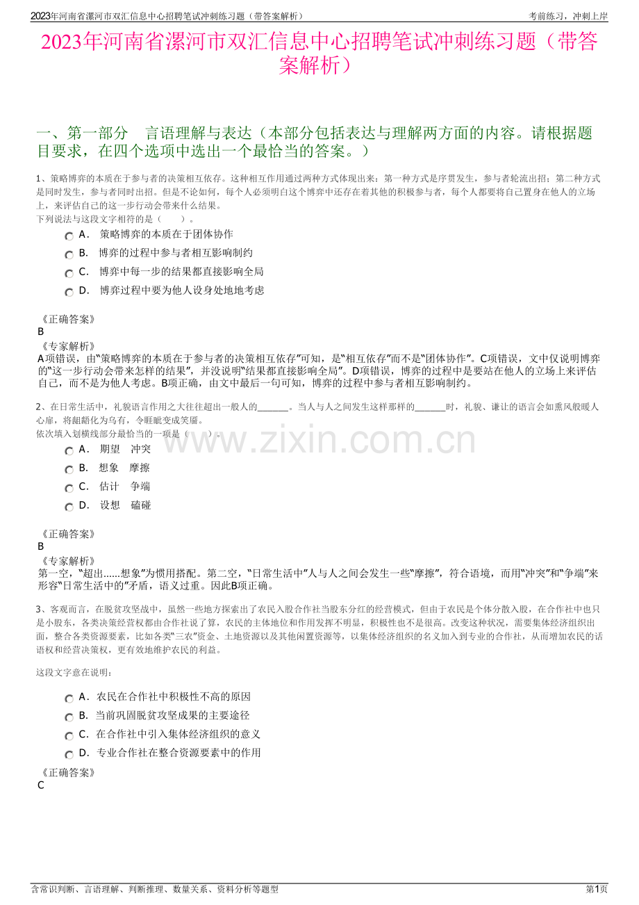 2023年河南省漯河市双汇信息中心招聘笔试冲刺练习题(带答案解析)一、第一部分言语理解与表达(本部分包括表达与理解两方面的内容。请根据题目要求,在四个选项中选出一个最恰当的答案。)1、策略博弈的本质在于参与者的决策相互依存。这种相互作用通过两种方式体现出来:第一种方式是序贯发生,参与者轮流出招;第二种方式是同时发生,参与者同时出招。但是不论如何,每个人必须明白这个博弈中还存在着其他的积极参与者,每个人都要将自己置身在他人的立场上,来评估自己的这一步行动会带来什么结果。下列说法与这段文字相符的是()。A 策略博弈的本质在于团体协作 B 博弈的过程中参与者相互影响制约 C 博弈中每一步的结果都直接影响全局 D 博弈过程中要为他人设身处地地考虑正确答案B专家解析A项错误,由“策略博弈的本质在于参与者的决策相互依存”可知,是“相互依存”而不是“团体协作”。C项错误,文中仅说明博弈的“这一步行动会带来怎样的结果”,并没说明“结果都直接影响全局”。D项错误,博弈的过程中是要站在他人的立场上来评估自己,而不是为他人考虑。B项正确,由文中最后一句可知,博弈的过程中参与者相互影响制约。2、在日常生活中,礼貌语言作用之大往往超出一般人的_。当人与人之间发生这样那样的_时,礼貌、谦让的语言会如熏风般暖人心扉,将龃龉化为乌有,令睚眦变成笑靥。依次填入划横线部分最恰当的一项是()。A 期望冲突 B 想象摩擦 C 估计争端 D 设想磕碰正确答案B专家解析第一空,“超出想象”为惯用搭配。第二空,“日常生活中”人与人之间会发生一些“摩擦”,符合语境,而用“冲突”和“争端”来形容“日常生活中的”矛盾,语义过重。因此B项正确。3、客观而言,在脱贫攻坚战中,虽然一些地方探索出了农民入股合作社当股东分红的经营模式,但由于农民是个体分散入股,在合作社中也只是小股东,各类决策经营权都由合作社说了算,农民的主体地位和作用发挥不明显,积极性也不是很高。改变这种状况,需要集体经济组织出面,整合各类资源要素,比如各类“三农”资金、土地资源以及其他闲置资源等,以集体经济组织的名义加入到专业的合作社,从而增加农民的话语权和经营决策权,更有效地维护农民的利益。这段文字意在说明:A农民在合作社中积极性不高的原因 B当前巩固脱贫攻坚成果的主要途径 C在合作社中引入集体经济组织的意义 D专业合作社在整合资源要素中的作用正确答案C2023年河南省漯河市双汇信息中心招聘笔试冲刺练习题(带答案解析)考前练习,冲刺上岸含常识判断、言语理解、判断推理、数量关系、资料分析等题型第1页专家解析文段开篇介绍农民入股合作社的脱贫经营模式,之后通过转折词“但”指出农民的主体作用不明显且积极性不高的问题,紧接着通过“需要”提出对策,即需要通过集体经济组织整合各类资源要素,之后通过举例子及意义效果进行解释说明。故文段为分总分结构,强调集体经济组织出面加入合作社的重要性,对应C项。A项,“农民的积极性不高”为问题表述,非文段重点,排除;B项,“主要途径”对策表述不明确,文段重点强调的对策是“通过集体经济组织整合各类资源要素”,排除;D项,根据“需要集体经济组织出面,整合各类资源要素”可知,文段强调的是“集体经济组织”可以“整合各类资源要素”,而非“专业合作社”,偷换概念,排除。故正确答案为C。【文段出处】乡村振兴要突出合作社这个支撑点4、有统计表明,由听力障碍者组成的家庭中,约90%育有听力正常子女。他们因出生于听障家庭,常常处在听障、健听两个世界的边缘地带。他们可能既无法真正 听障者世界,也不被听人世界完全 。他们面临普通人无法想象的挫折和压力,比如语言 迟缓、人际沟通障碍等,社会应给予他们更多的关注。依次填入划横线部分最恰当的一项是:A融入 接纳 习得 B汇入 接受 发展 C进入 纳入 获取 D深入 接收 运用正确答案A专家解析第一空,搭配“听障者世界”,横线前“他们”指代听力障碍者家庭中的听力正常子女,根据前文“常常处在听障、健听两个世界的边缘地带”可知,他们对于这两个世界都无法融合进来,A项“融入”、C项“进入”、D项“深入”均搭配恰当且符合文意,保留。B项“汇入”侧重空间上的汇合进入,与“听障者世界”搭配不当,排除。第二空,搭配“听人世界”,且根据前后的并列关系可知,此处表示不被听人世界所接受,A项“接纳”、C项“纳入”均搭配恰当且符合文意,保留。D项“接收”指收受,文段强调的是接受的态度而非接收的具体行为,与文意不符,排除。第三空,搭配“语言”,A项“习得”指学习得到,置于此处搭配恰当且符合文意,当选。C项“获取”表示获得、取得,一般不与“语言”搭配,排除。故正确答案为A。【文段出处】光明日报倪兰:听障家庭中的健听子女5、好的散文不会让读者感到与作者生疏。作者在描摹眼中世界的同时,也在清晰地勾画着自身的影像。实际上,_,无论作品本身是优是劣。“作者形象”并不等同于作家的自画像,它是作家灵魂的投影,是展现在文字中的一种人生境界,是写作视角和阅读视角综合的结果。填入划横线处最恰当的一句是()。A 写作是一种意味深长的印记 B 作品传达的是作者独有的情感体验 C 没有一部作品不在
