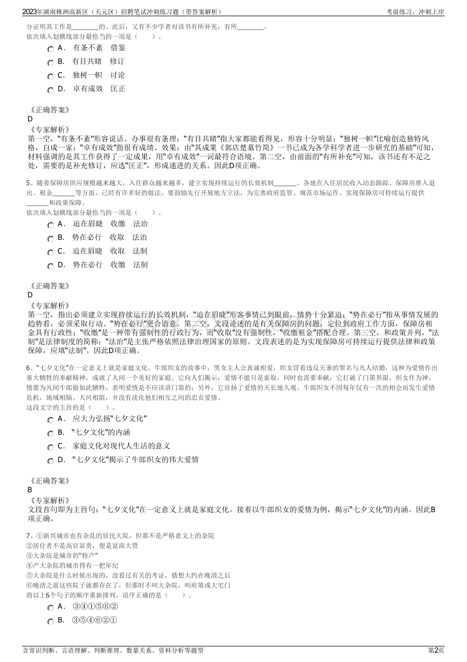 2023年湖南株洲高新区(天元区)招聘笔试冲刺练习题(带答案解析)一、第一部分言语理解与表达(本部分包括表达与理解两方面的内容。请根据题目要求,在四个选项中选出一个最恰当的答案。)1、在这里,人们已经从浮躁的、高速的城市发展中沉淀下来,希望获得内在的平衡二十多年以来,从外表上看,那里的变化并不是非常巨大整个城市显得平和恬静每年,我仍旧有机会飞往硅谷,参加各种年会包括节能减排的新举措但是生活在那里的人正在源源不断地为它注入各种生机将以上6个句子重新排列,语序正确的是()。A B C D 正确答案A专家解析文段主要是对某个城市的具体描述,只有句中提到了具体的地名“硅谷”,应为首句。中代词“那里的变化”指“硅谷”的变化,承前启后,描述的是硅谷的变化,而则是对这一变化的进一步总结,应在之后。因此正确顺序是。2、下列各句中,没有语病的一句是()。A 当全球金融危机爆发,使我国出口遭遇寒冬 B 现在的天文学,不是光研究太阳、月亮、星星在天上的位置和运行规律,还要研究星星里头的变化,研究宇宙的演化 C 当下,大量新型社区的出现,同时改变了国人原有的居住方式,也促使人们的行为和观念发生了潜移默化的改变 D 正午时分,经过几个小时的攀爬,我们终于登上了山的最高峰,不禁延口残喘正确答案B专家解析A项错误,该项缺失主语,去掉“当”。C项错误,该项属于关联词语搭配不当,应将“同时”改为“不仅”。D项错误,“正午时分”表示进行时态,和后面的“经过几个小时的攀爬”搭配不当,另外“延口残喘”是贬义词,与登上最高峰的语境不相符。3、江汉平原的黄土地,_可以种植任何农作物,不仅出产颇丰,而且水资源丰富、渔业发达,成为长江中下游平原上的鱼米之乡,为鄂菜提供了_的原材料。依次填入划横线部分最恰当的一项是()。A 自古五味俱全 B 完全种类繁多 C 由于独具特色 D 几乎用之不竭正确答案D专家解析第一空,“完全可以种植任何农作物”过于绝对化,填入“由于”亦绝对化,“几乎”语气较委婉,即差不多所以农作物都能种植,可以由此推出这里资源丰富,与后文语境相符。第二空,应此处填入与“丰富繁多”相近的词语,“五味俱全”和“独具特色”在此处均不合逻辑,“用之不竭”经无限取用而不会使用完,形容非常丰富,符合句意。因此D项正确。4、郭店老子的文字考释工作主要是由湖北省荆门市博物馆进行的,其成果郭店楚墓竹简一书已成为各科学者进一步研究的基础,这充2023年湖南株洲高新区(天元区)招聘笔试冲刺练习题(带答案解析)考前练习,冲刺上岸含常识判断、言语理解、判断推理、数量关系、资料分析等题型第1页分证明其工作是_的。此后,又有不少学者对该书有所补充,有所_。依次填入划横线部分最恰当的一项是()。A 有条不紊借鉴 B 有目共睹修订 C 独树一帜讨论 D 卓有成效匡正正确答案D专家解析第一空,“有条不紊”形容说话、办事很有条理;“有目共睹”指大家都能看得见,形容十分明显;“独树一帜”比喻创造独特风格,自成一家;“卓有成效”指很有成绩、效果;由“其成果郭店楚墓竹简一书已成为各学科学者进一步研究的基础”可知,材料强调的是其工作获得了一定成果,用“卓有成效”一词最符合语境。第二空,由前面的“有所补充”可知,该书还有不足之处,需要的是补充修订,应选“匡正”,形成递进的关系。因此D项正确。5、随着保障房供应规模越来越大,入住群众越来越多,建立实现持续运行的长效机制_。各地在入住居民收入动态跟踪、保障房准入退出、租金_等方面,已经有许多好的做法,要鼓励先行开展地方立法,为完善政府监管、规范市场运作、实现保障房可持续运行提供_和政策保障。依次填入划横线部分最恰当的一项是()。A 迫在眉睫收缴法治 B 势在必行收取法治 C 迫在眉睫收取法制 D 势在必行收缴法制正确答案D专家解析第一空,指出必须建立实现持续运行的长效机制,“迫在眉睫”形客事情已到眼前,情势十分紧迫;“势在必行”指从事情发展的趋势看,必须采取行动。“势在必行”更合语意。第二空,文段论述的是有关保障房的问题,定位到政府工作方面,保障房租金具有行政性;“收缴”是一种带有强制性的行政行为,而“收取”没有强制性,“收缴租金”搭配合理。第三空,和政策并列,“法制”是法律制度的简称;“法治”是主张严格依照法律治理国家的原则。文段表述的是为实现保障房可持续运行提供法律和政策保障,应填“法制”。因此D项正确。6、“七夕文化”在一定意义上就是家庭文化。牛郎织女的故事中,男女主人公真诚相爱,织女冒着违反天条的罪名与凡人结婚,这种为爱情作出重大牺牲的奉献精神,成就了人间一个美好的家庭。它向人们揭示:爱情不能只是索取,同时也需要奉献;它打破了门第界限,织女作为神,情愿为凡间牛郎做如此牺牲,表明爱情是不应该讲门第的;另外,它宣扬了爱情的天长地久观,牛郎织女不因每年仅有一次的相会而发生爱情危机,地域相隔、天河相阻,并没有淡化他们相互之间的忠贞爱情。这段文字的主旨的是()。A 应大力弘扬“七夕文化”B“七夕文化”的内涵 C 家庭文化对现代人生活的意义 D“七夕文化”揭示了牛郎织女的伟大爱情正确答案B专家解析文段首句即为主旨句:“七夕文化”在一定意义上就是家庭文化。接