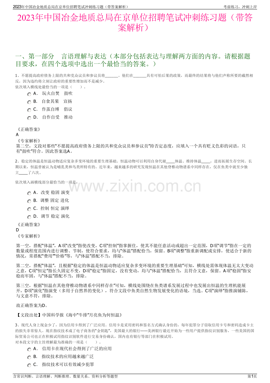 2023年中国冶金地质总局在京单位招聘笔试冲刺练习题(带答案解析)一、第一部分言语理解与表达(本部分包括表达与理解两方面的内容。请根据题目要求,在四个选项中选出一个最恰当的答案。)1、不愿提高政府债务上限的共和党众议员和参议员将_。他们在_具有可怕后果的政策,而最终的结果将与他们声称所要的截然相反,因为违约将立刻让政府的重要性增加而不是减少。依次填入横线处最恰当的一项是()。A 玩火自焚鼓吹 B 自食其果宣扬 C 作茧自缚倡议 D 自作自受推动正确答案A专家解析第二空,文段对那些“不愿提高政府债务上限的共和党众议员和参议员”持否定态度,应填入一个具有贬义色彩的词语,只有“鼓吹”符合。因此答案选A。2、稳定的体温是恒温动物适应复杂多变环境的重要生理基础。恒温动物可以利用自身代谢 体温、维持体温 ,进而拓展生存空间。长期以来,恒温曾被认为是哺乳类和鸟类所特有的。近年来,越来越多的研究发现恒温在其他脊椎动物谱系中同样存在,仅在鱼类中就至少独立 了六次。依次填入画横线部分最恰当的一项是:A改变 稳固 演变 B调整 固定 进化 C控制 恒定 演绎 D调节 稳定 演化正确答案D专家解析第一空,搭配“体温”,A项“改变”指使改变,C项“控制”指掌握住,使其不能任意活动或超出一定范围,D项“调节”指在一定的数量或程度范围内进行调整、节制,使符合要求,均与“体温”搭配恰当,保留。B项“调整”指重新调配或安排,使适合于新的情况,常搭配“费用”“价格”等,与“体温”搭配不当,排除。第二空,搭配“体温”,且根据“稳定的体温是恒温动物适应复杂多变环境的重要生理基础”可知,横线处需体现体温无太大变动之意,C项“恒定”指长久固定不变,D项“稳定”指固定,没有变动,均与“体温”搭配恰当,且符合文意,保留。A项“稳固”指安稳而牢固,与“体温”搭配不当,排除。第三空,根据“恒温在其他脊椎动物谱系中同样存在”可知,横线处围绕在鱼类谱系发展过程中也发展出恒温的生理机能展开,D项“演化”指演变(多用于自然界的变化),符合文段中鱼类自然生物发展变化的语境,当选。C项“演绎”指推演铺陈,与文意不符,排除。故正确答案为D。【文段出处】中国科学报海中“牛排”月亮鱼为何恒温3、现代人身上现金少了,因为信用卡得到了广泛应用。信用卡是采用密码和签名方式确认身份的,每年犯罪分子窃取信用卡号和密码造成卡主的损失非常惊人。现在指纹技术成了电子商务的“金钥匙”,美国最大的银行美洲银行最近开始为一些用户提供指纹识别服务,一些美国的国际贸易公司也正在积极试用指纹识别软件进行交易身份确认,国内也有银行等部门在积极试用。对本段文字的主旨理解最为准确的一项是()。A 信用卡在现代社会得到了广泛的应用 B 指纹技术的应用越来越广泛 C 指纹技术可以有效减少犯罪2023年中国冶金地质总局在京单位招聘笔试冲刺练习题(带答案解析)考前练习,冲刺上岸含常识判断、言语理解、判断推理、数量关系、资料分析等题型第1页 D 指纹技术在电子商务交易中得到了广泛的应用正确答案B专家解析文段首先通过信用卡得到了广泛应用这一现象引出现在指纹技术成了电子商务的“金钥匙”这一事实,并以多家银行采取的措施为例,意在强调指纹技术的应用愈加广泛。A项错误,文段主要叙述的是指纹技术的应用,而非信用卡;C项错误,文段未涉及指纹技术可以有效减少犯罪;文中提到的美国银行和我国银行对指纹技术的试用,但并不能据此判断指纹技术已经得到了广泛的应用,而只能说其应用将越来越广泛,因此B项正确。4、烟草暴利,暴利烟草,在市场环境下,商业利益往往限制着一些为国为民的好的政策的实施,你不让他们卖,他们就搞“袖中买卖”,正当途径行不通,他们就搞暗箱操作,限烟、禁烟令运行到实际商业买卖中往往根本行不通;利益驱动下,商业黑幕重重,法律法规被烟草业内部规则虚置在一边,法律法规最终因为厂家、商家的不配合而丧失强制力,成为他们应付的对象。本段文字主要反映了()。A 烟草暴利导致商业黑幕 B 烟草商家见利忘义,扰乱市场 C 禁烟令行而禁不止 D 执法不严,烟草泛滥正确答案C专家解析由于烟草行业存在暴利,烟草商不顾国家法律法规进行运作,导致法律法规形同虚设,没有起到应有的作用。C项正确,禁烟令实行到实际商业买卖中行不通,即“禁不止”,最符合主旨。5、经典之所以为经典,就是因为它不但历久弥新,而且常读常新。常言道,“读书百遍其义自见”,苏轼也说“故书不厌百回读,熟读深思子自知”。经典之书,不同年龄读有不同年龄的体会,不同境遇读有不同境遇的领悟。小时候背诵经典,可能还不能领会其中要旨,但是背熟了,就成为一个人知识积累的一部分,长大后在生活和工作中自然会慢慢领会其中的精髓。这就是所谓“熟读而后能悟,悟而后能用,用而后生巧,巧而后出新”的道理。这段文字主要谈论的是()。A 经典何以为经典 B 经典能常读常新 C 经典阅读具有阶段性 D 经典的精髓需慢慢领会正确答案B专家解析文段首先指出经典之所成为经典,是因为常读常新。然后通过引用名言、举例等方法来论证什么是常读常新,即不同年龄、不同境遇阅读经典会产生不同体会与领悟。由此可见,文段主要谈论的是经典具有常读