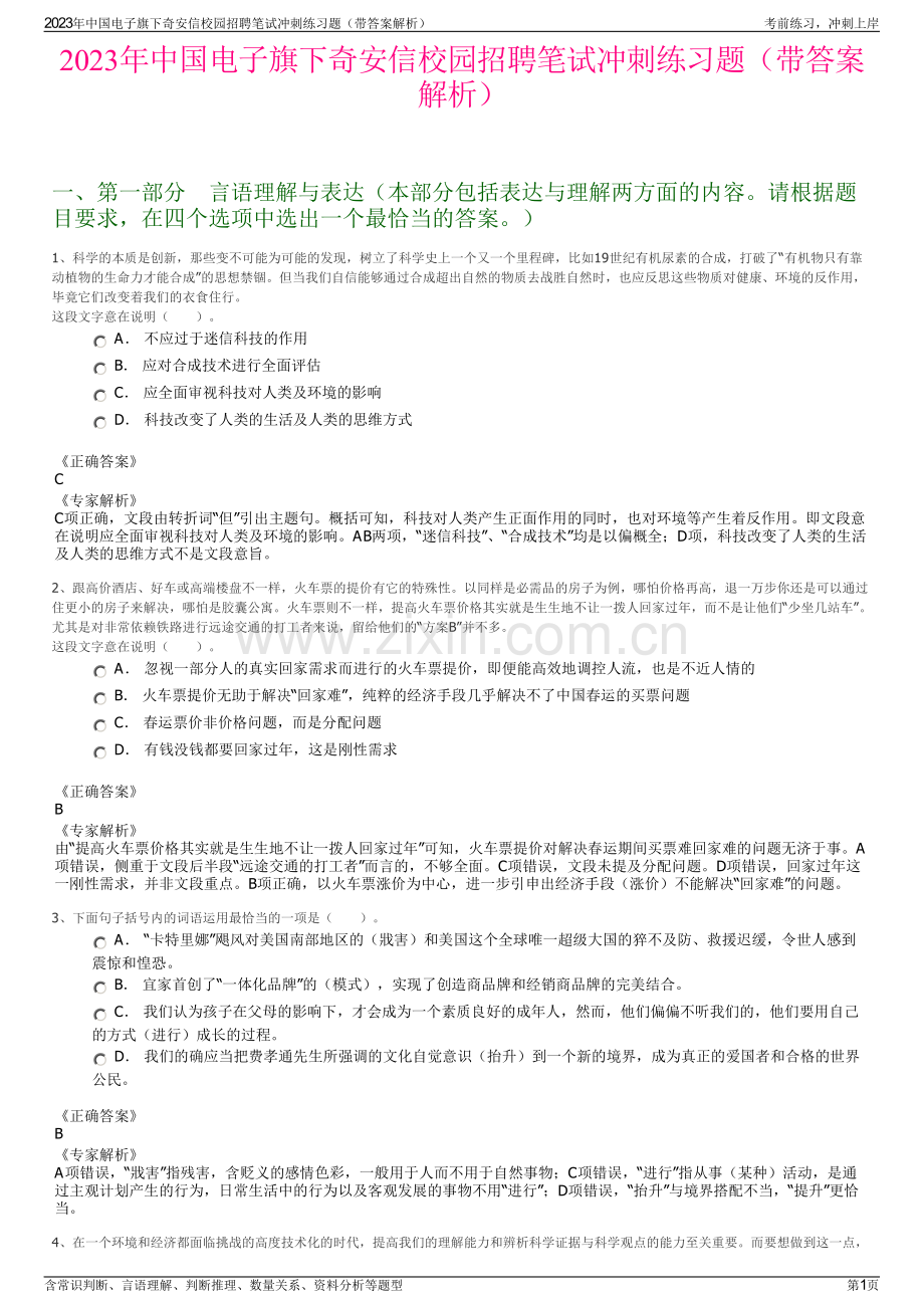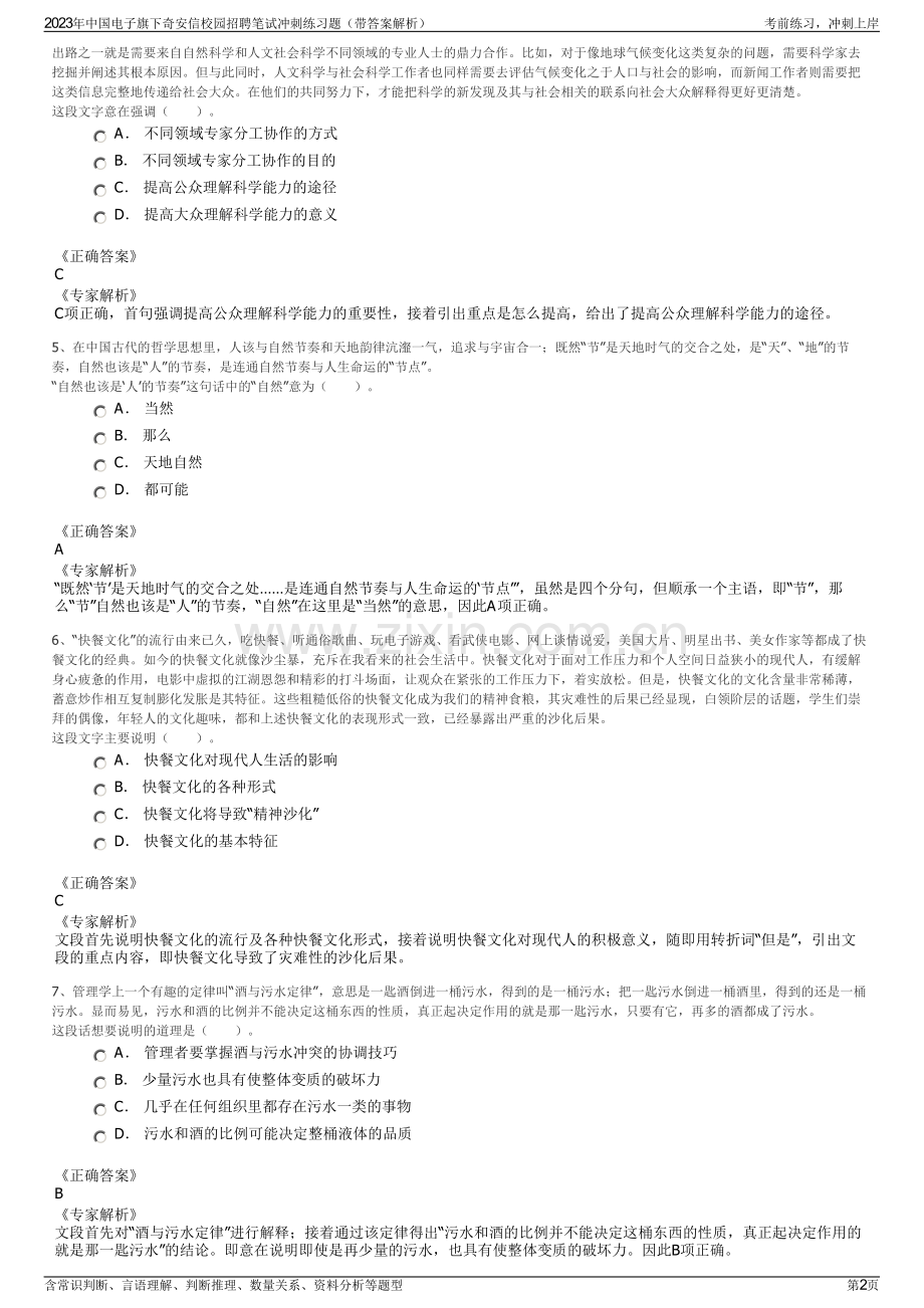 2023年中国电子旗下奇安信校园招聘笔试冲刺练习题(带答案解析)一、第一部分言语理解与表达(本部分包括表达与理解两方面的内容。请根据题目要求,在四个选项中选出一个最恰当的答案。)1、科学的本质是创新,那些变不可能为可能的发现,树立了科学史上一个又一个里程碑,比如19世纪有机尿素的合成,打破了“有机物只有靠动植物的生命力才能合成”的思想禁锢。但当我们自信能够通过合成超出自然的物质去战胜自然时,也应反思这些物质对健康、环境的反作用,毕竟它们改变着我们的衣食住行。这段文字意在说明()。A 不应过于迷信科技的作用 B 应对合成技术进行全面评估 C 应全面审视科技对人类及环境的影响 D 科技改变了人类的生活及人类的思维方式正确答案C专家解析C项正确,文段由转折词“但”引出主题句。概括可知,科技对人类产生正面作用的同时,也对环境等产生着反作用。即文段意在说明应全面审视科技对人类及环境的影响。AB两项,“迷信科技”、“合成技术”均是以偏概全;D项,科技改变了人类的生活及人类的思维方式不是文段意旨。2、跟高价酒店、好车或高端楼盘不一样,火车票的提价有它的特殊性。以同样是必需品的房子为例,哪怕价格再高,退一万步你还是可以通过住更小的房子来解决,哪怕是胶囊公寓。火车票则不一样,提高火车票价格其实就是生生地不让一拨人回家过年,而不是让他们“少坐几站车”。尤其是对非常依赖铁路进行远途交通的打工者来说,留给他们的“方案B”并不多。这段文字意在说明()。A 忽视一部分人的真实回家需求而进行的火车票提价,即便能高效地调控人流,也是不近人情的 B 火车票提价无助于解决“回家难”,纯粹的经济手段几乎解决不了中国春运的买票问题 C 春运票价非价格问题,而是分配问题 D 有钱没钱都要回家过年,这是刚性需求正确答案B专家解析由“提高火车票价格其实就是生生地不让一拨人回家过年”可知,火车票提价对解决春运期间买票难回家难的问题无济于事。A项错误,侧重于文段后半段“远途交通的打工者”而言的,不够全面。C项错误,文段未提及分配问题。D项错误,回家过年这一刚性需求,并非文段重点。B项正确,以火车票涨价为中心,进一步引申出经济手段(涨价)不能解决“回家难”的问题。3、下面句子括号内的词语运用最恰当的一项是()。A“卡特里娜”飓风对美国南部地区的(戕害)和美国这个全球唯一超级大国的猝不及防、救援迟缓,令世人感到震惊和惶恐。B 宜家首创了“一体化品牌”的(模式),实现了创造商品牌和经销商品牌的完美结合。C 我们认为孩子在父母的影响下,才会成为一个素质良好的成年人,然而,他们偏偏不听我们的,他们要用自己的方式(进行)成长的过程。D 我们的确应当把费孝通先生所强调的文化自觉意识(抬升)到一个新的境界,成为真正的爱国者和合格的世界公民。正确答案B专家解析A项错误,“戕害”指残害,含贬义的感情色彩,一般用于人而不用于自然事物;C项错误,“进行”指从事(某种)活动,是通过主观计划产生的行为,日常生活中的行为以及客观发展的事物不用“进行”;D项错误,“抬升”与境界搭配不当,“提升”更恰当。4、在一个环境和经济都面临挑战的高度技术化的时代,提高我们的理解能力和辨析科学证据与科学观点的能力至关重要。而要想做到这一点,2023年中国电子旗下奇安信校园招聘笔试冲刺练习题(带答案解析)考前练习,冲刺上岸含常识判断、言语理解、判断推理、数量关系、资料分析等题型第1页出路之一就是需要来自自然科学和人文社会科学不同领域的专业人士的鼎力合作。比如,对于像地球气候变化这类复杂的问题,需要科学家去挖掘并阐述其根本原因。但与此同时,人文科学与社会科学工作者也同样需要去评估气候变化之于人口与社会的影响,而新闻工作者则需要把这类信息完整地传递给社会大众。在他们的共同努力下,才能把科学的新发现及其与社会相关的联系向社会大众解释得更好更清楚。这段文字意在强调()。A 不同领域专家分工协作的方式 B 不同领域专家分工协作的目的 C 提高公众理解科学能力的途径 D 提高大众理解科学能力的意义正确答案C专家解析C项正确,首句强调提高公众理解科学能力的重要性,接着引出重点是怎么提高,给出了提高公众理解科学能力的途径。5、在中国古代的哲学思想里,人该与自然节奏和天地韵律沆瀣一气,追求与宇宙合一;既然“节”是天地时气的交合之处,是“天”、“地”的节奏,自然也该是“人”的节奏,是连通自然节奏与人生命运的“节点”。“自然也该是人的节奏”这句话中的“自然”意为()。A 当然 B 那么 C 天地自然 D 都可能正确答案A专家解析“既然节是天地时气的交合之处是连通自然节奏与人生命运的节点”,虽然是四个分句,但顺承一个主语,即“节”,那么“节”自然也该是“人”的节奏,“自然”在这里是“当然”的意思,因此A项正确。6、“快餐文化”的流行由来已久,吃快餐、听通俗歌曲、玩电子游戏、看武侠电影、网上谈情说爱,美国大片、明星出书、美女作家等都成了快餐文化的经典。如今的快餐文化就像沙尘暴,充斥在我看来的社会生活中。快餐文化对于面对工作压力和个人空间日益狭小的现代人,有缓解身心疲惫的作用,电影中虚拟的江湖恩怨和精