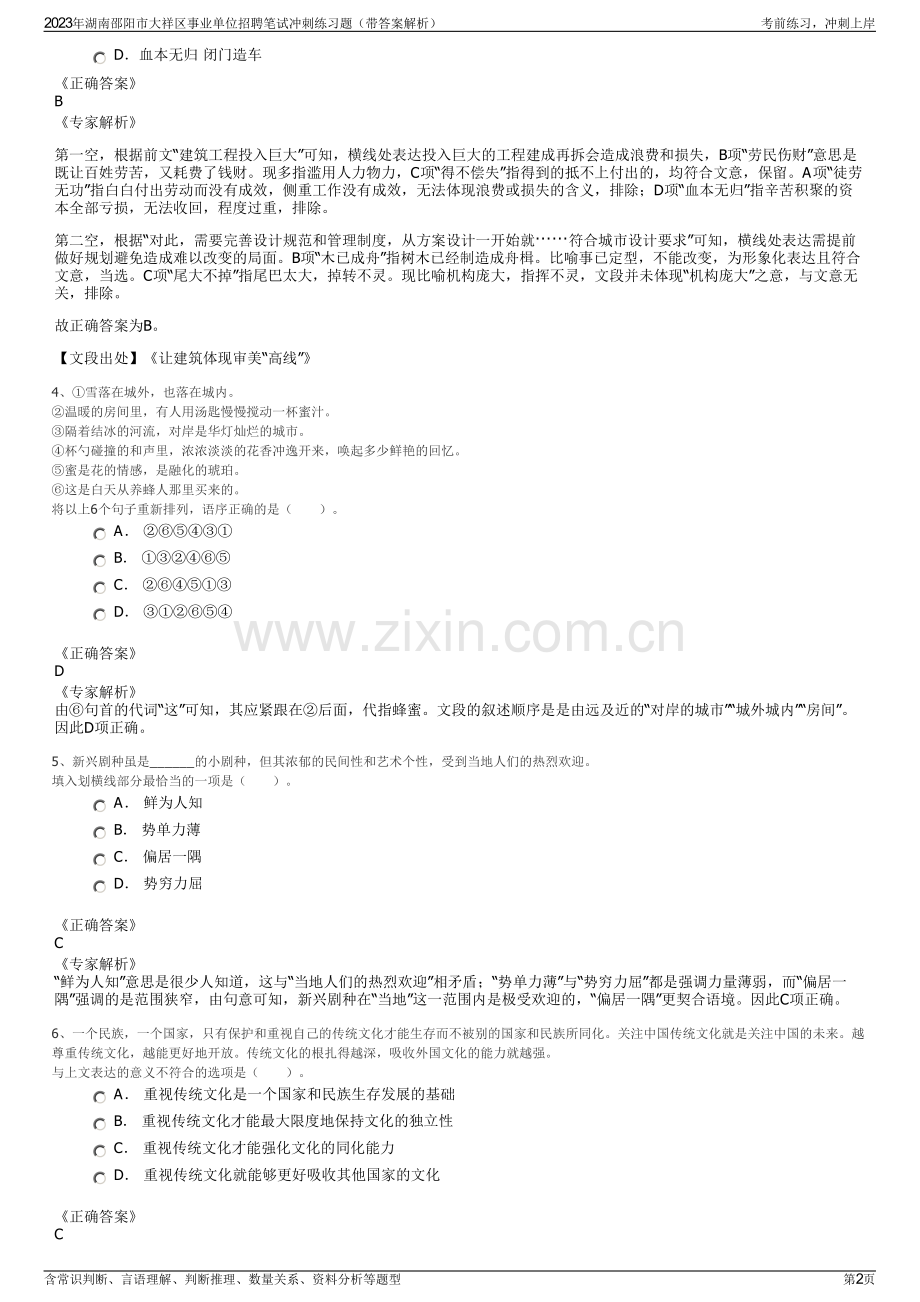 2023年湖南邵阳市大祥区事业单位招聘笔试冲刺练习题(带答案解析)一、第一部分言语理解与表达(本部分包括表达与理解两方面的内容。请根据题目要求,在四个选项中选出一个最恰当的答案。)1、如果发现一个好产品或者一个大市场,就应该立即跟进;在跟进中发现现有产品的缺陷,然后通过创新弥补缺陷,超越对手,实现后来者居上。当然,创新的目标是创造,而不是简单模仿。因此,创造性模仿者需要通过对他人创意的了解,重新组合、改良而产生具有不同功能与价值的新东西。事实上,所有的产品,除了第一代是原创的,以后的进步都是通过创造性模仿来实现的。这段文字旨在说明()。A 创造性模仿是改良产品的主要途径 B 通过不断地改善就能得到新的产品 C 创新来源于对现有产品缺陷的弥补 D 大部分产品都是通过模仿来完成的正确答案A专家解析文段首先指出如何进行创新,接着说明创新的目标是创造,而不是简单模仿,概括出创造性模仿的含义。最后说明除了第一代是原创产品外,其他产品都是创造性模仿。因此答案选A。2、制止网络暴力,加强、完善相关制度性建设刻不容缓。,每一个口出恶言之人都是推动网暴潮水前进的一部分。反过来讲,在评判热点人物和事件时保持善意和理智,哪怕只是做到少说不说,这样的人每多一个,抵御网暴的堤坝就能高一分。填入画横线部分最恰当的一项是:A人言籍籍 B众口铄金 C三人成虎 D流言蜚语正确答案B专家解析依据后文“每一个口出恶言之人都是推动网暴潮水前进的一部分”可知,文段强调对于网络暴力而言,每一个人说的话都会产生巨大的影响。B项“众口铄金”形容众人的言论能够熔化金属,比喻舆论影响的强大,符合文意,当选。A项“人言籍籍”指人们议论纷纷,与文段“推动网暴潮水前进”无法对应,未能体现出参与网络暴力的每一个个体作用大的语义,排除;C项“三人成虎”比喻谣言或讹传一再重复,就会使人把谣言当成事实,文段并未讨论谣言和事实的关系,排除;D项“流言蜚语”指毫无根据的话,与文段“推动网暴潮水前进”无法对应,未能体现出参与网络暴力的每一个个体作用大的语义,排除。故正确答案为B。【文段出处】光明日报每个人都是抵御“网暴潮水”的一份子3、建筑工程投入巨大,一旦建成再做拆改可谓 。对此,需要完善设计规范和管理制度,从方案设计一开始就强化监管审核,确保建筑物在形体、色彩、体量、高度和空间环境等方面符合城市设计要求,避免陷入“”的窘境,最大程度地维护公共利益。依次填入画横线部分最恰当的一项是:A徒劳无功 覆水难收 B劳民伤财 木已成舟 C得不偿失 尾大不掉2023年湖南邵阳市大祥区事业单位招聘笔试冲刺练习题(带答案解析)考前练习,冲刺上岸含常识判断、言语理解、判断推理、数量关系、资料分析等题型第1页 D血本无归 闭门造车正确答案B专家解析第一空,根据前文“建筑工程投入巨大”可知,横线处表达投入巨大的工程建成再拆会造成浪费和损失,B项“劳民伤财”意思是既让百姓劳苦,又耗费了钱财。现多指滥用人力物力,C项“得不偿失”指得到的抵不上付出的,均符合文意,保留。A项“徒劳无功”指白白付出劳动而没有成效,侧重工作没有成效,无法体现浪费或损失的含义,排除;D项“血本无归”指辛苦积聚的资本全部亏损,无法收回,程度过重,排除。第二空,根据“对此,需要完善设计规范和管理制度,从方案设计一开始就符合城市设计要求”可知,横线处表达需提前做好规划避免造成难以改变的局面。B项“木已成舟”指树木已经制造成舟楫。比喻事已定型,不能改变,为形象化表达且符合文意,当选。C项“尾大不掉”指尾巴太大,掉转不灵。现比喻机构庞大,指挥不灵,文段并未体现“机构庞大”之意,与文意无关,排除。故正确答案为B。【文段出处】让建筑体现审美“高线”4、雪落在城外,也落在城内。温暖的房间里,有人用汤匙慢慢搅动一杯蜜汁。隔着结冰的河流,对岸是华灯灿烂的城市。杯勺碰撞的和声里,浓浓淡淡的花香冲逸开来,唤起多少鲜艳的回忆。蜜是花的情感,是融化的琥珀。这是白天从养蜂人那里买来的。将以上6个句子重新排列,语序正确的是()。A B C D 正确答案D专家解析由句首的代词“这”可知,其应紧跟在后面,代指蜂蜜。文段的叙述顺序是是由远及近的“对岸的城市”“城外城内”“房间”。因此D项正确。5、新兴剧种虽是_的小剧种,但其浓郁的民间性和艺术个性,受到当地人们的热烈欢迎。填入划横线部分最恰当的一项是()。A 鲜为人知 B 势单力薄 C 偏居一隅 D 势穷力屈正确答案C专家解析“鲜为人知”意思是很少人知道,这与“当地人们的热烈欢迎”相矛盾;“势单力薄”与“势穷力屈”都是强调力量薄弱,而“偏居一隅”强调的是范围狭窄,由句意可知,新兴剧种在“当地”这一范围内是极受欢迎的,“偏居一隅”更契合语境。因此C项正确。6、一个民族,一个国家,只有保护和重视自己的传统文化才能生存而不被别的国家和民族所同化。关注中国传统文化就是关注中国的未来。越尊重传统文化,越能更好地开放。传统文化的根扎得越深,吸收外国文化的能力就越强。与上文表达的意义不符合的选项是()。A 重视传统文化是一个国家和民族生存发展的基础 B 重视传统文化才能最大限度地保持文化的独立性 C 重视传统文化