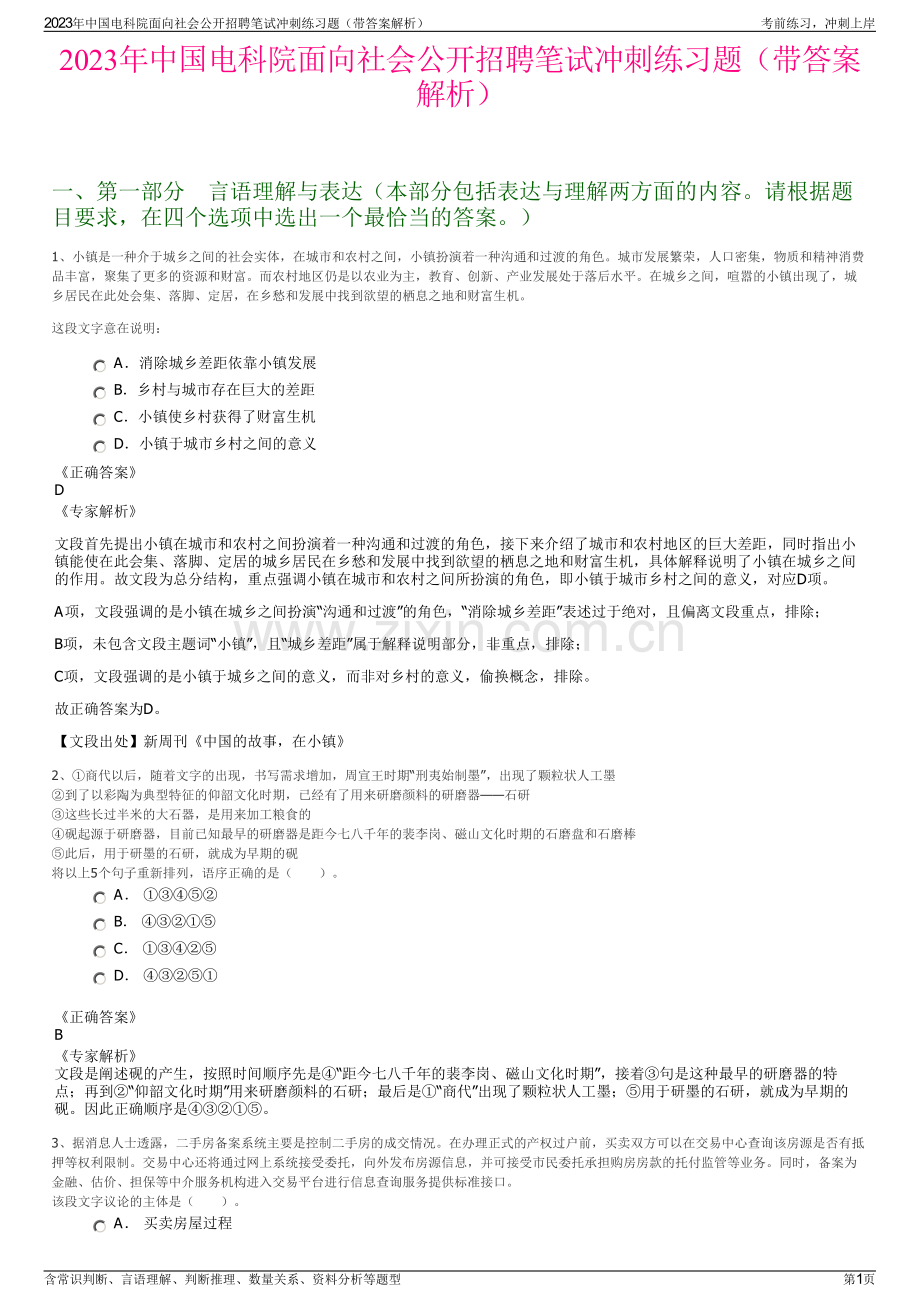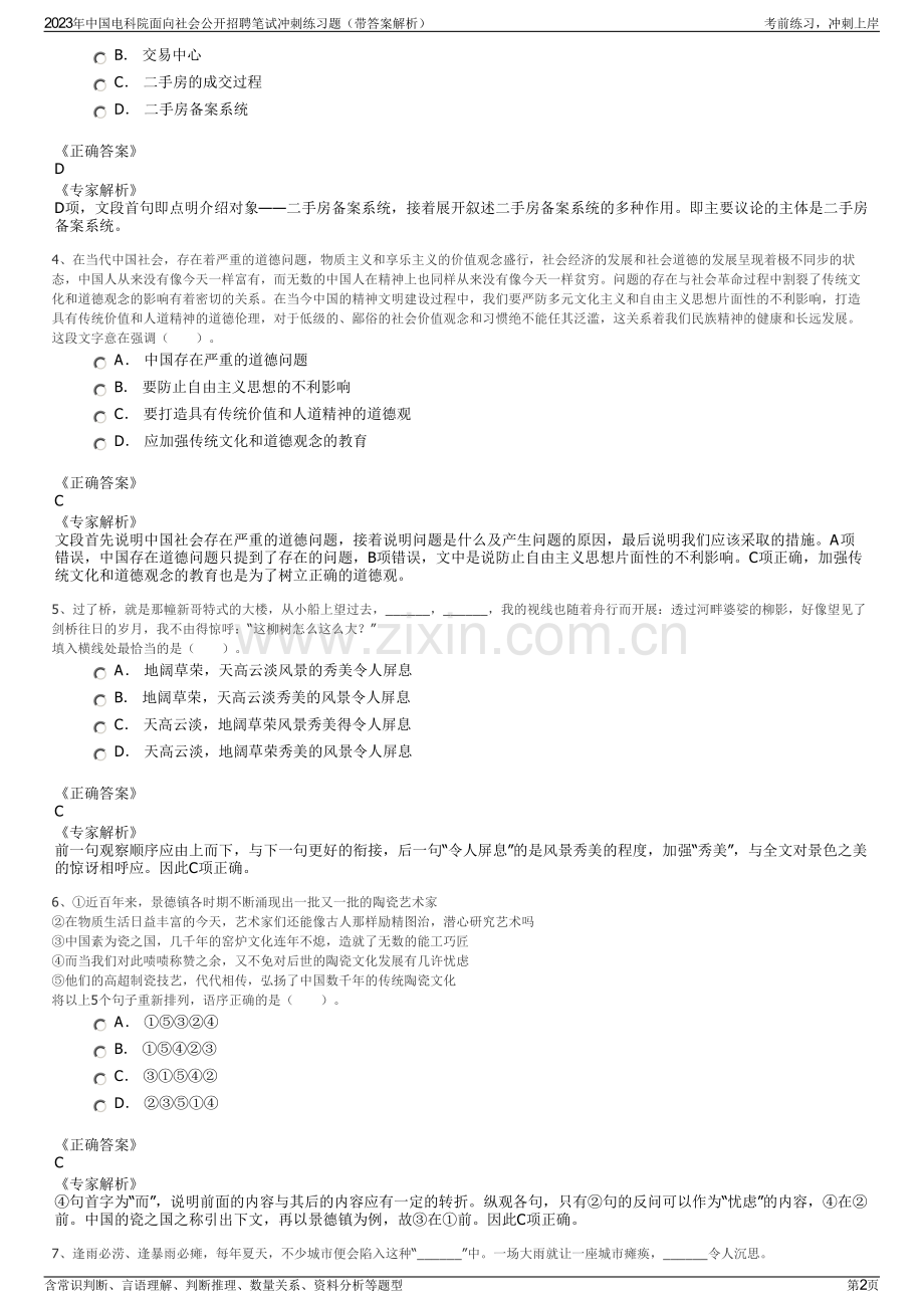 2023年中国电科院面向社会公开招聘笔试冲刺练习题(带答案解析)一、第一部分言语理解与表达(本部分包括表达与理解两方面的内容。请根据题目要求,在四个选项中选出一个最恰当的答案。)1、小镇是一种介于城乡之间的社会实体,在城市和农村之间,小镇扮演着一种沟通和过渡的角色。城市发展繁荣,人口密集,物质和精神消费品丰富,聚集了更多的资源和财富。而农村地区仍是以农业为主,教育、创新、产业发展处于落后水平。在城乡之间,喧嚣的小镇出现了,城乡居民在此处会集、落脚、定居,在乡愁和发展中找到欲望的栖息之地和财富生机。这段文字意在说明:A消除城乡差距依靠小镇发展 B乡村与城市存在巨大的差距 C小镇使乡村获得了财富生机 D小镇于城市乡村之间的意义正确答案D专家解析文段首先提出小镇在城市和农村之间扮演着一种沟通和过渡的角色,接下来介绍了城市和农村地区的巨大差距,同时指出小镇能使在此会集、落脚、定居的城乡居民在乡愁和发展中找到欲望的栖息之地和财富生机,具体解释说明了小镇在城乡之间的作用。故文段为总分结构,重点强调小镇在城市和农村之间所扮演的角色,即小镇于城市乡村之间的意义,对应D项。A项,文段强调的是小镇在城乡之间扮演“沟通和过渡”的角色,“消除城乡差距”表述过于绝对,且偏离文段重点,排除;B项,未包含文段主题词“小镇”,且“城乡差距”属于解释说明部分,非重点,排除;C项,文段强调的是小镇于城乡之间的意义,而非对乡村的意义,偷换概念,排除。故正确答案为D。【文段出处】新周刊中国的故事,在小镇2、商代以后,随着文字的出现,书写需求增加,周宣王时期“刑夷始制墨”,出现了颗粒状人工墨到了以彩陶为典型特征的仰韶文化时期,已经有了用来研磨颜料的研磨器石研这些长过半米的大石器,是用来加工粮食的砚起源于研磨器,目前已知最早的研磨器是距今七八千年的裴李岗、磁山文化时期的石磨盘和石磨棒此后,用于研墨的石研,就成为早期的砚将以上5个句子重新排列,语序正确的是()。A B C D 正确答案B专家解析文段是阐述砚的产生,按照时间顺序先是“距今七八千年的裴李岗、磁山文化时期”,接着句是这种最早的研磨器的特点;再到“仰韶文化时期”用来研磨颜料的石研;最后是“商代”出现了颗粒状人工墨;用于研墨的石研,就成为早期的砚。因此正确顺序是。3、据消息人士透露,二手房备案系统主要是控制二手房的成交情况。在办理正式的产权过户前,买卖双方可以在交易中心查询该房源是否有抵押等权利限制。交易中心还将通过网上系统接受委托,向外发布房源信息,并可接受市民委托承担购房房款的托付监管等业务。同时,备案为金融、估价、担保等中介服务机构进入交易平台进行信息查询服务提供标准接口。该段文字议论的主体是()。A 买卖房屋过程2023年中国电科院面向社会公开招聘笔试冲刺练习题(带答案解析)考前练习,冲刺上岸含常识判断、言语理解、判断推理、数量关系、资料分析等题型第1页 B 交易中心 C 二手房的成交过程 D 二手房备案系统正确答案D专家解析D项,文段首句即点明介绍对象二手房备案系统,接着展开叙述二手房备案系统的多种作用。即主要议论的主体是二手房备案系统。4、在当代中国社会,存在着严重的道德问题,物质主义和享乐主义的价值观念盛行,社会经济的发展和社会道德的发展呈现着极不同步的状态,中国人从来没有像今天一样富有,而无数的中国人在精神上也同样从来没有像今天一样贫穷。问题的存在与社会革命过程中割裂了传统文化和道德观念的影响有着密切的关系。在当今中国的精神文明建设过程中,我们要严防多元文化主义和自由主义思想片面性的不利影响,打造具有传统价值和人道精神的道德伦理,对于低级的、鄙俗的社会价值观念和习惯绝不能任其泛滥,这关系着我们民族精神的健康和长远发展。这段文字意在强调()。A 中国存在严重的道德问题 B 要防止自由主义思想的不利影响 C 要打造具有传统价值和人道精神的道德观 D 应加强传统文化和道德观念的教育正确答案C专家解析文段首先说明中国社会存在严重的道德问题,接着说明问题是什么及产生问题的原因,最后说明我们应该采取的措施。A项错误,中国存在道德问题只提到了存在的问题,B项错误,文中是说防止自由主义思想片面性的不利影响。C项正确,加强传统文化和道德观念的教育也是为了树立正确的道德观。5、过了桥,就是那幢新哥特式的大楼,从小船上望过去,_,_,我的视线也随着舟行而开展:透过河畔婆娑的柳影,好像望见了剑桥往日的岁月,我不由得惊呼:“这柳树怎么这么大?”填入横线处最恰当的是()。A 地阔草荣,天高云淡风景的秀美令人屏息 B 地阔草荣,天高云淡秀美的风景令人屏息 C 天高云淡,地阔草荣风景秀美得令人屏息 D 天高云淡,地阔草荣秀美的风景令人屏息正确答案C专家解析前一句观察顺序应由上而下,与下一句更好的衔接,后一句“令人屏息”的是风景秀美的程度,加强“秀美”,与全文对景色之美的惊讶相呼应。因此C项正确。6、近百年来,景德镇各时期不断涌现出一批又一批的陶瓷艺术家在物质生活日益丰富的今天,艺术家们还能像古人那样励精图治,潜心研究艺术吗中国素为瓷之国,几千年的窑炉文化连年不熄,造就了无数的能