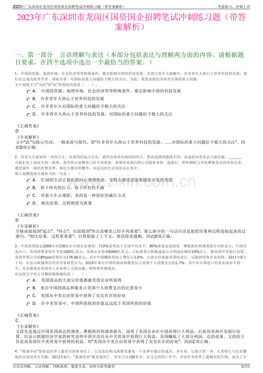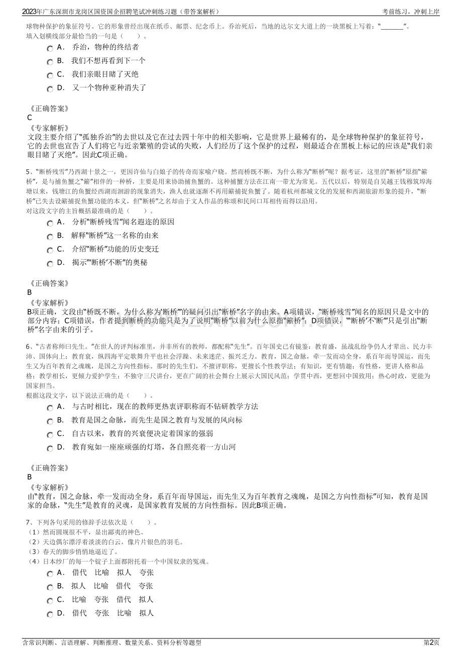 2023年广东深圳市龙岗区国资国企招聘笔试冲刺练习题(带答案解析)一、第一部分言语理解与表达(本部分包括表达与理解两方面的内容。请根据题目要求,在四个选项中选出一个最恰当的答案。)1、中国的资源、地理环境、社会经济等等特殊条件,都会影响中国的科技发展。在我与青年人接触中,许多青年人热心于世界科技的发展,他们有志成为世界学者、国际学者,对国际的重大问题给予极大的关注。为此,我要求他们多研究中国的重大问题。文中划线文字“为此”的“此”所指的内容是()。A 中国的资源、地理环境、社会经济等等特殊条件,都会影响中国的科技发展 B 许多青年人热心于世界科技的发展 C 许多青年人对国际的重大问题给予极大的关注 D 许多青年人热心于世界科技的发展,对国际的重大问题给予极大的关注正确答案D专家解析文中“此”为指示代词,一般承前句指代,即“许多青年人热心于世界科技的发展,对国际的重大问题给予极大的关注”。因此D项正确。2、其实人生就如同一列列火车,从相同的起点出发,最终也将奔向相同的终点。然而选择的路线不同,沿途的风景也会大相径庭。_。当我们坐上绿皮车的一刹那,也许终点是哪里已经不再重要,重要的是我们的心灵随着身体一起旅行,聆听钢轨与车轮摩擦发出的美妙乐章,感受窗外一路的青葱苍翠,相比大都市的繁华,田园式的生活却也乐在其中。填入划横线部分最恰当的一句是()。A 忙碌的生活让我们的内心变得焦虑,无暇去感受沿途那随处可见的美景 B 卸下所有的压力,放下所有的不满 C 坐着火车去漫游,真的是一种很好的减压方式 D 相比结果,过程则更为重要正确答案D专家解析空格前面提到“起点”、“终点”,后面提到“终点是哪里已经不再重要”,那么缺少的一句话应该是能把结果和过程连接起来的过渡句,“相比结果,过程更重要”,自然衔接了上下文,使语段更通顺。因此D项正确。3、中国美国商会2008年对238家在中国企业调查,710%获利高于全球平均水平,80%准备追加投资。摩根斯坦利调查报告分析显示:中国对美出口,美国消费者每年节省1000亿美元,美国企业获利6000亿美元,占标准普尔指数涵盖公司利润总额的10%以上。据亚洲开发银行估算,美国苹果公司的iPhone零售价为178.96美元,其中中国赚取的加工费仅占3.6%,大部分价值被美国的设计、运销和零售企业获得。2011年8月上旬,旧金山联储两位经济学家研究认为,2010年来自中国的商品和服务仅占美国个人消费支出的2.7%,其中从中国进口的真实成本不到一半,其余都来自美国本土企业和工人的运输、销售和营销成本。对这段文字的主旨概括最准确的是()。A 美国商品的大部分价值都被美国企业所获得 B 来自中国的商品和服务占美国个人消费支出的比重很小 C 美国从中美自由贸易中获得了实实在在的好处 D 在中美贸易中,中国所获取的价值远远低于美国所获的价值正确答案C专家解析文段先是通过中国美国商会的调查、摩根斯坦利调查报告,说明了美国企业在中国获得巨大利益,后面用亚洲开发银行估算、旧金山联储经济学家的研究说明中国并没有从中关贸易中获得巨大利益,美国赚取了大部分利润。总的说来,文段的主旨是说美国在中美贸易中获得的利益,即“美国从中美自由贸易中获得了实实在在的好处”。因此C项正确。4、“孤独乔治”恐怕是世界上最有名的单身汉了,它是加拉帕戈斯群岛象龟一个亚种中最后的成员,多年来,它都孑然一身,人类将它与近亲繁殖的尝试也终告失败。2012年6月,“孤独乔治”被发现死亡,享年已达100多岁。在过去的四十年中,乔治作为世界上最稀有的生物,成为了全2023年广东深圳市龙岗区国资国企招聘笔试冲刺练习题(带答案解析)考前练习,冲刺上岸含常识判断、言语理解、判断推理、数量关系、资料分析等题型第1页球物种保护的象征符号。它的形象曾经出现在纸币、邮票、纪念币上。乔治死后,当地的达尔文大道上的一块黑板上写着:“_”。填入划横线部分最恰当的一句是()。A 乔治,物种的终结者 B 我们不想再看到下一个 C 我们亲眼目睹了灭绝 D 又一个物种亚种消失了正确答案C专家解析文段主要介绍了“孤独乔治”的去世以及它在过去四十年中的相关影响,它是世界上最稀有的,是全球物种保护的象征符号,它的去世也宣告了人们将它与近亲繁殖的尝试的失败,人们经历了这个保护的过程,则最适合在黑板上标记的应该是“我们亲眼目睹了灭绝”。因此C项正确。5、“断桥残雪”乃西湖十景之一,更因许仙与白娘子的传奇而家喻户晓。然而桥既不断,为什么称为“断桥”呢?据考证,这里的“断桥”原指“簖桥”,是与捕鱼蟹之“簖”相伴的一种桥,主要是用来协助捕鱼蟹的。这种捕蟹方法在江南一带尤为常见。五代以后,特别是自吴越王钱穆筑埠海塘以来,钱塘江的鱼蟹经西湖而洄游的现象消失,渔人也就逐渐不再用簖捕捉鱼蟹了。随着杭州都城文化的发展和西湖旅游形象的提升,“断桥”已失去设簖捕捉鱼蟹功能的本义,但“断桥”之名却由于文人作品的称颂和民间口耳相传而得以沿用。对这段文字的主旨概括最准确的是()。A 分析“断桥残雪”闻名遐迩的原因 B 解释“断桥”这一名称的由来 C 介绍“断桥”功能的历史变迁 D 揭示“断桥不断”的奥秘正确答案B专家解析B项正确,文段由“桥既
