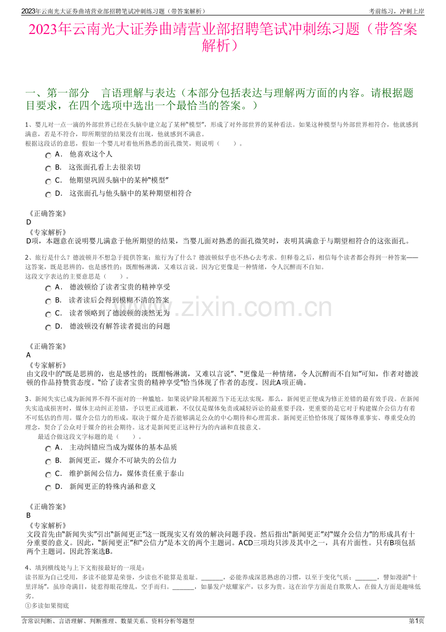 2023年云南光大证券曲靖营业部招聘笔试冲刺练习题(带答案解析)一、第一部分言语理解与表达(本部分包括表达与理解两方面的内容。请根据题目要求,在四个选项中选出一个最恰当的答案。)1、婴儿对一点一滴的外部世界已经在头脑中建立起了某种“模型”,形成了对外部世界的某种看法。如果这种模型与外部世界相符合,他就感到满意,若是不符合,即所期望的结果没有出现,他就感到不满意。根据这段话的意思,假如一个婴儿对着他所熟悉的面孔微笑,则说明()。A 他喜欢这个人 B 这张面孔看上去很亲切 C 他期望巩固头脑中的某种“模型”D 这张面孔与他头脑中的某种期望相符合正确答案D专家解析D项,本题意在说明婴儿满意于他所期望的结果,当婴儿面对熟悉的面孔微笑时,表明其满意于与期望相符合的这张面孔。2、旅行是什么?德波顿并不想急于提供答案;旅行为了什么?德波顿似乎也不热心去考求。但释卷之后,相信每个读者都会得到一种答案这答案,既是思辨的,也是感性的;既酣畅淋漓,又难以言说。因为它更像是一种情绪,令人沉醉而不自知。这段文字表达的主要意思是()。A 德波顿给了读者宝贵的精神享受 B 读者读后会得到模糊不清的答案 C 读者领略到了德波顿的淡然无为 D 德波顿没有解答读者提出的问题正确答案A专家解析由文段中的“既是思辨的,也是感性的;既酣畅淋漓,又难以言说”、“更像是一种情绪,令人沉醉而不自知”可知,作者对德波顿的作品持赞赏态度。“给了读者宝贵的精神享受”恰当体现了作者的态度。因此A项正确。3、新闻失实已成为新闻界不得不面对的一种尴尬。如果说铲除其根源当下还无法实现,那么,新闻更正便成为修正差错的最有效手段。在新闻失实造成损害时,媒体主动纠正差错,予以更正或道歉,不仅仅是媒体免责或减轻诉讼的最重要手段,更重要的是它对于构建媒介公信力有着不可低估的作用。媒介公信力的形成,取决于媒介是否能够满足公众的中心期待和心理需求。新闻更正恰恰体现了媒体尊重事实、尊重受众的理念,契合了公众对于媒介的社会期待。这才是新闻更正这种行为的内涵和直接意义。最适合做这段文字标题的是()。A 主动纠错应当成为媒体的基本品质 B 新闻更正,媒介不可缺失的公信力 C 维护新闻公信力,媒体责任重于泰山 D 新闻更正的特殊内涵和意义正确答案B专家解析文段首先由“新闻失实”引出“新闻更正”这一既现实又有效的解决问题手段。然后指出“新闻更正”对“媒介公信力”的形成具有十分重要的意义。因此,“新闻更正”和“公信力”是本文的两个主题词。ACD三项均只涉及其中之一,具有片面性。只有B项包括两个主题词。因此答案选B。4、填到横线处与上下文衔接最好的一项是:读书原为自己受用,多读不能算是荣誉,少读也不能算是羞耻。_,必能养成深思熟虑的习惯,以至于变化气质;_,譬如漫游“十里洋场”,虽珍奇满目,徒惹得眼花缭乱,空手而归。_,如暴发户炫耀家产,以多为贵。这在治学方面是自欺欺人,在做人方面是趣味低劣。多读如果彻底2023年云南光大证券曲靖营业部招聘笔试冲刺练习题(带答案解析)考前练习,冲刺上岸含常识判断、言语理解、判断推理、数量关系、资料分析等题型第1页少读如果彻底多读而不求甚解少读而不求甚解世间许多人读书只为装点门面世间许多读书人只为点缀门面 A B C D 正确答案A专家解析由第一句可知,短文涉及两个方面:“多读”和“少读”,作者通过对两者比较而提出观点。所以紧跟其后的分句也必是一句说“多读”,一句谈“少读”。第二空,“十里洋场”、“珍奇满目”、“眼花缭乱”突出的是一个“多”字,所以应该是“多读”,又由“空手而归”可知,应选即“多读而不求甚解”。第一空,与相对应的是,所以这里应填。第三空,全段文字谈论的都是“读书”,而不是“读书人”,所以应填。因此A项正确。5、填入下面横线处的句子,与上下文衔接最恰当的一组是()。我独坐在书斋中,忘记了尘世间一切不愉快的事情,怡然自得。以世界之广,宇宙之大,此时却仿佛只有我和我的书友存在。_,_,_,_。阳光照在玉兰花的肥大的绿叶子上连平常我喜欢听的鸟鸣声“光棍好过”,也听而不闻了窗外粼粼碧水,丝丝垂柳这都是我平常最喜爱的东西,现在也都视而不见了 A B C D 正确答案A专家解析句是一个总结句,应放在之后。句有关联词“连也”表递进关系,应放在句后边。另外句点明了是在“窗外”,而句“阳光照在玉兰花的肥大的绿叶子上”写的也是窗外的景物,故句应该接在句后面。因此A项正确。6、课堂教学对话是平等的对话,是打破了时空_的精神对话,是心灵的交流与撞击。对话,要求师生之间有共同的话题,这样才能引起心灵的感动与_。依次填入横线处最恰当的一项是()。A 界限共鸣 B 分界震撼 C 界线共振 D 阻隔震颤正确答案A专家解析第一空,“界限”多用于抽象事物,而“界线”多用于具体事物;时空是抽象事物,应填入“界限”。第二空,“震颤”是指颤动或因惊恐、畏惧而战粟。前文提到了“共同的话题”,“共鸣”能够与前文相照应。因此答案选A。7、中国当今的家庭教育可能是世界上最糟糕的家庭教育,出现了种种误区,这些误区并非今天才有。近代以来,传承千年的教育体系逐渐断裂,走上了另外一面。从1905年废科举之后,教