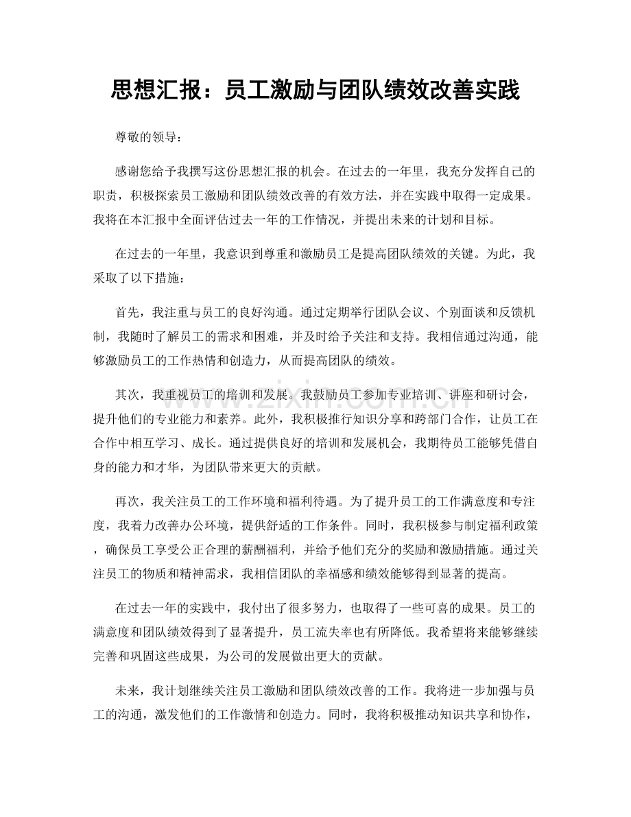 感谢您给予我撰写这份思想汇报的机会。在过去的一年里,我充分发挥自己的职责,积极探索员工激励和团队绩效改善的有效方法,并在实践中取得一定成果。我将在本汇报中全面评估过去一年的工作情况,并提出未来的计划和目标。