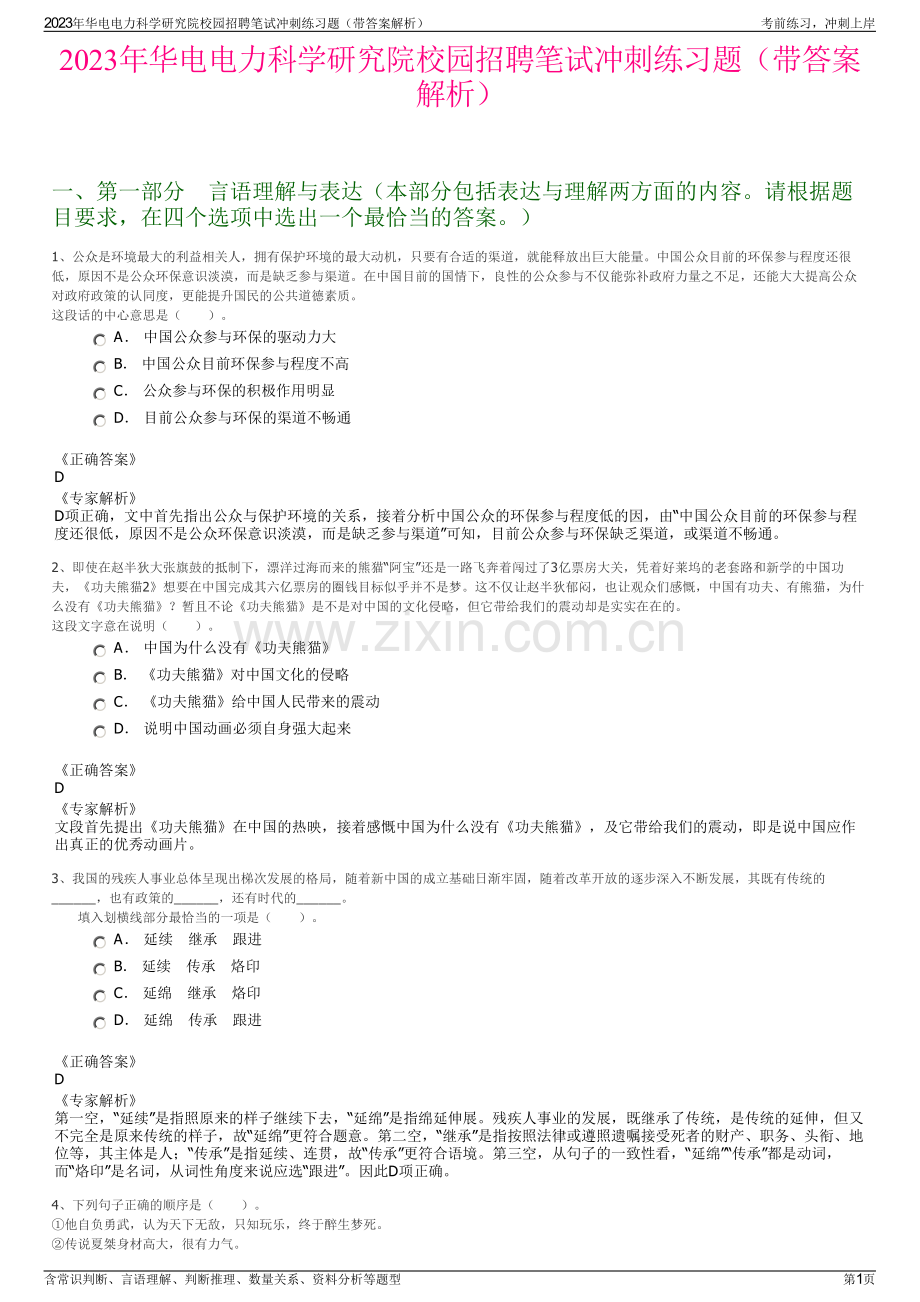 2023年华电电力科学研究院校园招聘笔试冲刺练习题(带答案解析)一、第一部分言语理解与表达(本部分包括表达与理解两方面的内容。请根据题目要求,在四个选项中选出一个最恰当的答案。)1、公众是环境最大的利益相关人,拥有保护环境的最大动机,只要有合适的渠道,就能释放出巨大能量。中国公众目前的环保参与程度还很低,原因不是公众环保意识淡漠,而是缺乏参与渠道。在中国目前的国情下,良性的公众参与不仅能弥补政府力量之不足,还能大大提高公众对政府政策的认同度,更能提升国民的公共道德素质。这段话的中心意思是()。A 中国公众参与环保的驱动力大 B 中国公众目前环保参与程度不高 C 公众参与环保的积极作用明显 D 目前公众参与环保的渠道不畅通正确答案D专家解析D项正确,文中首先指出公众与保护环境的关系,接着分析中国公众的环保参与程度低的因,由“中国公众目前的环保参与程度还很低,原因不是公众环保意识淡漠,而是缺乏参与渠道”可知,目前公众参与环保缺乏渠道,或渠道不畅通。2、即使在赵半狄大张旗鼓的抵制下,漂洋过海而来的熊猫“阿宝”还是一路飞奔着闯过了3亿票房大关,凭着好莱坞的老套路和新学的中国功夫,功夫熊猫2想要在中国完成其六亿票房的圈钱目标似乎并不是梦。这不仅让赵半狄郁闷,也让观众们感慨,中国有功夫、有熊猫,为什么没有功夫熊猫?暂且不论功夫熊猫是不是对中国的文化侵略,但它带给我们的震动却是实实在在的。这段文字意在说明()。A 中国为什么没有功夫熊猫 B 功夫熊猫对中国文化的侵略 C 功夫熊猫给中国人民带来的震动 D 说明中国动画必须自身强大起来正确答案D专家解析文段首先提出功夫熊猫在中国的热映,接着感慨中国为什么没有功夫熊猫,及它带给我们的震动,即是说中国应作出真正的优秀动画片。3、我国的残疾人事业总体呈现出梯次发展的格局,随着新中国的成立基础日渐牢固,随着改革开放的逐步深入不断发展,其既有传统的_,也有政策的_,还有时代的_。填入划横线部分最恰当的一项是()。A 延续继承跟进 B 延续传承烙印 C 延绵继承烙印 D 延绵传承跟进正确答案D专家解析第一空,“延续”是指照原来的样子继续下去,“延绵”是指绵延伸展。残疾人事业的发展,既继承了传统,是传统的延伸,但又不完全是原来传统的样子,故“延绵”更符合题意。第二空,“继承”是指按照法律或遵照遗嘱接受死者的财产、职务、头衔、地位等,其主体是人;“传承”是指延续、连贯,故“传承”更符合语境。第三空,从句子的一致性看,“延绵”“传承”都是动词,而“烙印”是名词,从词性角度来说应选“跟进”。因此D项正确。4、下列句子正确的顺序是()。他自负勇武,认为天下无敌,只知玩乐,终于醉生梦死。传说夏桀身材高大,很有力气。2023年华电电力科学研究院校园招聘笔试冲刺练习题(带答案解析)考前练习,冲刺上岸含常识判断、言语理解、判断推理、数量关系、资料分析等题型第1页就在夏桀众叛亲离的同时,东部商部落日益强大,见到桀如此无道,起兵灭夏。直到商兵杀到京城,夏桀才如梦初醒,逃向鸣条。同时夏朝与周围方国矛盾也相当激烈。A B C D 正确答案C专家解析首先是主人公出场,然后对其展开介绍,已经交代了夏桀个人因素,应再介绍夏朝不稳定的外部因素,双重因素下,夏桀众叛亲离,于是起兵灭夏,最终夏被商灭掉,因此C项正确。5、人工智能在从事重复性、规则性、可编程的工作内容时更加快速、高效、精确,不仅可以替代体力劳动,而且可以替代大部分脑力劳动。随着人工智能的发展,翻译、导购、司机、会计等大量职业将可能被替代。同时,许多新职业被创造出来,促进了更高质量的就业发展。这些新职业主要集中在高新技术领域、新兴产业和现代服务业,如人工智能工程技术人员、数字化管理师等,大量劳动力从第一、第二产业转向第三产业,从传统职业转向新兴职业,从重复性、低价值的岗位转向创造性、高价值的岗位。这段文字主要说明:A人工智能促使就业结构深度调整 B人工智能重构社会再生产各环节 C人工智能推动了产业智能化升级 D人工智能要求大幅提升就业能力正确答案A专家解析文段开篇介绍人工智能在处理一些工作时更有效率,可以替代体力劳动和大部分脑力劳动,接下来介绍可能会被替代的职业,随后通过“同时”引导并列结构,表示人工智能的发展使许多新职业被创造出来,促进了更高质量的就业发展,并对这些新职业进行具体解释说明。故文段为并列结构,重点介绍人工智能的发展代替了大部分职业,也创造出了新职业,即人工智能促使就业结构发生变化,对应A项。B项,“重构社会再生产各环节”文段未提及,无中生有,排除;C项,“推动了产业智能化升级”仅对应文段后半部分,表述片面,排除;D项,“要求大幅提升就业能力”文段未提及,无中生有,排除。故正确答案为A。【文段出处】以人工智能促进就业发展6、传统戏曲具有悠久的发展历史,并以其独特的表演风格和大众审美取向,在很长一段时期都有着深厚的群众基础。随着社会的快速发展,人们的娱乐方式发生了较大变化,在多元文化形态的冲击下,传统戏曲自身存在的不足也被放大,致使观众群不断减少,剧目创作逐渐萎缩,优秀演员也逐渐流失,传统戏曲受到极大冲击,一度生存艰难,尽管近些年