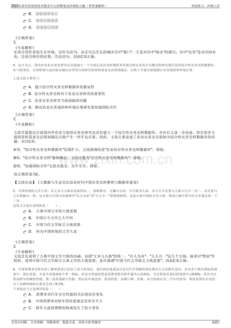 2023年贵州省保密技术服务中心招聘笔试冲刺练习题(带答案解析)一、第一部分言语理解与表达(本部分包括表达与理解两方面的内容。请根据题目要求,在四个选项中选出一个最恰当的答案。)1、我们经常需要控制自己的欲望,晚一些再满足它,称之为“延迟满足”。与今晚享受大餐相比,推迟享受的大餐,其吸引力(价值)被打了折扣,心理学家称之为时间折扣。时间折扣越大,我们越无法接受延迟满足。但在面临诸多决策时,人们趋于采用单一策略:当现在和未来的时间距离不那么遥远,便直接“齐同”两者在时间维度的差别,不再给未来选择打一个时间折扣,让不同时间点之间的选择变得更加简单。下列与画横线部分意思相符的是:A做决策时,不考虑时间因素 B不考虑延迟满足,选择享受当下 C做决策时,随机选择现在或者未来事项 D在不同的时间点上选一个平均“时间折扣”正确答案A专家解析文段开篇引出“延迟满足”和“时间折扣”的概念,并说明二者之间的关系。接下来通过“但”进行转折,指出面临诸多决策的时候人们趋于采用单一策略,随即后文进行解释说明。画横线部分即为该策略的具体表现,且横线前后分句的内容即对横线处所在句子进行提示和解释。根据“当现在和未来的时间距离不那么遥远”“不再给未来选择打一个时间折扣”可知,“齐同两者在时间维度的差别”强调的是在时间距离不是很遥远的前提下抹去时间的差别,将时间的维度保持“齐平”,即做决策的时候不考虑时间因素,对应A项。B项,文段只是强调不考虑时间因素,但没有指出一定是选择享受当下,排除;C项,“随机选择”表述错误,文段强调不考虑时间因素,从事项本身出发,并非随机做出决策,排除;D项,“平均时间折扣”表述错误,文段强调的是在时间维度不打折扣,忽略时间因素,排除。故正确答案为A。【文段出处】科学辟谣“选择困难症”又犯了?要不,这次就让音乐帮忙做决定2、一般地说,“智慧”不同于“知识”的最大特点在于“智慧”具有原创性。“知识”要求“广”,“智慧”要求“新”。但两者又非绝对_:“智慧”必须有“知识”作基础,反之,只死读书,而无己见、无创意,那就容易成为_,也不算是“智慧”。依次填入划横线部分最恰当的一项是()。A 对立学究 B 矛盾古董 C 等同桎梏 D 排斥束缚正确答案A专家解析第一空,文段关联词“但”前后表示相反的意思。前面讲“不同”,后面要否定这种不同即表示相同的意思,“对立”最为合适。而“矛盾”“等同”“排斥”放在此处前后矛盾,不合语境。因此A项正确。3、那近乎透明,终日涌动不息的蓝色衬着岛上西式建筑的红砖绿瓦也使岛上的男子汉们日追一日地慷慨热情厦门岛四周的海水湛蓝澄碧,温婉妍丽我是一个生在海边,长在海边的人这是南方的海,我故乡的海,终日奔涌喧哗着阳光的海还有散立在海滨山坡的芭蕉、椰树、凤凰、木棉,孕育、滋养了一个又一个诗人、音乐家将以上6个句子重新排列,语序正确的一项是()。A 2023年贵州省保密技术服务中心招聘笔试冲刺练习题(带答案解析)考前练习,冲刺上岸含常识判断、言语理解、判断推理、数量关系、资料分析等题型第1页 B C D 正确答案C专家解析项介绍作者的生长环境,应作为首句;由引出生长的城市中“厦门”,是对中“海水”的描写;中“还有”是对的补充;是和的结果;总结句。因此C项正确。4、迄今为止,国内外农业灾害史研究还未能建立一个全面记录历史时期世界各地自然灾害发生完整过程和灾情信息的综合性灾害史料数据库。在气候变化、灾害影响与适应防灾减灾应用等方面研究的资料需求无法得到满足,以致于不能全面地揭示灾害成因和环境后果。上述文段主要讲了:A建立综合性灾害史料数据库的紧迫性 B综合性灾害史料对于农业灾害研究的重要性 C农业灾害史研究当前面临的问题 D推动农业灾害成因和环境后果研究需加强国际合作正确答案C专家解析文段开篇指出目前国内外农业方面的灾害史研究还没有建立一个综合性灾害史料数据库,并在后文进一步论述,即在很多方面的资料需求无法得到满足以致产生一些不良后果。因此,文段主要论述了农业灾害史目前缺少综合性灾害史料数据库的问题,对应C项。A项,“综合性灾害史料数据库”范围扩大,文段强调的是“农业综合性灾害史料数据库”,排除;B项,“综合性灾害史料”偷换概念,文段话题为“综合性灾害史料数据库”,排除;D项,“加强国际合作”文段未提及,无中生有,排除。故正确答案为C。【文段出处】大数据与生态史信息化时代中国灾害史料整理与数据库建设5、中国传统的文学大家,其文本与人格必是始终如一,珠联璧合,无懈可击的,才可称为大家。其人生不仅要与大群人生合二为一,而且要与大自然融为一体,这才能与中国文化精神中“以人为本”及“天人合一”思想相映照。这是古典中国的文学大统,然而已被中国当代文学遗忘得一干二净。这段文字意在说明的是()。A 古典中国文学的大统思想 B 中国古今文学之大不同 C 中国当代文学缺乏大统思想 D 何为中国传统的文学大家正确答案C专家解析文段首先说明了古典中国文学大统的内涵,包括“文本与人格”的统一、“以人为本”、“天人合一”这几个方面;接着以“然而”作转折,说明中国当代文学缺乏古典文学的大统思想,意在强调