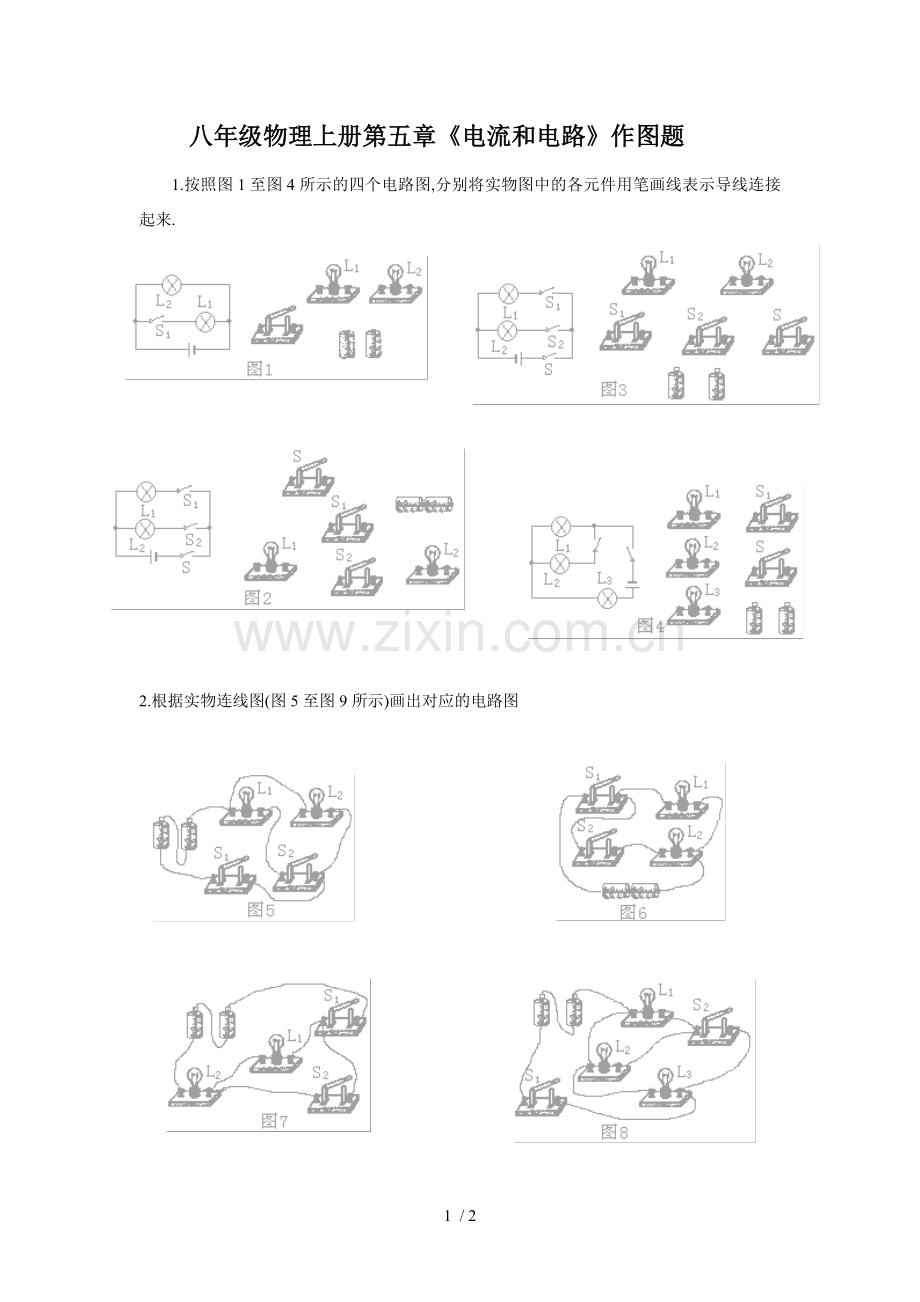 八年级物理上册第五章《电流和电路》作图题 1.按照图1至图4所示的四个电路图,分别将实物图中的各元件用笔画线表示导线连接起来. 2.根据实物连线图(图5至图9所示)画出对应的电路图 3.对照下列电路图(图11)用 笔画线代替导线画实物连线图或由实物图(图12)画成对应的电 路图。 2 / 2