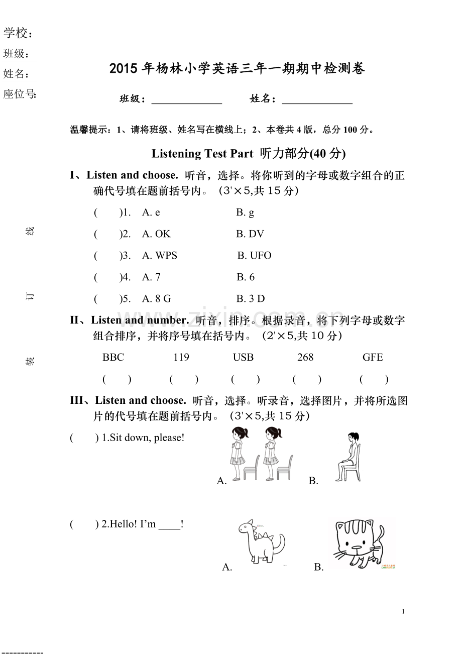 Ⅰ、Listen and choose. 听音,选择。将你听到的字母或数字组合的正确代号填在题前括号内。(3'×5,共15分)