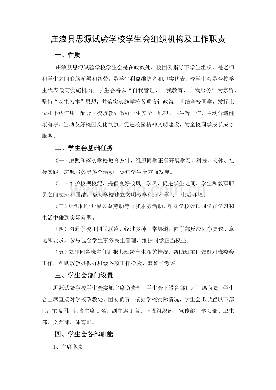 庄浪县思源试验学校学生会是在政教处、校团委指导下学生组织,是老师和学生之间联络桥梁和纽带,是学生利益维护者和忠实代表。校学生会是全校学生代表最高实施机构,学生会将以“自我管理、自我教育、自我服务”为宗旨,坚持“以生为本”思想,并落实实施学校各项方针政策,团结全校同学,发挥上传和下达作用,配合学校政教处做好学生安全、纪律、卫生等工作,主动营造健康有序、生动友好校园文化气氛,促进校园精神文明建设,为全校同学成长成才服务。