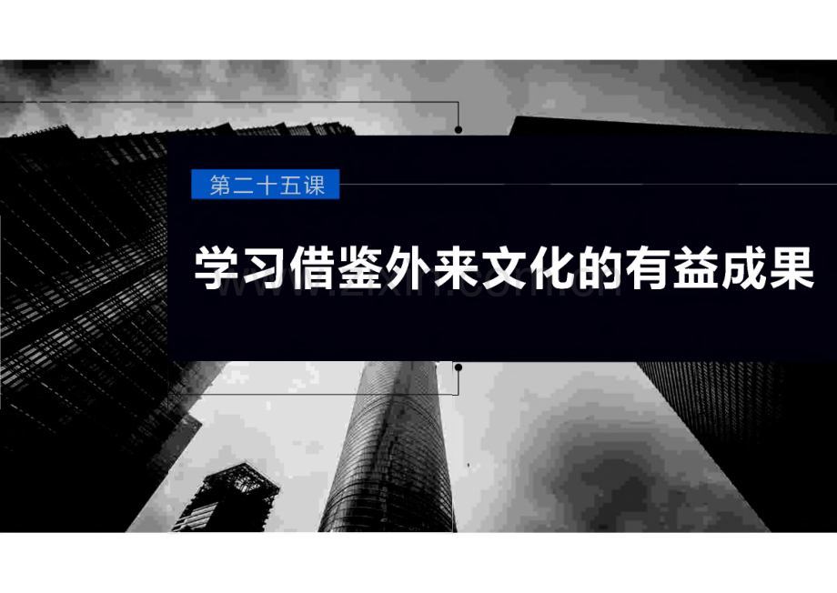第二十五课学习借鉴外来文化的有益成果syf公*W、F:CSCN5 w课标 感悟世界文化的多样性,理解文化多样性的价值,明确文化交流互鉴的途径和 要求意义。体系构建民文化多样性族-含义:一个民族区别于其他民族的独特标识作用:起着维系社会生活、维持社会稳定、激发民族创造力和凝聚力的重要作用,是一个民族生存与发展的精神根基-核心:观是民族文化的核心和灵魂p原因.各国和各民族的政治、经济等社会条件不同意义:发展本民族文化、繁荣世界文化在坚持各民族平等的基础上,尊重差异,理解个性 态度七认同本民族文化尊重 其他民族文化一原因:文化发展的重要动力一态度:加强相互交流、相互学习 相互借鉴 一原因:文化不仅属于这个民族,而且属于整个世界-意义-T文化交融推动文化的发展J-增强本民族文化的自尊、自信、自立L繁荣世界文化正确 态度错误 观点-面向世界,博采众长立足国情,交逆笔-彻底拒斥外来文化的文化复古主义盲目照搬西方文化的全盘西化论内容 索引知识点一文化的民族性与多样性知识点二文化交流与文化交融知识点三正确对待外来文化课时精练文化的民族性与多样性知识点一落实常考点过关考点1文化具有民族性含义每个民族都有自己独特的文化,是区别于其他民族的独特 标识核心和灵魂价值观O1生活方式、生产方式、思维方式、民族节日、民族服饰等 的差异地位、作用民族文化是一个民族区别于其他民族的独特标识。在一个 民族的历史与现实中,民族文化起着维系社会生活、维持 社会稳定、激发民族创造力和凝聚力的重要作用,是一个 民族生存与发展的精神根基对点精练1(2020.天津高考)徜徉古镇杨柳青,声声古琴音从青砖灰 瓦间溢出,沿运河两岸流淌,一幅隽永的文化长卷就此舒展。石家大 院等保存完好的清代民居建筑群,孕育了大院文化;家家会点染、户 户善丹青,声名远扬的木版年画,滋养着吉祥文化。杨柳青古镇独具 特色的文化蕴含着人们对美好生活的向往是中国传统文化的标志借助传统建筑和传统工艺得以传承在世代相传中从未改变 B.C.D.解析说法错误,传统建筑被称为凝固的艺术,是中国传统文化的重要标 志。说法错误,传统文化具有相对稳定性,在世代相传中保留着其基本 特征,同时,它的具体内涵又能够因时而变。考点2文化具有多样性地位文化多样性表征文化存在的丰富程度原因每一个国家和民族的文化都扎根于本国本民族的土壤之中,各国和 各民族的政治、经济等社会条件不问,形成了各具特色的民族文化意义文化多样性是发展本民族文化的内在要求,也是实现世界文化繁 荣的必然要求。只有保持世界文化的多样性,世界才更加丰富多 彩,充满生机与活力态度面对文化多样性,我们要在坚持各民族平等的基础上,尊重差异,理解个性,既要认同本民族文化,又要尊重其他民族文化,相互 借鉴,求同存异,共同促进人类文明繁荣进步文化多样性不同于文化多元化,前者主要指民族文化的多样性,即不同国家、民族文化的形式、内容各具特色,后者主要从文化 的来源和性质上说,倡导文化发展方向、指导思想、文化价值取 向的差异。文化民族性与文化多样性的关系.(1)文化民族性是文化多样性的基础:文化民族性凸显了民族文化 的个性,即民族文化的独特性,是世界文化多样性的体现。民族 文化越丰富、越发展,世界文化多样性越明显。(2)文化多样性促进文化民族性:尊重世界文化多样性,可以做到 相互借鉴、取长补短,促进本民族文化的发展。对点精练2 2021年1月,习近平主席在世界经济论坛“达沃斯议程”对 话会上强调,各国历史文化和社会制度差异自古就存在,是人类文明的 内在属性。没有多样性,就没有人类文明。这一论断启示我们文化的多样性是人类社会文明进步的重要动力在实践中产生的民族文化有其共性和普遍规律认同其他民族文化是发展本民族文化内在要求在文化交流中要遵循各民族文化一律平等原则A.C.D.解析材料中阐述的是各民族文化的多样性、差异性,没有阐述文化的共性,排除。要尊重其他民族的文化,认同本民族的文化,排除。纠错易错点集训易错点1误认为尊重文化多样性应认同其他民族文化点拨 尊重文化多样性要求我们认同本民族文化,尊重其他民族 文化。尊重其他民族文化,不等同于我们要认同其他民族 文化。训练1 一双筷子,承载着中国人的情感和记忆。标准尺寸七寸六分,象征七情六欲,一分为二,合二为一,动静相合又称阴阳和谐之道。这 是认同与融合所带来的润物无声的文化浸染。文明多姿,世界才能多彩,差异所带来的文化张力别有韵味,中华优秀文化也始终以独特的魅力、开放的姿态屹立于世界。这说明文化是一个国家、一个民族的灵魂坚持文化自信是文化繁荣发展的源泉既要认同本民族文化,又要尊重和认同其他民族文化文化多样性是人类社会的基本特征,也是人类文明进步的重要动力A.B.00 D.解析错误,文化繁荣发展的源泉是社会实践。错误,对本民族文化要认同,对其他民族文化要尊重。易错点2误认为各民族文化有优劣之分点拨各民族文化有差异,但无优劣之分,要坚持各民族文化一律 平等的原则。训练2 扁担宽板凳长,扁担想绑在板凳上各种颜色的皮肤各种颜色的头发,嘴里念的说的开始流行中国话。”材料表明A.推广汉语是世界文化多元化的需要B.中华文
