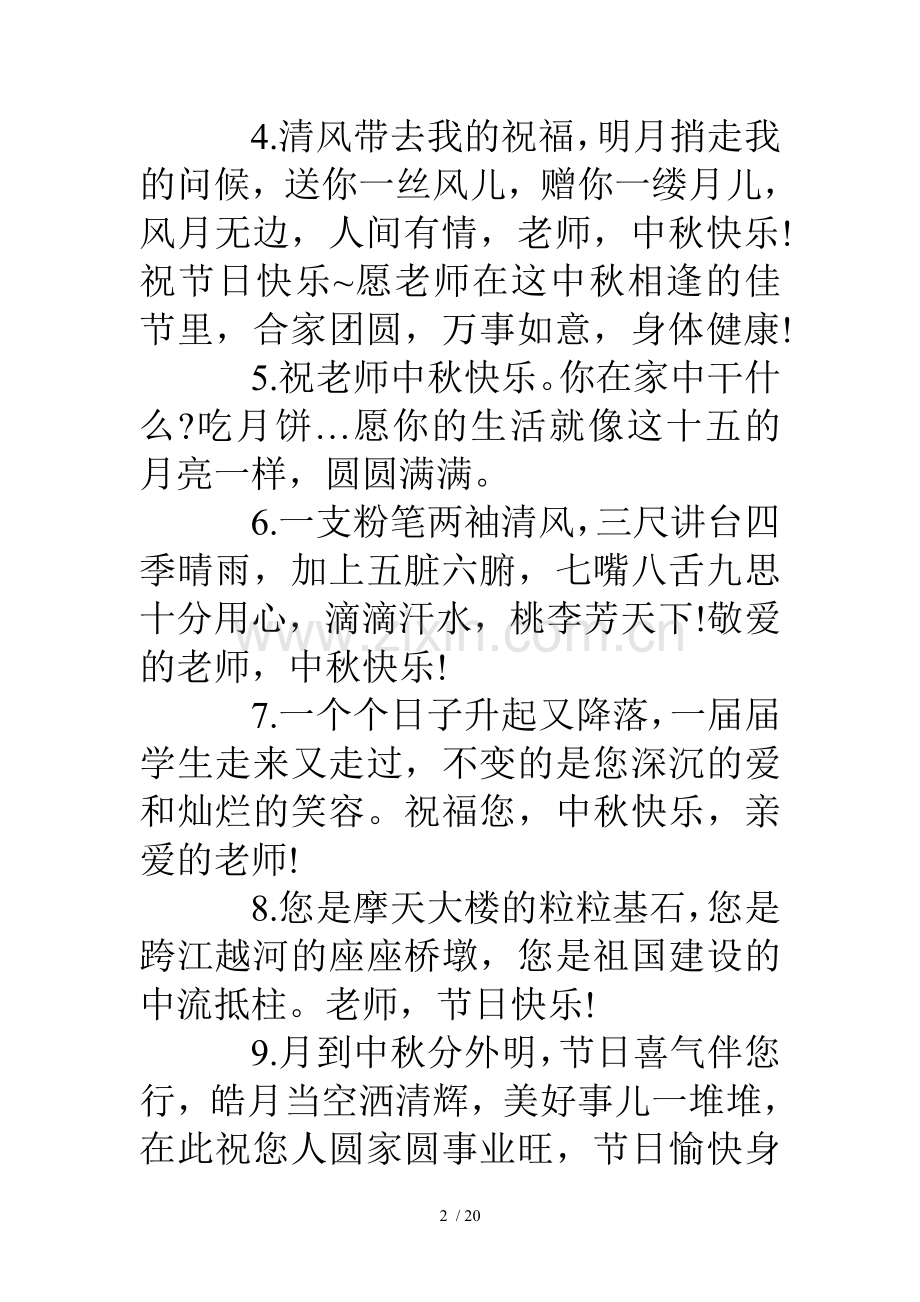 18.您是人类灵魂的工程师,您从事的是太阳底下最光辉的事业,您是社会文明进步的阶梯。白色的粉笔末,一阵阵的飘落。它染白了您的黑发,却将您青春的绿色映衬得更加浓郁。任何语言,都道不尽对您的敬意,只让月亮捎去祝福:中秋快乐!