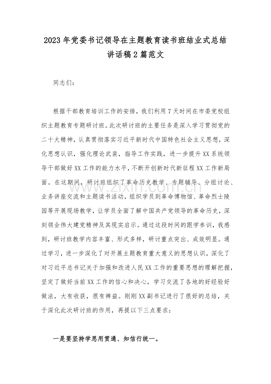 2023年党委书记领导在主题教育读书班结业式总结讲话稿2篇范文