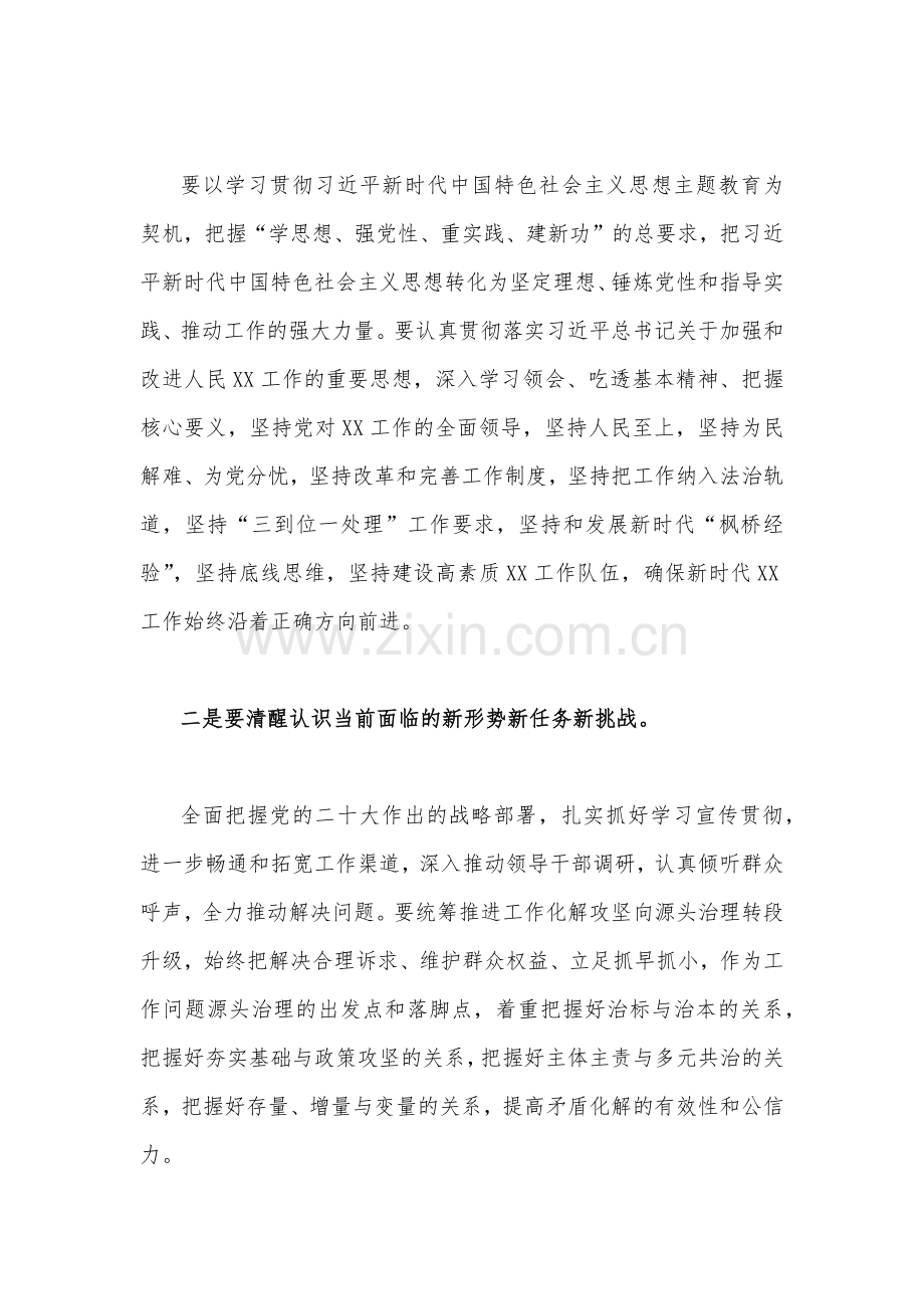 要以学习贯彻习近平新时代中国特色社会主义思想主题教育为契机,把握“学思想、强党性、重实践、建新功”的总要求,把习近平新时代中国特色社会主义思想转化为坚定理想、锤炼党性和指导实践、推动工作的强大力量。要认真贯彻落实习近平总书记关于加强和改进人民XX工作的重要思想,深入学习领会、吃透基本精神、把握核心要义,坚持党对XX工作的全面领导,坚持人民至上,坚持为民解难、为党分忧,坚持改革和完善工作制度,坚持把工作纳入法治轨道,坚持“三到位一处理”工作要求,坚持和发展新时代“枫桥经验”,坚持底线思维,坚持建设高素质XX工作队伍,确保新时代XX工作始终沿着正确方向前进。