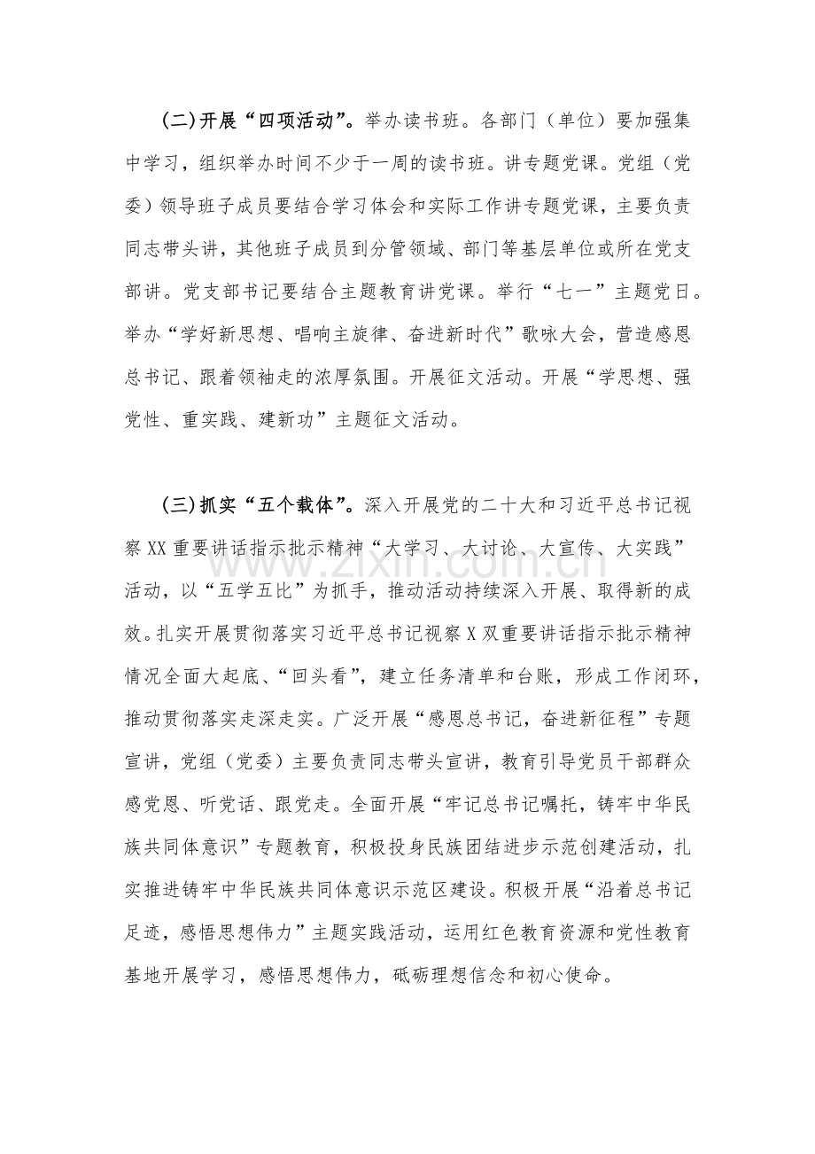 (三)抓实“五个载体”。深入开展党的二十大和习近平总书记视察XX重要讲话指示批示精神“大学习、大讨论、大宣传、大实践”活动,以“五学五比”为抓手,推动活动持续深入开展、取得新的成效。扎实开展贯彻落实习近平总书记视察X双重要讲话指示批示精神情况全面大起底、“回头看”,建立任务清单和台账,形成工作闭环,推动贯彻落实走深走实。广泛开展“感恩总书记,奋进新征程”专题宣讲,党组(党委)主要负责同志带头宣讲,教育引导党员干部群众感党恩、听党话、跟党走。全面开展“牢记总书记嘱托,铸牢中华民族共同体意识”专题教育,积极投身民族团结进步示范创建活动,扎实推进铸牢中华民族共同体意识示范区建设。积极开展“沿着总书记足迹,感悟思想伟力”主题实践活动,运用红色教育资源和党性教育基地开展学习,感悟思想伟力,砥砺理想信念和初心使命。