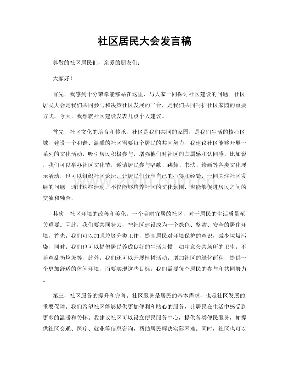 首先,我感到十分荣幸能够站在这里,与大家一同探讨社区建设的问题。社区居民大会是我们共同参与和决策社区发展的平台,是我们共同呵护社区家园的重要方式。今天,我想就社区建设发表几点个人建议。