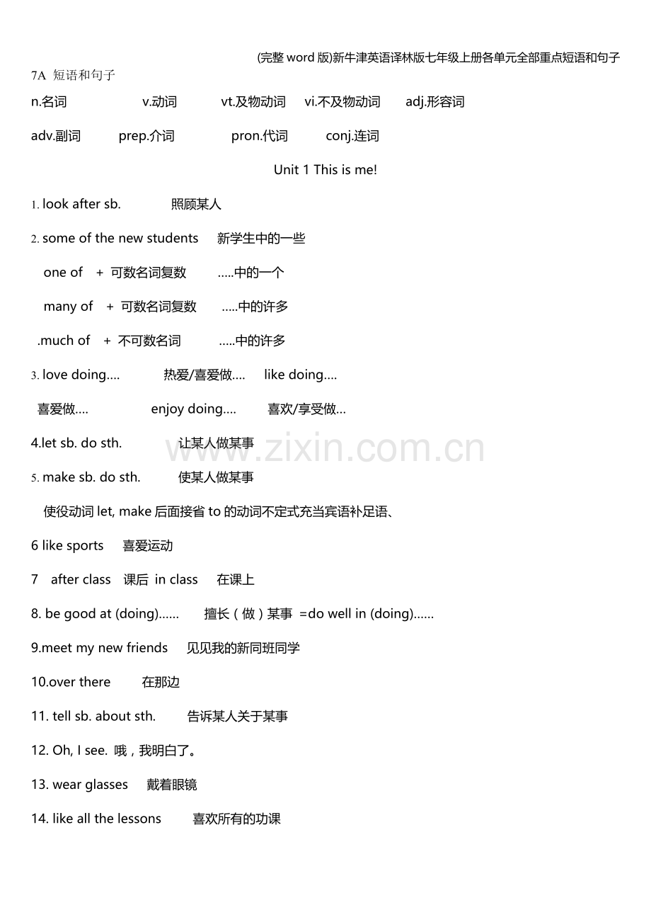 (完整word版)新牛津英语译林版七年级上册各单元全部重点短语和句子