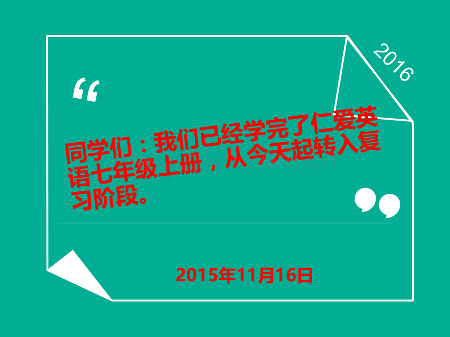 仁爱英语七年级上册复习幻灯片2016“”同学们:我们已经学完了仁爱英语七年级上册,从今天起转入复习阶段。2015年11月16日 “”请翻到Unit 1 复习26个字母,并写出5大元音字母“”复习 be 动词的用法我用am 你用are,is 用于他、她、它,单数is 复数are,我们、他们都用are(beam,is,are)“”用be动词填空1).I _ a student.2).You _ a teacher.3).she_ from Jinan.5).He _ in Class 4,Grade 1.6).It_ a car.7).They _ cars.8).your_ mother in China.9).your_ friends in New York 10).we_ good farmers.“”名词有可数名词和不可数名词两种,不可数名词没有复数形式。只有可数名词才有单数和复数两种形式“”一、一般的名词+s,是复数 例:friendfriends;catcats;stylesportsports 二、以s、x、ch、sh结尾的词,+es是复数 例:busbuses;foxfoxes;matchmatches;box boxes;watch watches;actress actresses;class classes;coach(长途车)coaches;dress dresses;“”四、以-o结尾的名词,有生命的加es,无生命的加s 例如;radioradios,pianopianos(外来词);photophotos;zoo-zoos,bamboo-bamboos,五、以-f或-fe结尾的名词,把-f或-fe改变为-ves 例knifeknives;lifelives;leafleaves;特殊的要记住:goose-geese;mouse-mice;foot-feet.man-men;woman-women;tooth-teeth;foot-feet,child-children,sheep-sheep“”三、以辅音字母+y结尾的名词,将y改变为i,再加-es 例:candycandies;daisy(雏菊)daisies;fairyfairies;ladyladies;storystories strawberry strawberries;baby babies;puppy puppies;library libraries;dictionary dictionaries;cherry cherries;activity activities,countrycountries,flyflies.区别元音字母+y 结尾的名词变复数时,直接加s【元音字母有 a,e,o,u,i】monkey-monkeys holiday-holidays boy-boys key-keys“”have 和has 的用法(记住口诀)“”一般现在时态记住我的讲解“”回到同步整合方案上指导学生完成相关的练习题。把时间还给学生。千万不要填鸭式,否则就是“教师问题”。第一课时完“”该查缺补漏了“”引导学生完成教材126页具体要求是:1.重点放在1a上。2.学生必须背得。3.鼓励学生(因为人是鼓励出来的)。“”sectionA-B(1课时):sectionC-D(1课时)Unit 1 Topic 1 Making New FriendsTopic 2 Where are you from?section A-B(1课时):s ectionA-D(1课时)Topic 3 HOW old are you?section A-B(1课时):sectionC-D(1课时)第二课时完第二课时完第二课时完“”经过师生共同复习,共同反思与总结完毕Unit1后水平测试。老师们功夫不负有心人,读书需要兴趣,看你怎样鼓励学生。共5课时“”Unit 2 Looking DifferentTopic 1 I have a small nosesectionA-B(1课时):sectionC-D(1课时)第二课时完Topic 2 What does she look like?sectionA-B(1课时):sectionC-D(2课时)第三课时完Topic 3 Whose cap is it?sectionA-B(1课时):sectionC-D(1课时)第二课时完“”经过师生共同复习,共同反思与总结完毕Unit2后水平测试。老师们功夫不负有心人,读书需要兴趣,看你怎样鼓励学生。测试讲解一并5课时“”Unit 3 Topic 1 Does he speak chinese?sectionA-B(1课时)-第一课时完section(C-D2课时)-第二课时完 Topic 2What does your mother do?sectionA-B(I课时)-第一课时完sectionC-D(2课时)-第二课时完 Topic 3What would you like to drink?sectionA-B(1课时)-第一课时完sectionC-D(2课时)-第二课时完 “”经过师生共同复习,共同反思与总结完毕Unit 3后水平测试。老师们功夫不负有心人,读书需要兴趣,看你怎样鼓励学生。共5 课时“”Unit 4 Topic 1 What can I do for you?sectionA-B(1课时)-第一课时完section(C-D2课时)-第三课时完 Topic 2 Would you like to cook with us?sectionA-B(I课时)-第一课时完sectionC-D(2课时)-第三课时完 Topic 3What time is it now?sectionA-B(1课时)-第一课时完sectionC-D(2课时)-第三课时完 “”经过师生共同复习,共同反思与总结完毕Unit 4后水平测试。老师们功夫不负有心人,读书需要兴趣,看你怎样鼓励学生。共5课时