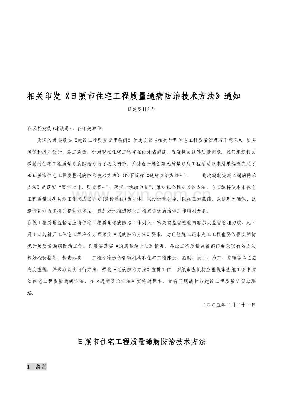 相关印发《日照市住宅工程质量通病防治技术方法》通知
