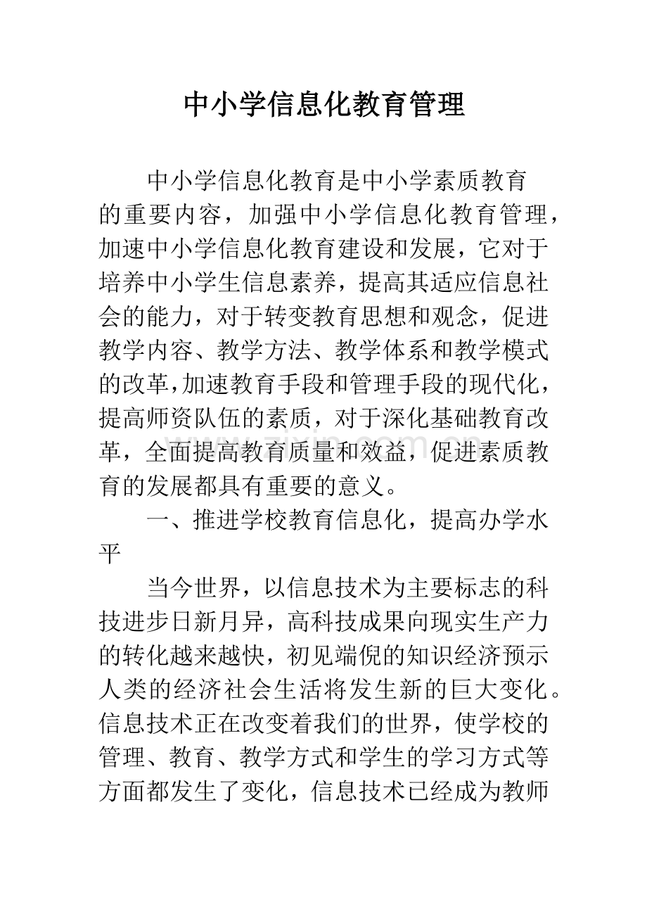 中小学信息化教育是中小学素质教育的重要内容,加强中小学信息化教育管理,加速中小学信息化教育建设和发展,它对于培养中小学生信息素养,提高其适应信息社会的能力,对于转变教育思想和观念,促进教学内容、教学方法、教学体系和教学模式的改革,加速教育手段和管理手段的现代化,提高师资队伍的素质,对于深化基础教育改革,全面提高教育质量和效益,促进素质教育的发展都具有重要的意义。