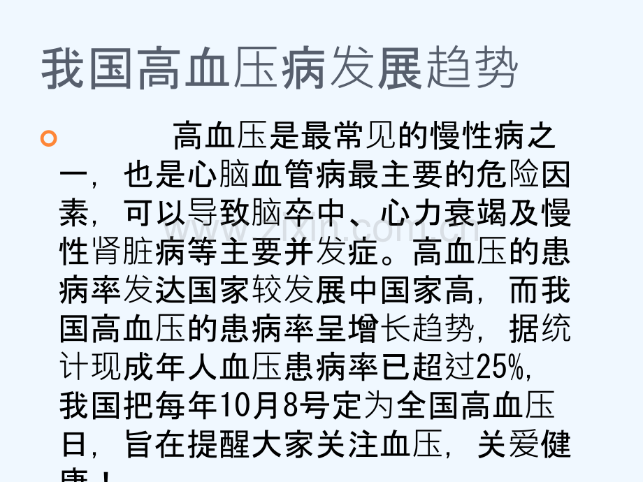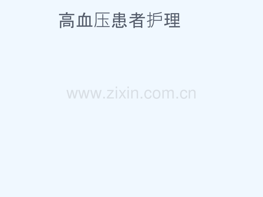 高血压患者护理我国高血压病发展趋势高血压是最常见的慢性病之一,也是心脑血管病最主要的危险因素,可以导致脑卒中、心力衰竭及慢性肾脏病等主要并发症。高血压的患病率发达国家较发展中国家高,而我国高血压的患病率呈增长趋势,据统计现成年人血压患病率已超过25%,我国把每年10月8号定为全国高血压日,旨在提醒大家关注血压,关爱健康!中国特色的高血压防治现状患病率高患病率高致残率高致残率高死亡率高死亡率高知知晓率低率低治治疗率低率低控制率低控制率低 三高 三低定义原发性高血压是以血压升高为主要表现的临床综合征,通常简称为高血压。目前我国将高血压定义为收缩压140和舒张压90病因双双亲均有高血均有高血压的正常高的正常高血血压子女以后子女以后发生高血生高血压的比例增高。的比例增高。饮食食精神因素精神因素气候的突然气候的突然变化化遗传因素40%环境因素60%临床表现11一般表一般表现(1 1)症状:常)症状:常见症状有症状有头痛、痛、头晕、疲、疲劳、心悸、心悸、耳耳鸣(2 2)体征:除血)体征:除血压升高外,心升高外,心脏听听诊可可闻及主及主动脉瓣区第二心音亢脉瓣区第二心音亢进及收及收缩期期杂音。音。22并并发症症(1)(1)脑血管的并血管的并发症:最常症:最常见,出血性或缺血,出血性或缺血性性脑卒卒中,高血中,高血压脑病,多属高血病,多属高血压急症范畴。急症范畴。(2 2)心)心脏的并的并发症:高血症:高血压性心性心脏病病急性左心急性左心衰衰冠心病冠心病(33)肾脏的并的并发症:高血症:高血压性性肾病、慢性病、慢性肾衰竭衰竭(44)其他:眼底及)其他:眼底及视力、力、视野改野改变;鼻出血;主;鼻出血;主动脉脉夹层。33高血高血压急症急症高血高血压急症:指原急症:指原发性或性或继发性高血性高血压病人,在病人,在某些某些诱因作用因作用下血下血压突然和突然和显著升著升高高(一般超一般超过180/120),180/120),同同时伴有伴有进行性心、行性心、脑、肾等重要靶器等重要靶器 官功能不全的官功能不全的表表现。高血高血压急症包括:高血急症包括:高血压脑病,病,颅内内出血,出血,脑梗梗死、急性左心衰。死、急性左心衰。实验室检查1 常常规检查规检查 尿常尿常规规、血糖、血脂、血清、血糖、血脂、血清电电解解质质、肾肾 功能、胸部功能、胸部 x 线检查线检查及心及心电图电图等。等。2 特殊特殊检查检查 如如动态动态血血压监测压监测。高血压诊断类别收收缩压舒舒张压正常血正常血压1201208080正常高限正常高限12012013913980808989级高血高血压14014015915990909999级高血高血压160160179179100100109109级高高 血血压180180110110治疗原则降低血降低血压,接近或达,接近或达到正常范到正常范围预防或延防或延缓并并发症症的的发生。生。护理问题1 疼痛疼痛 及高血及高血压脑压脑血管血管痉挛痉挛有关有关2 活活动动无耐力无耐力 及并及并发发心力衰竭有关心力衰竭有关3 有受有受伤伤的危的危险险 及及头晕头晕和和视视力模糊有关力模糊有关4 知知识识缺乏缺乏 缺乏高血缺乏高血压压疾病相关知疾病相关知识识5 潜在并潜在并发发症症 心力衰竭、心力衰竭、脑脑血管意外、血管意外、肾肾 衰竭衰竭护理措施1 疼痛:疼痛:头头痛痛(1)减少引起或加重)减少引起或加重头头痛的因素:保持痛的因素:保持环环境安静,境安静,减减 少探少探视视,向病人解,向病人解释头释头痛主要及高血痛主要及高血压压有关,有关,指指 导导病人放松。病人放松。(2)用)用药护药护理:遵医嘱理:遵医嘱应应用降用降压药压药物,密切物,密切观观察血察血压压 血血压变压变化,化,观观察察药药物不良反物不良反应应。2 有受有受伤伤的危的危险险(1)避免受)避免受伤伤:定:定时测时测血血压压并并记录记录。有。有头晕头晕、眼花、眼花、视视力模糊力模糊时时嘱病人卧床休息,改嘱病人卧床休息,改变变 体位体位时时速度不宜速度不宜过过快。快。(2)直立性低血)直立性低血压的的预防及防及处理:避免理:避免长久站立,尤久站立,尤 其在服其在服药后最初几小后最初几小时;改;改变姿姿势时动作作应缓慢;慢;避免用避免用过热的水洗澡;不宜大量的水洗澡;不宜大量饮酒。酒。在在发生直立性低血生直立性低血压时采取下肢抬高位平卧,以促采取下肢抬高位平卧,以促 进下肢血液下肢血液 回流。回流。3 潜在并潜在并发症:高血症:高血压急症急症 (1)遵医嘱用遵医嘱用药,不能随意减量和停,不能随意减量和停药;给予心予心 理指理指导,避免情,避免情绪波波动过大。大。(2)病情病情监测:定期:定期监测血血压。(3)高血高血压急症急症护理:病人理:病人应绝对卧床,抬高床卧床,抬高床头;保持呼吸道通保持呼吸道通畅;吸氧;密切关注病情;吸氧;密切关注病情变化;化;建立静脉通路,遵医嘱建立静脉通路,遵医嘱应用降用降压药。