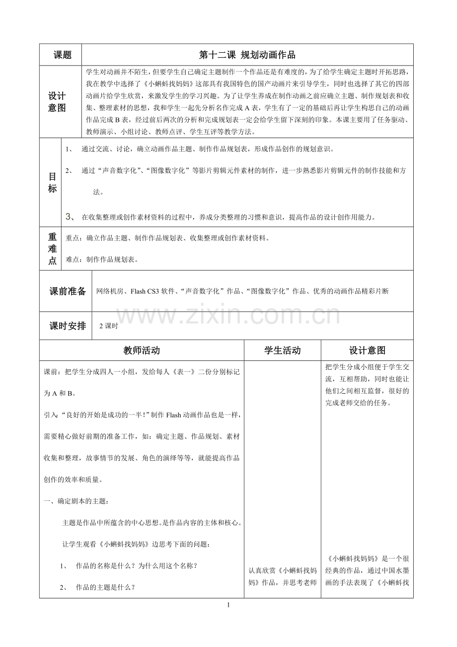 1、 通过交流、讨论,确立动画作品主题、制作作品规划表,形成作品创作的规划意识。