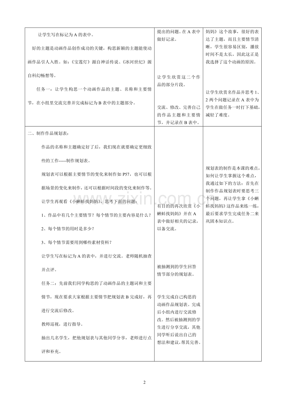 规划表的制作是本课的难点,如何让学生掌握这个难点,我通过如下的方法:首先在制作作品规划表时要思考三个问题,再让学生拿《小蝌蚪找妈妈》这作品来练一练,最后要求学生完成任务二来巩固本知识点。