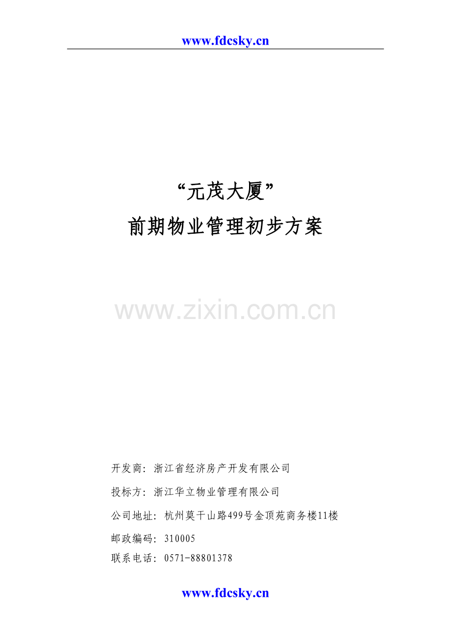 本投标书根据浙江省经济房产公司提供的相关参数为标准,结合招标文件,我们精心策划了[元茂大厦]的前期物业管理工作计划、物业管理工作方案,并通过我们与开发商的共同努力,以提高[元茂大厦]的物业管理水平和服务质量,实现物业的保值、增值为宗旨,使[元茂大厦]真正成为配套完善,服务规范,具有星级标准的酒店式商务办公精品楼盘,真正成为杭州城西经济商务圈内一颗璀璨的明珠。