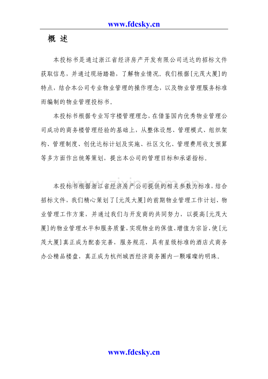 本投标书是通过浙江省经济房产开发有限公司送达的招标文件获取信息,并通过现场踏勘,了解物业情况。我们根据[元茂大厦]的特点,结合本公司专业物业管理的操作理念,以及物业管理服务标准而编制的物业管理投标书。