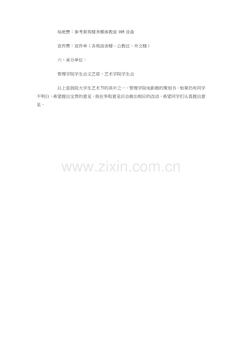 以上是我院大学生艺术节的其中之一,管理学院电影展的策划书。如果仍有同学不明白,希望提出宝贵的意见,我在争取意见后会做出相应的改动,希望同学们认真提出意见。