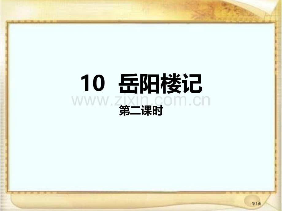 10 岳阳楼记 第二课时第1页复习旧课政通人和,百废具兴。衔远山,吞长江,浩浩汤汤,横无际涯,朝晖夕阴,气象万千。不以物喜,不以己悲。居庙堂之高则忧其民,处江湖之远则忧其君。先天下之忧而忧,后天下之乐而乐。翻译以下句子背诵抽查第2页有感情地朗诵课文,思索以下问题:滕子京“谪守巴陵郡”而“重修岳阳楼”说明了什么问题?作者在这里没有对岳阳楼详加描绘,原因是什么?课文第3、4两段文字描绘了洞庭湖哪两幅画面?作者用哪些话概括说明了“迁客骚人”“悲”和“喜”?这么写目标是什么?问题研讨第3页“览物之情,得无异乎”和“古仁人之心,或异二者之为”两句中“异”字,分别指什么?“微斯人,吾谁与归”表示了作者怎样感情?本文是怎样将叙事、写景、抒情、议论有机地结合在一起?第4页滕子京“谪守巴陵郡”而“重修岳阳楼”说明了什么问题?说明滕子京在逆境中“不以己悲”,仍奋发有为,有阔大胸襟,和普通“迁客”不一样。第5页作者在这里没有对岳阳楼详加描绘,原因是什么?第一,作者明言“前人之述备矣”,所以无须再去重复。第二,从全文看,作者写这篇文章目标不在于介绍岳阳楼建造经过和它结构及景物,而在于借景抒情,引发出自己观点。第6页课文第3、4两段文字描绘了洞庭湖哪两幅画面?第3段描绘了洞庭湖一幅阴冷画面,第4段描绘了洞庭湖一幅晴朗画面。第7页作者用哪些话概括说明了“迁客骚人”“悲”和“喜”?这么写目标是什么?“去国怀乡,忧谗畏讥”概括了“迁客骚人”“悲”;“心旷神怡,宠辱偕忘”概括了“迁客骚人”“喜”。这么写是为了将这类人悲喜感情跟“古仁人之心”作对比,引出下文,由写景转入议论,突出主旨。第8页“览物之情,得无异乎”和“古仁人之心,或异二者之为”两句中“异”字,分别指什么?“览物之情,得无异乎”“异”,是指不一样自然景物引发出“迁客骚人”不一样感触,即“悲”与“喜”两种不一样心境。“古仁人之心,或异二者之为”中“异”是指古代仁人不一样于“迁客骚人”,能不受自然风物好坏影响,“不以物喜,不以己悲”。第9页“微斯人,吾谁与归”表示了作者怎样感情?表示了作者对“不以物喜,不以己悲”这类古仁人向往与敬慕之情。第10页本文是怎样将叙事、写景、抒情、议论有机地结合在一起?文章开头叙述滕子京谪守巴陵郡不到一年,就做到“政通人和,百废具兴”,已暗含“不以己悲”意思,说明他不一样于普通“迁客”,为写下文“迁客骚人”“览物之情”做铺垫。接着写“岳阳楼之大观”,至“然则北通巫峡”一转,描写了两幅画面,极力渲染“迁客骚人”们悲和喜,每一个画面都是先写景,后写情,他们形态虽有别,但实质却相同,都是“以物”“以己”而生。由此再转入议论,将文势推向高潮,提出“先天下之忧而忧,后天下之乐而乐”观点。第11页品析语言有感情地朗诵课文,画出自己认为写得好语句或好词语,仔细琢磨品味并与大家交流。示例:“衔远山,吞长江”一句中“衔”“吞”二字形象地写出山在湖中,湖蓄江水壮阔气象,把静止景物写活了,人格化了。第3段文字利用四字句,层层渲染,渐次铺叙,极力描绘出一幅阴冷画面,读后给人一个天昏地暗、阴风惨惨感觉。第12页体会本文骈散结合语言特点。本文语言流利畅达,简练凝练,节奏鲜明,音调铿锵,意境优美,意趣无穷,含有很强艺术感染力,这得益于作者利用了骈散结合句式,那么本文句式是怎样骈散结合呢?请小组思索、讨论。第13页 骈句,指是结构相同、内容相关、行文相邻、字数相等两句话。它跟对偶相同,只是不像对偶那样在音韵上有严格要求。散句,指句式灵活而富有改变句子。长短不一,自由活泼,生动感人。散句能使语气舒缓,舒卷自如。骈句、散句介绍第14页 本文骈句、散句利用,依文章内容而改变。如开头、结尾叙述性文字利用散句,庄重而质朴;中间写景状物语句多用骈句,辞采华美,音韵友好;议论抒情语段也用散句,抑扬顿挫,富于改变。这么,骈散结合,叙议结合,文质兼美,含有很强艺术感染力。第15页拓展延伸孟子在孟子梁惠王下中劝说君主要“乐以天下,忧以天下”,范仲淹“先天下之忧而忧,后天下之乐而乐”和它在内容上有何联络?有感情地朗诵课文,思索并讨论以下问题:“先天下之忧而忧,后天下之乐而乐”表现了作者怎样情怀?你是怎样了解这句话?第16页 孟子,名轲,字子舆。战国时期鲁国人。思想家、教育家,战国时期儒家代表人物。孟子继承并发扬了孔子思想,成为仅次于孔子一代儒家宗师,有“亚圣”之称,与孔子合称为“孔孟”。孟子一书是孟子言论汇编,由孟子及其再传弟子共同编写而成,统计了孟子语言、政治观点(仁政、民本、民贵君轻)和政治行动,是“四书”之一。孟子第17页总结 这篇课文表现了作者“不以物喜,不以己悲”旷达胸襟和“先天下之忧而忧,后天下之乐而乐”政治理想。第18页布置作业默写课文。现实生活中也有许多含有“先天下之忧而忧,后天下之乐而乐”精神人,请举一例,介绍其主要事迹。搜集描写岳阳楼景观诗文。第19页岳阳楼记 开头、结尾叙述性文字 庄重而质朴议论抒情语段抑扬顿挫,富于改变 中间写景状物语句辞采华 美,音韵友好散句骈句骈散结合,叙议结合,文质兼美,含有很强艺术感染力第20页