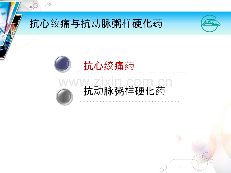 LOGO第十九章第十九章 抗心抗心绞痛痛药与与抗抗动脉粥脉粥样硬化硬化药1.抗动脉粥样硬化药抗心绞痛药抗心绞痛与抗动脉粥样硬化药抗心抗心绞绞痛痛药药 各种原因引起的暂时性心肌缺血缺氧所导致的心前区剧痛症候群,最常见原因是动脉粥样硬化。3.抗心抗心绞绞痛痛药药 病人胸骨后部或左前胸呈阵发性绞痛、闷痛、压榨性疼痛,可放射至左肩、左上肢。疼痛时间15min(15min),休息或用药物治疗后常可缓解。4.抗心绞痛药 一侧管壁明显增厚,向腔内突出呈月牙状,管腔明显狭窄,不规则。病变冠状动脉横切面5.抗心抗心绞绞痛痛药药 心心绞痛概述痛概述 抗心抗心绞痛痛药 典型典型药物介物介绍4 4 抗心抗心绞痛痛药的作用机制的作用机制6.心心绞绞痛概述痛概述心绞痛是冠状动脉狭窄或痉挛导致冠状动脉供血不足,心肌急性暂时缺血缺氧引起的临床综合征。冠脉的壁粥样硬化、血小板聚集、血栓形成是诱发不稳定心绞痛的重要因素7.心心绞绞痛概述痛概述心绞痛的分类稳定型性心绞痛不稳定型心绞痛变异型心绞痛8.室内压室内容积心肌供氧与需氧的关系 冠脉血流 心肌收缩力 心 率 心室壁张力 ArrhythmiasArrhythmias心肌缺血心肌缺血胸胸 痛痛 LV DysfunctionLV DysfunctionO2 demandO2 supply灌注压血流量侧支循环 9.O2供供 O2 耗耗心心绞痛的痛的发生机制示意生机制示意图心肌供氧耗氧-失去平衡心心绞绞痛概述痛概述心绞痛的发病原理:血、氧的供需失衡。10.心室壁肌张力(心室容积)心肌耗氧决定因素 心率 心肌收缩力 冠脉阻力 心肌供氧决定因素:冠脉流量 灌流压 侧支循环 心室舒张时间 心心绞绞痛概述痛概述11.抗心抗心绞绞痛痛药药 心心绞痛概述痛概述 抗心抗心绞痛痛药 典型典型药物介物介绍4 4 抗心抗心绞痛痛药的作用机制的作用机制12.抗心绞痛药按化学结构和作用机理可分为三类:硝酸酯类硝酸甘油受体阻断药普萘洛尔钙通道阻滞药硝苯地平抗心抗心绞绞痛痛药药13.抗心抗心绞绞痛痛药药的作用机制的作用机制 心心绞痛概述痛概述 抗心抗心绞痛痛药 典型典型药物介物介绍4 4 抗心抗心绞痛痛药的作用机制的作用机制14.1.舒张小静脉和小动脉,减轻心脏前、后负荷,降低室壁张力,降低心脏耗氧量。2.舒张冠状动脉,解除冠状动脉痉挛或促进侧支循环形成而增加心肌供氧。3.减慢心率、减弱心肌收缩力,降低心肌耗氧量。4.抑制血小板聚集和血栓形成。抗心抗心绞绞痛痛药药的作用机制的作用机制15.典型典型药药物介物介绍绍 心心绞痛概述痛概述 抗心抗心绞痛痛药 典型典型药物介物介绍4 4 抗心抗心绞痛痛药的作用机制的作用机制16.一硝酸酯类及亚硝酸酯类药典型典型药药物介物介绍绍二受体阻断药三钙通道阻滞药17.硝酸酯类及亚硝酸酯类药首过代谢明显,不宜口服给药,可舌下含化或使用贴剂经皮吸收。(nitroglycerin)硝酸甘油硝酸甘油18.硝酸甘油在中性和弱酸性条件下较稳定,但在碱溶液中容易水解。硝酸酯类在受到撞击和高热时易发生爆炸,故使用、储存和运输时应注意。硝酸甘油硝酸甘油19.1舒张全身A、V,降低心肌耗氧量。舒张容量血管心室舒张末容积,心室壁肌张力降低前负荷;舒张阻力血管心室射血阻力,心脏作功降低后负荷。硝酸甘油硝酸甘油【药理作用】20.2.舒张冠脉、增加缺血区血流量。扩张冠状血管及侧支血管增加侧支循环缺血区血流量增加;舒张容量血管回心血量心室壁肌张力使血液易从心外膜区域向心内膜下流动缺血严重的心内膜下层血液供应。硝酸甘油硝酸甘油【药理作用】21.心脏冠脉解剖特征冠脉有输送血管(大)、阻力血管(小)之分,呈单枝楔状供应心肌。左、右冠脉存在侧支循环,但建立起来较慢。冠脉在心脏的走向是由心外膜移行然后垂直穿插心肌间隙供应心内膜,心舒张期压力小,流速增加。硝酸甘油硝酸甘油22.非缺血区缺血区对 照硝酸酯类对冠状动脉的效应非缺血区缺血区输送血管阻力血管硝酸甘油硝酸甘油23.室壁张力心室容积硝酸甘油硝酸甘油24.药物的全身扩血管作用,使左室舒张末压,血液易从心外膜流向缺血的心内膜下层。硝酸甘油硝酸甘油25.作用机制药物与硝酸酯受体结合产生NO激活GC细胞内cGMP降低细胞内钙浓度血管平滑肌松弛舒张血管。特点舒张容量血管舒张阻力血管硝酸甘油硝酸甘油26.松弛血管机制Ca2+血管平滑肌舒血管平滑肌舒张NONOcGMP依赖的PK鸟苷酸环化酶(GC)cGMP 硝酸硝酸酯酯类药类药物物硝酸甘油硝酸甘油27.硝酸甘油硝酸甘油临床应用1.控制心绞痛急性发作:高效、速效、舌下含服;对各型心绞痛均有效。2.急性心肌梗塞:早期使用可缩小梗塞范围,静注但不可过量,否则可降低舒张期冠脉灌注压,加重心肌缺血。3.难治性充血性心力衰竭4.高血压危象28.硝酸甘油硝酸甘油不良反应面、颈皮肤潮红BP反射性心悸 诱发心绞痛头晕、搏动性头痛颅内压长期大剂量可致高铁血红蛋白血症:呕吐发绀眼内压(?)体位性BP晕厥局 部全 身 1.血管舒张反应 2.高铁血红蛋白症 3.快速耐受性29.硝酸甘油硝酸甘油药物相互作用 因乙醇可抑制硝酸甘油代谢,用药期间宜禁酒禁酒;与肝素合用可降低肝素的抗凝血作用;与阿司匹林合用,可使硝酸甘油血药浓度升高,应予注意。30.片片剂:普通片剂,主要有0.3mg/片、0.5mg/片、0.6mg/片几种规格。心绞痛发作时舌下含服1片,每日不超过2mg。约25分钟即发挥作用,作用大