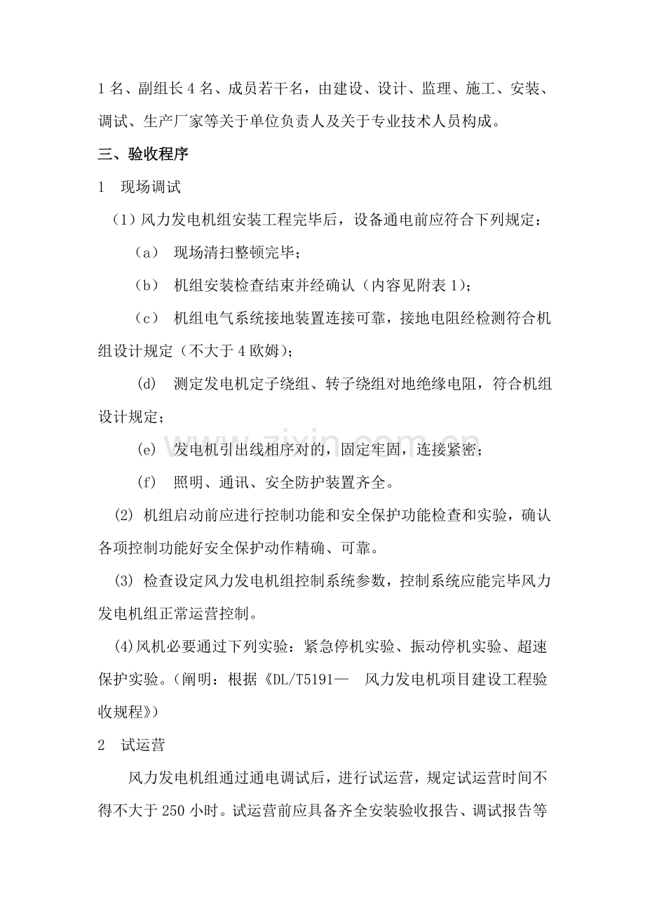 风电机组工程调试完毕后,建设单位组建验收领导小组,设组长1名、副组长4名、成员若干名,由建设、设计、监理、施工、安装、调试、生产厂家等关于单位负责人及关于专业技术人员构成。
