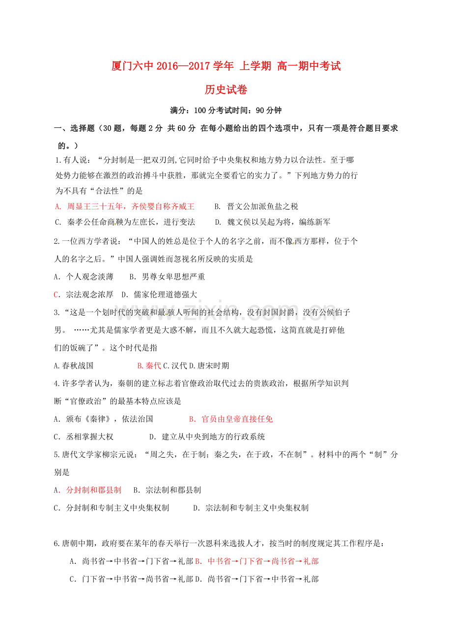 厦门六中2016—2017学年 上学期 高一期中考试