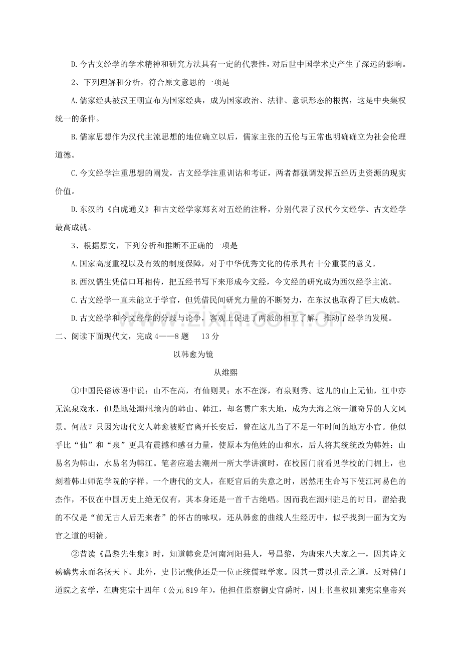 8、本文的标题是“以韩愈为镜”。从全文看,韩愈“镜”的作用体现在哪两个方面?请作具体说明。(4分)