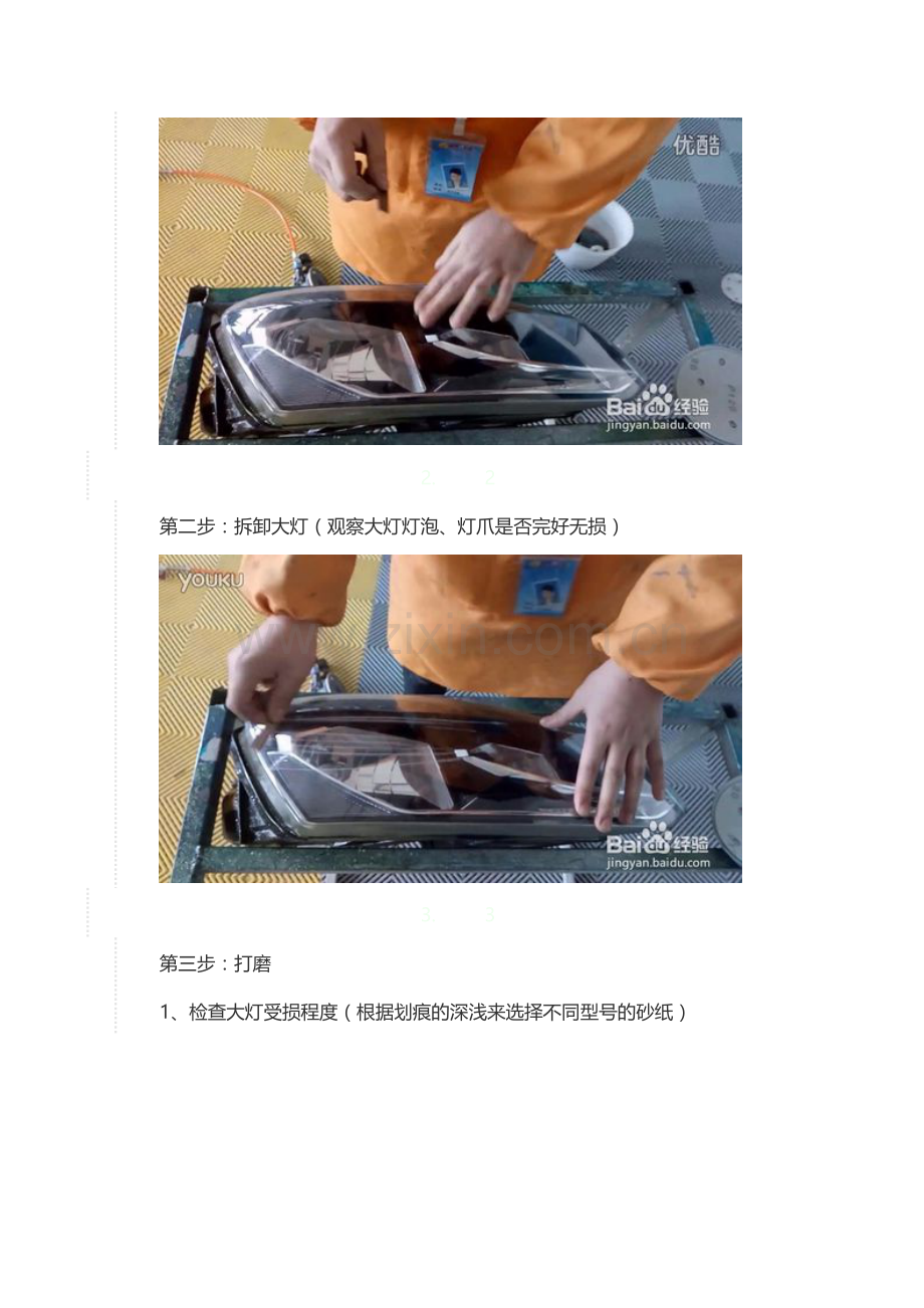 2、(注:此时用1500#或2000#先把大灯四周边角处及凹凸处都要打磨成亚光避免造成表面脱落现象)